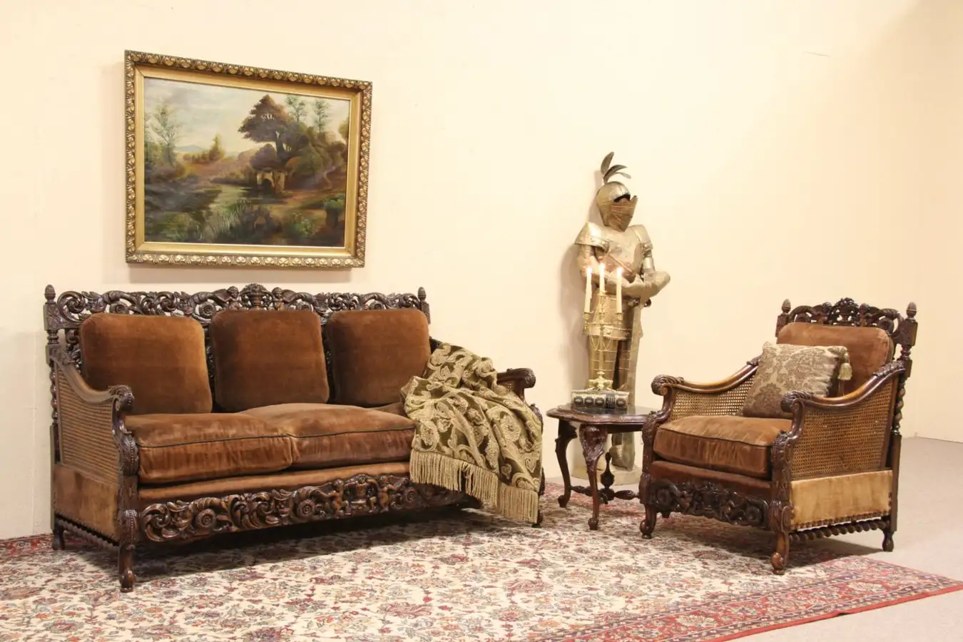 Waxed and polished, it needs only an occasional wipe with a soft dry cloth to maintain its antique patina and luster. There is a minor repair to one of the cane panels in the chair - see photos.