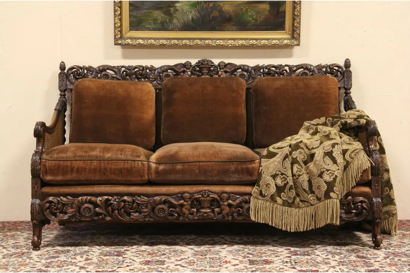 All original from about 1920, this sofa has a beautifully hand carved oak frame and three dimensional carved angels or cherubs. Original soft velvet upholstery is faded but has remarkably little wear as shown. The richly detailed solid oak has a very fine finish with expert detailing and barley twist columns. Waxed and polished, it needs only an occasional wipe with a soft dry cloth to maintain its antique patina and luster. We see no damage to the cane panels.
