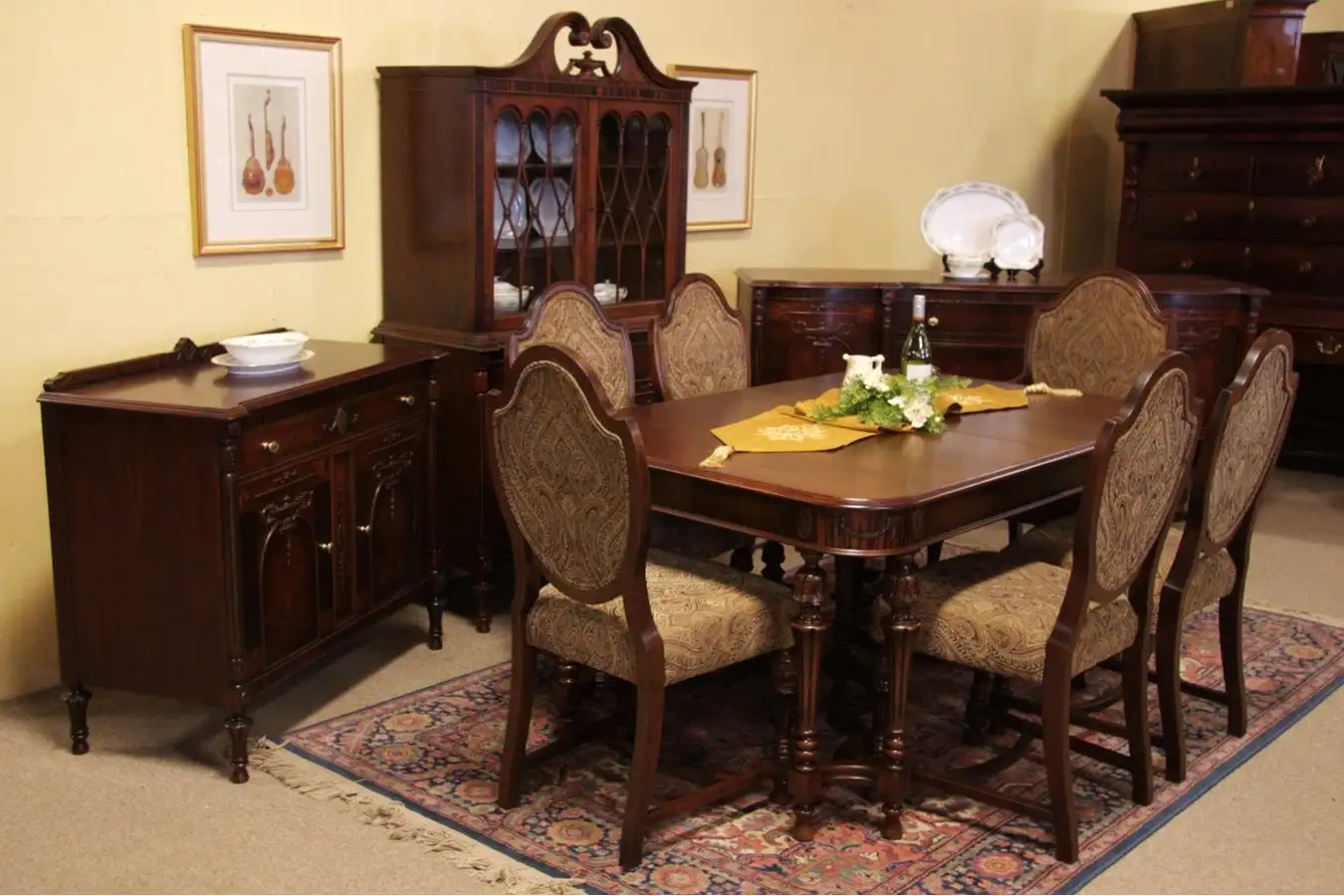 Harmonious and graceful carving adorns this 10 pc. dining set, consisting of 6 chairs, table and 2 leaves, china cabinet, sideboard and huntboard. Made of walnut with burl and rosewood accents, the finish is in excellent condition. Expertly crafted about 1925, this impeccable antique furniture has fluted legs and understated detailing.