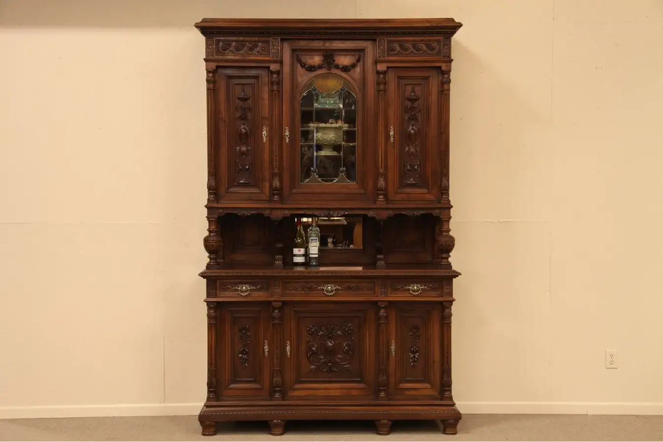 A magnificent Victorian cabinet was hand-carved in high relief, and has leaded stained glass doors with jewels. The artistry in walnut hardwood is outstanding, the original finish is very fine with warm patina, and the top surface has been revarnished.