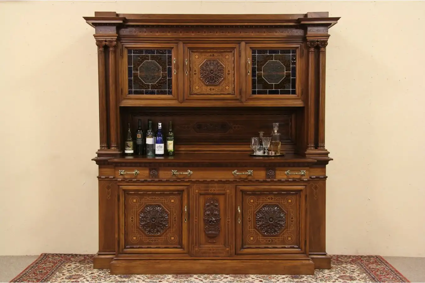 Masterfully carved about 1900, this marvelous back bar or server has stained glass, fluted columns, original bronze hardware and bold architectural lines.