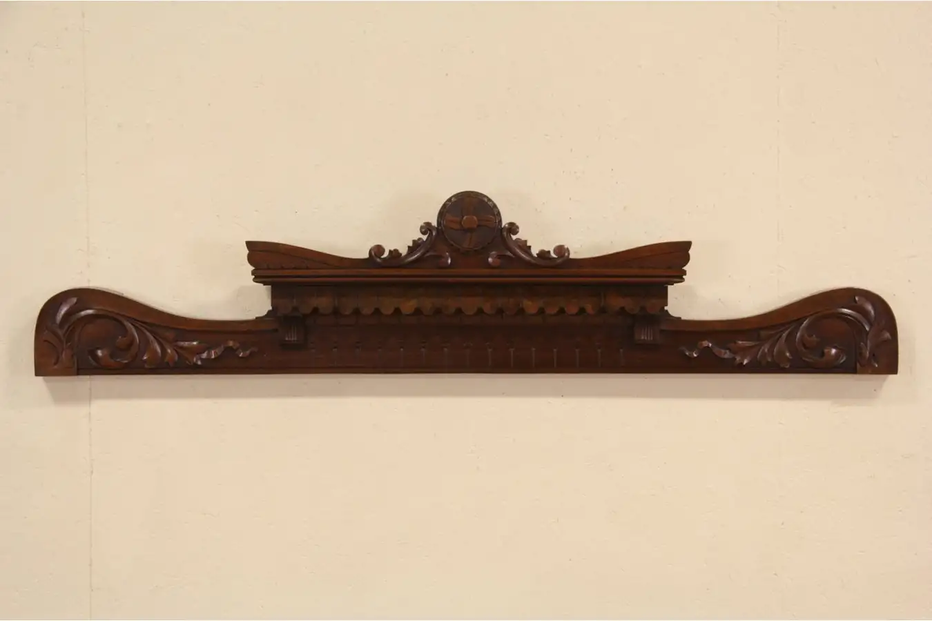 This architectural salvage fragment is a crest, hand carved of walnut and burl about 1875. The original finish is very well preserved, waxed and polished so only an occasional wipe with a soft dry cloth is needed to maintain its warm patina.