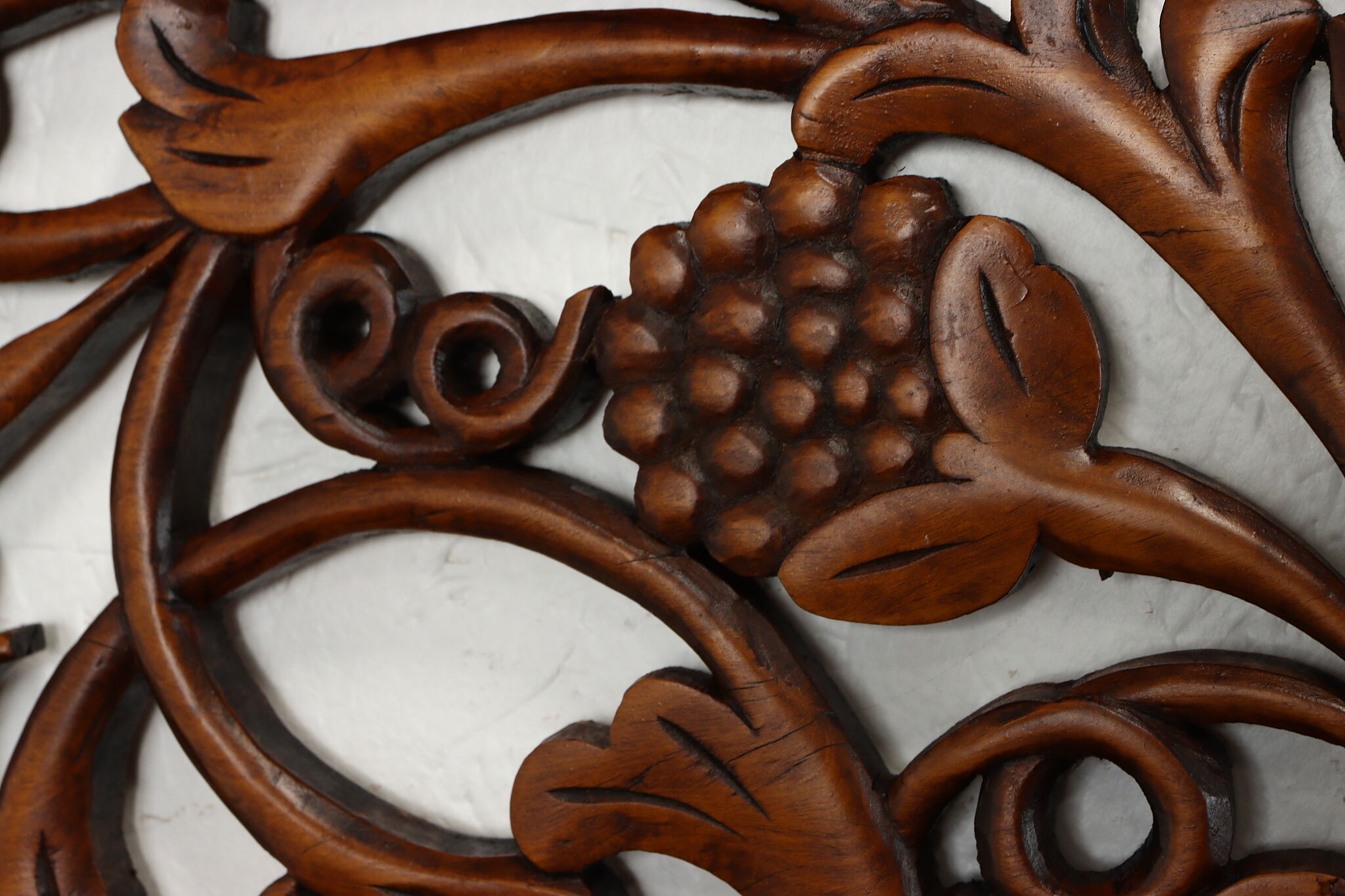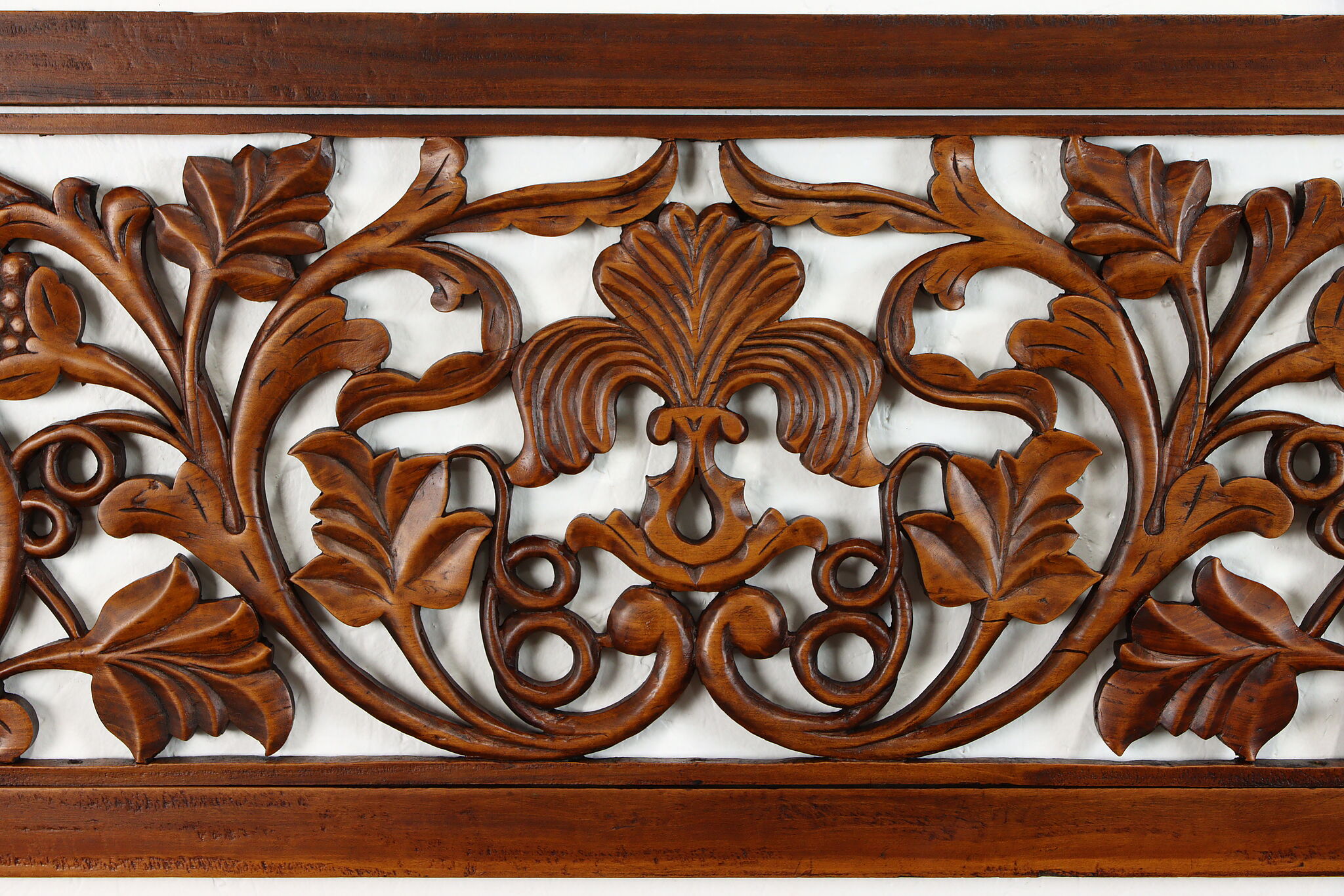 A carved Asian mahogany hanging panel or screen is an architectural fragment with vines and birds.