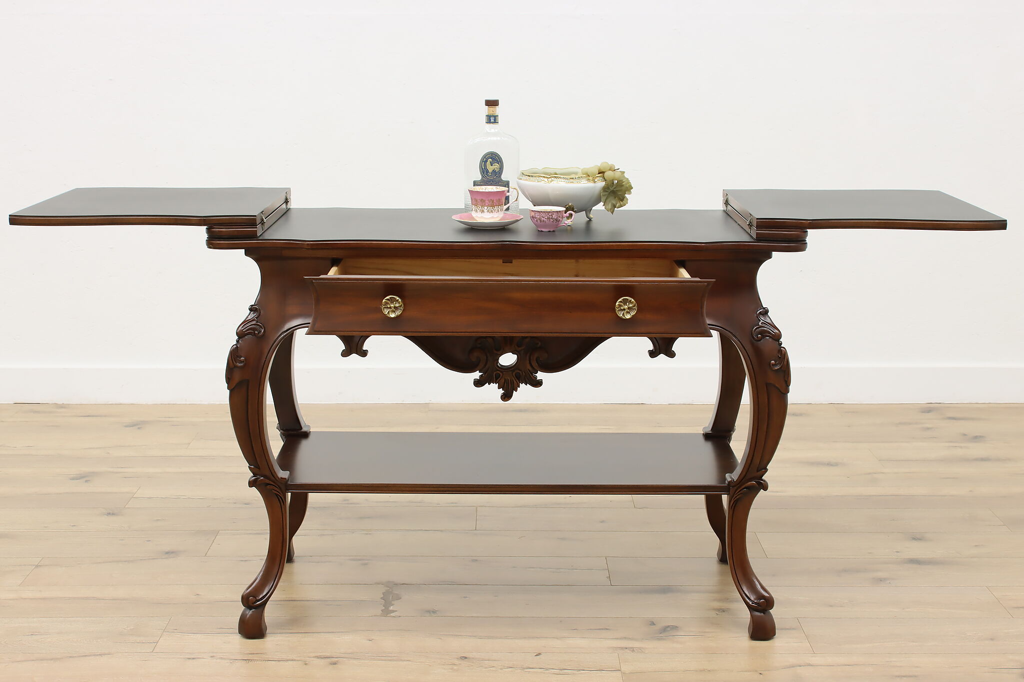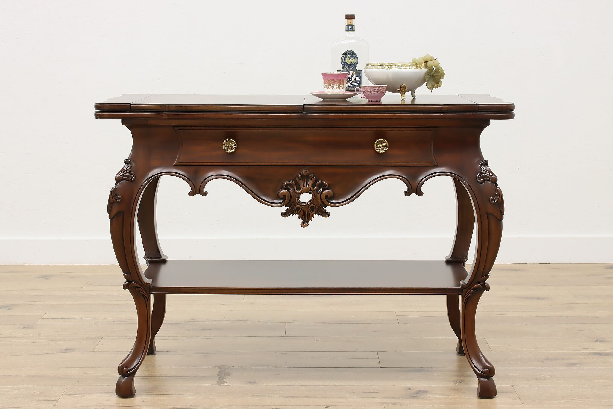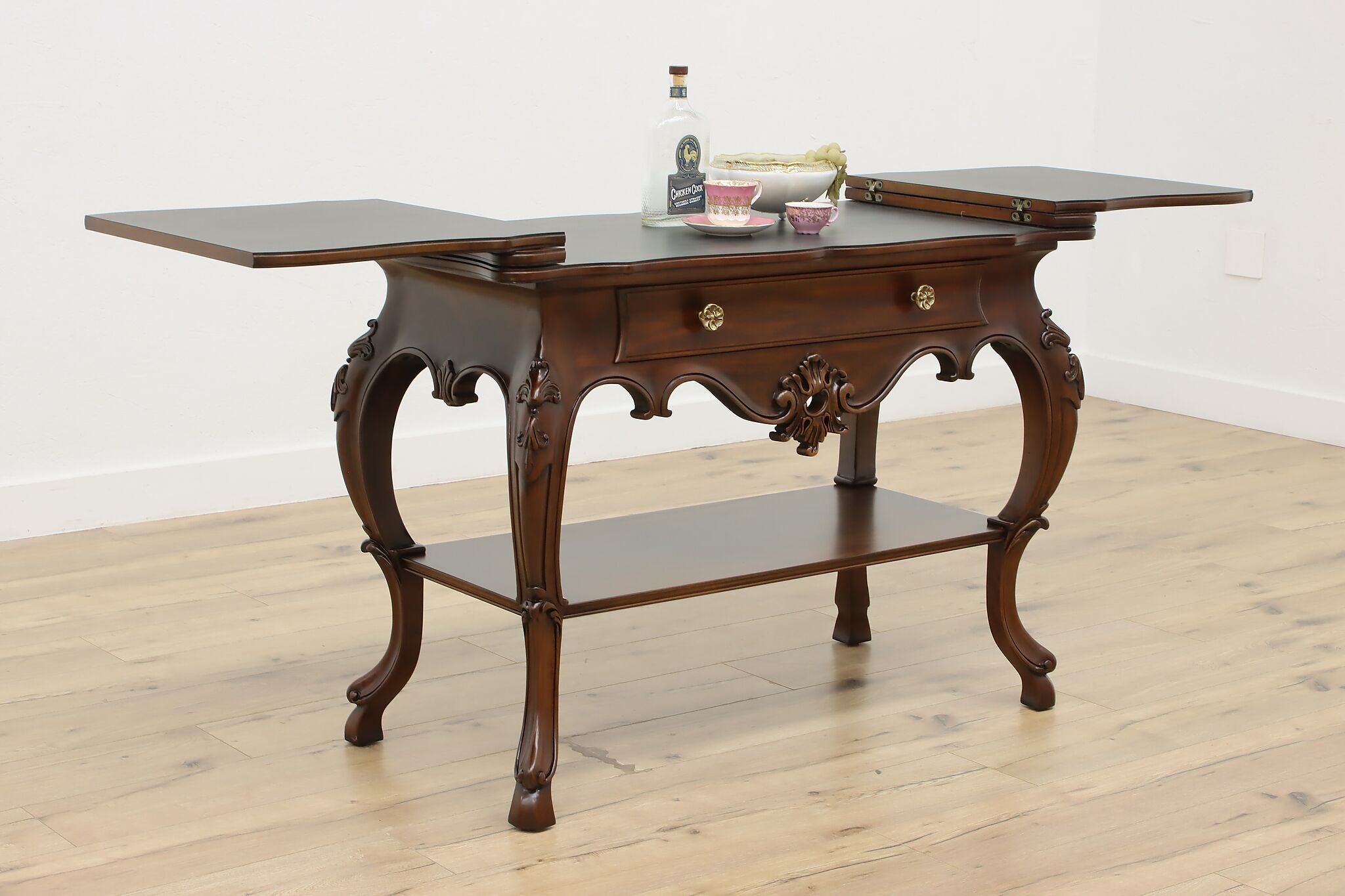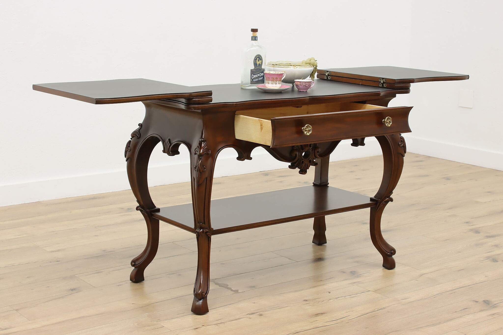 This gorgeous French design console has a flip top with a laminate surface to serve guests appetizers and drinks.