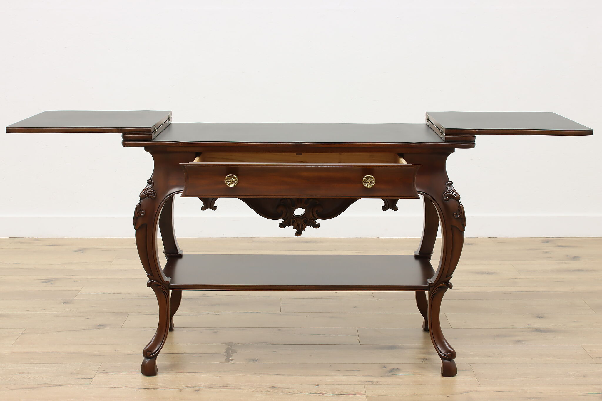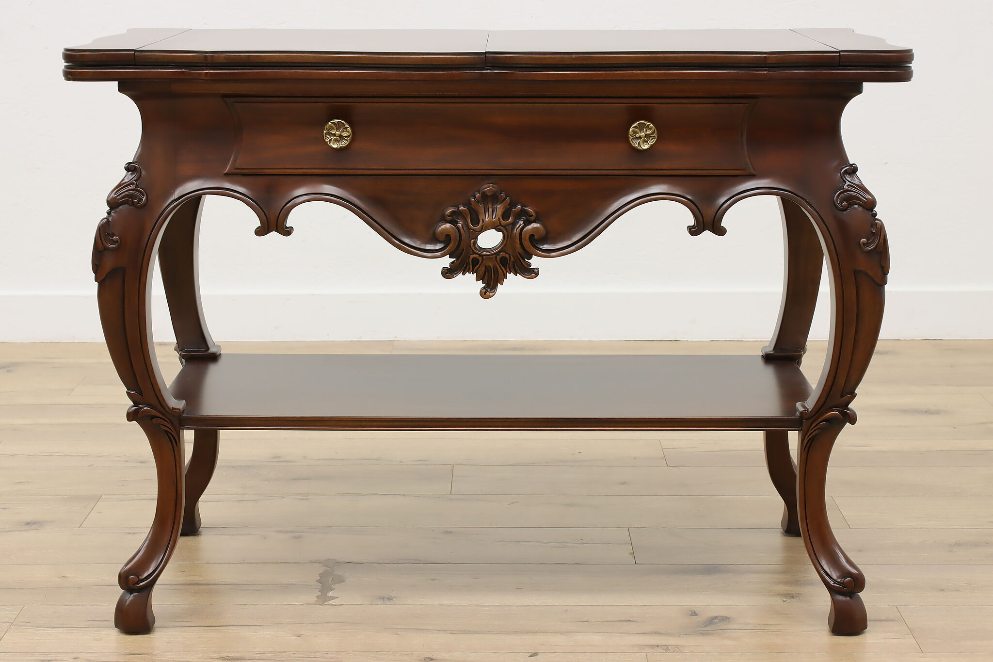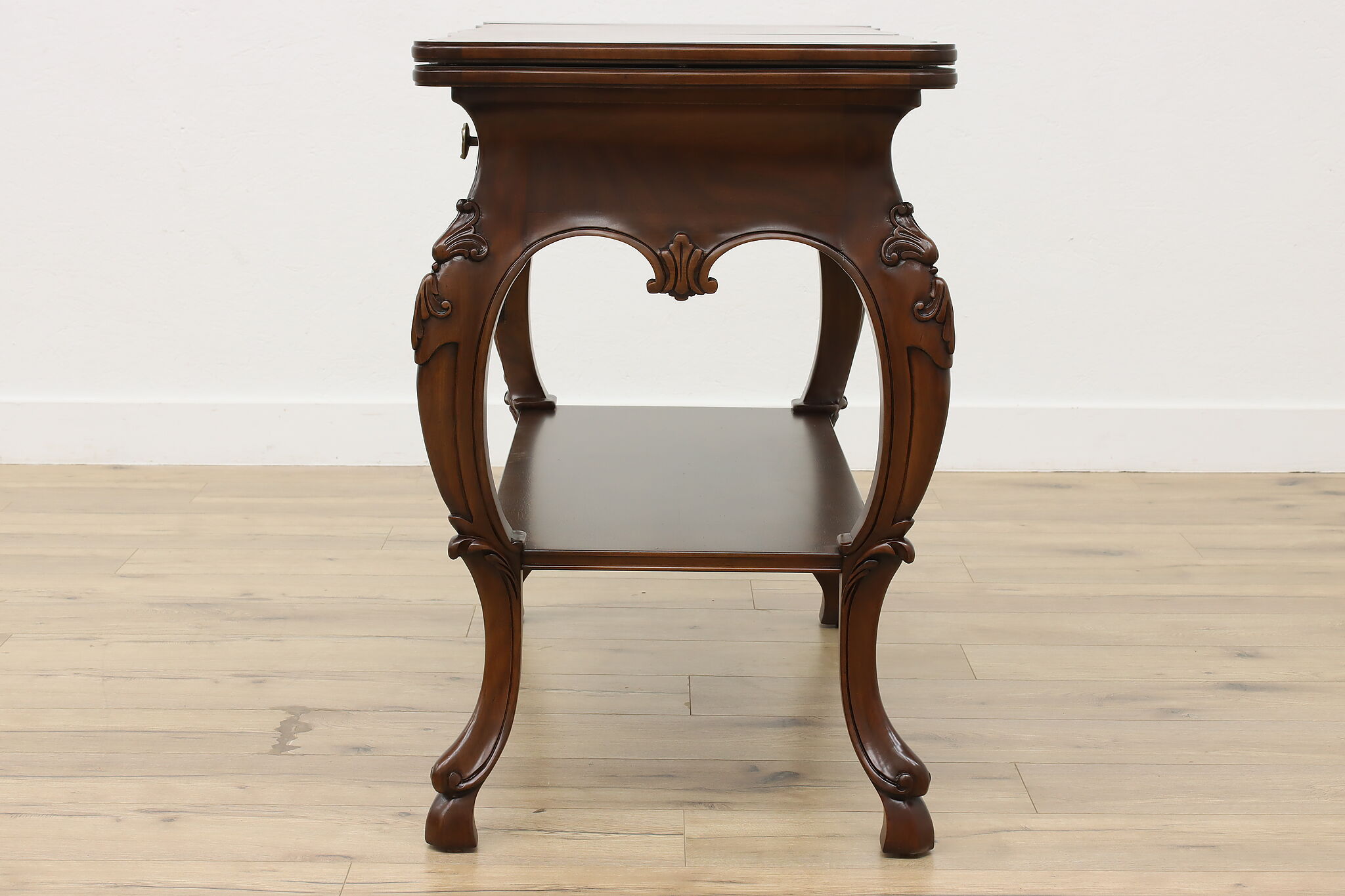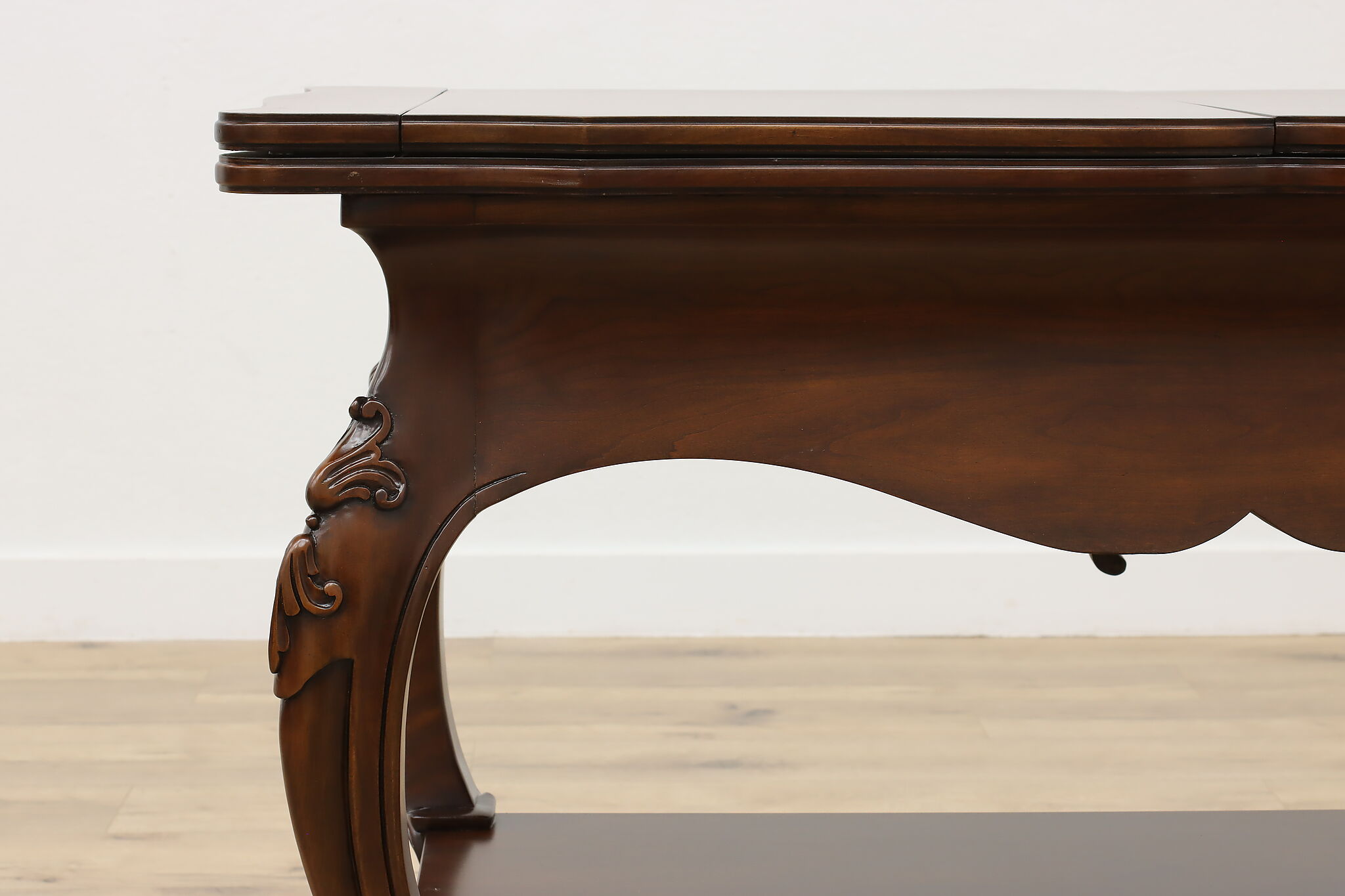 This gorgeous French design console has a flip top with a laminate surface to serve guests appetizers and drinks.