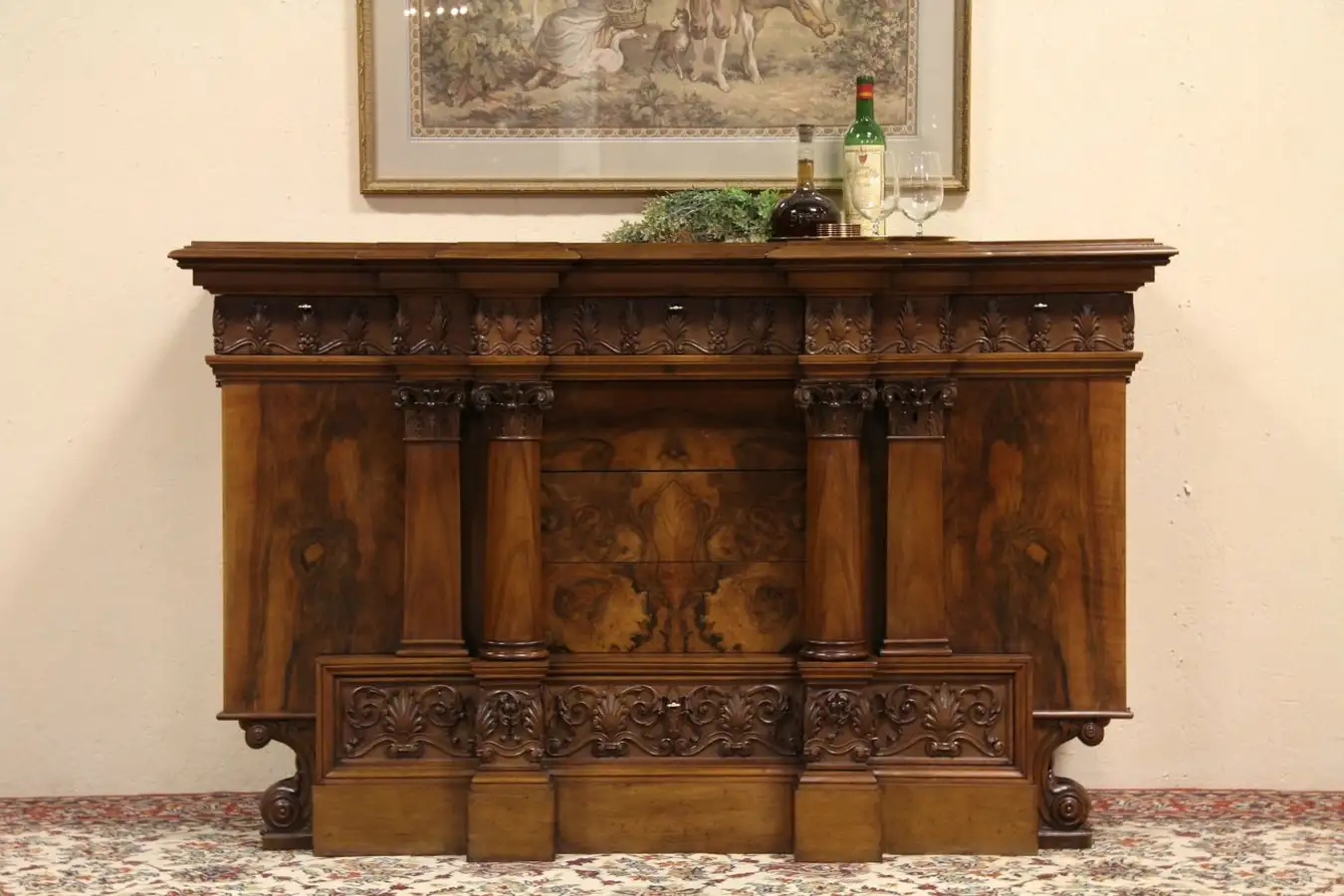 Palatial furniture in classical style, this hall console or server was hand carved in northern Italy about 1920. Solid walnut and cherry with matched burl panels, this imposing antique is in exceptional condition and remarkably well crafted.