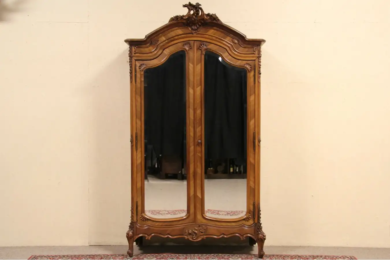 This splendid armoire was hand carved about 1900 in France, and has original shaped and beveled mirror doors.