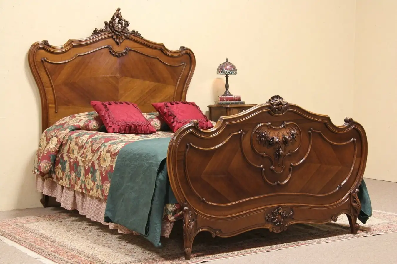 Gracefully hand carved of walnut about 1900 in France, this bed has steel rails that fit a queen size mattress as shown, we will change to full size if desired.