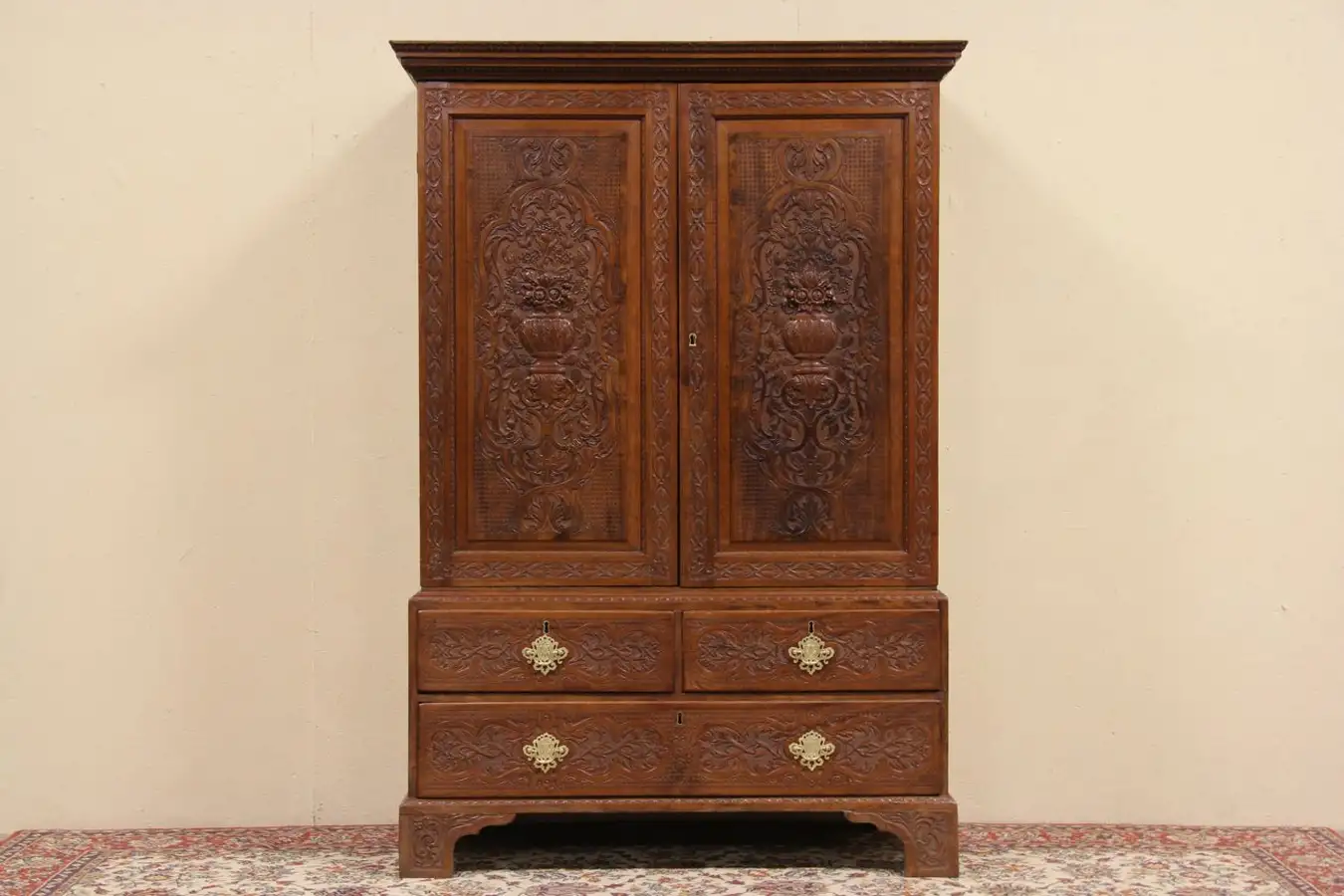 High relief artistry has a very fine old finish with warm patina on this furniture from England. Drawers have hand cut dovetails on fine grain oak sides, the paneled back is also oak. Brasses appear original, the door lock does not work, the key is a handle only.