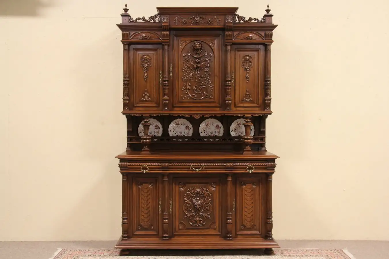 A lion head presides over this monumental court cupboard, probably part of a dowry, made in France about 1890.