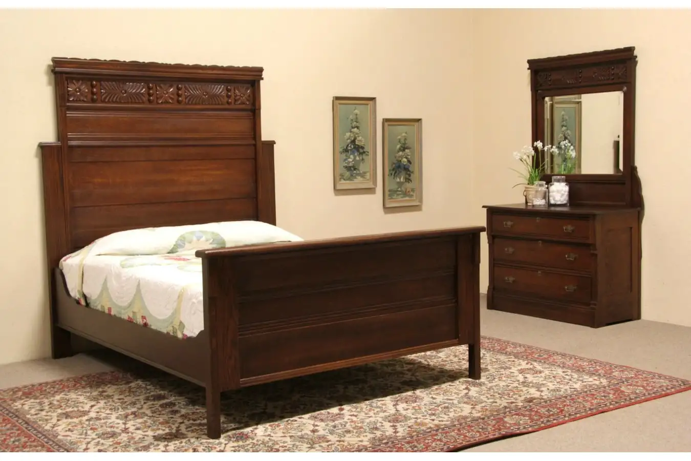 A boldly scaled solid oak bedroom set from about 1895 includes a queen size bed and chest or dresser with swivel mirror. The deep rich finish is in excellent condition on this American made antique furniture.