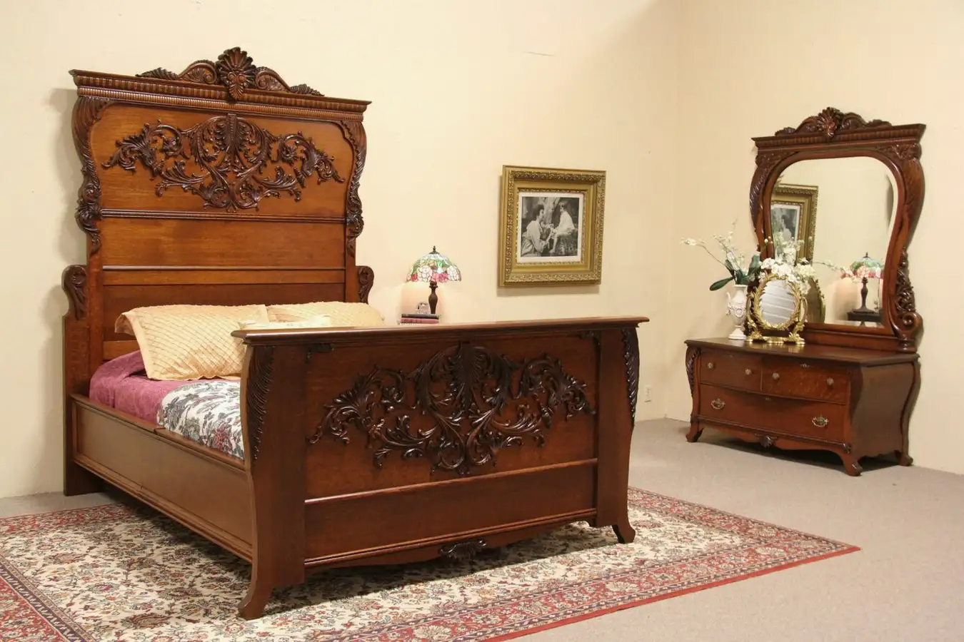 A magnificent two piece 1900 Victorian era queen size bedroom set was carved of solid quarter sawn oak. Both pieces have a rich brown finish in excellent condition.