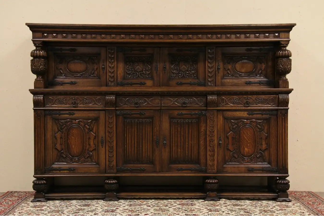 Magnificently hand carved about 1900 of solid oak, this Renaissance design "court cupboard' cabinet was probably part of a bride's dowry.