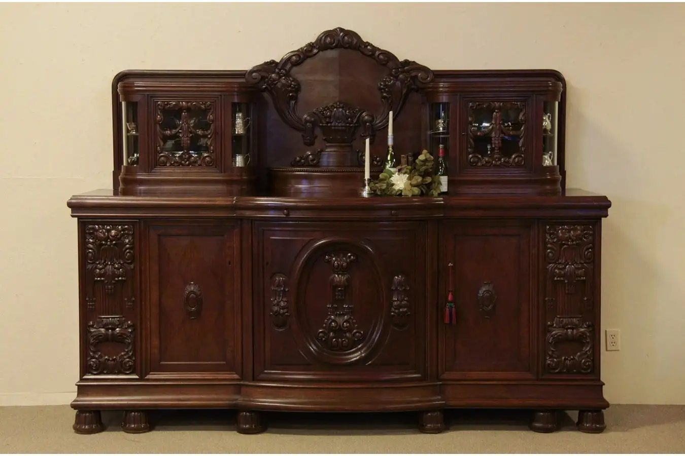 Hand-carved of oak about 1915, this substantial oak back bar or sideboard has curved glass display cabinets on top. Wonderfully constructed, there are hand dovetailed drawers inside, plus a large pull-out serving shelf. The center door is curved, and all three doors are supported on solid brass piano hinges.