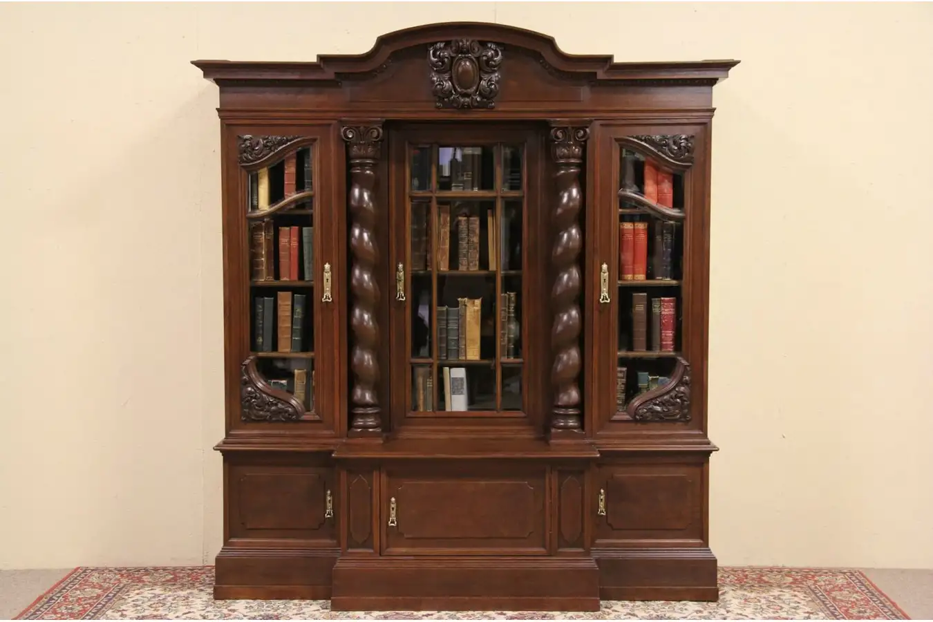 A spectacular oak triple bookcase was hand crafted in Germany about 1900, with spiral columns and beveled glass doors. Entirely hand carved in high relief, the artistry of this palatial furniture is masterful.