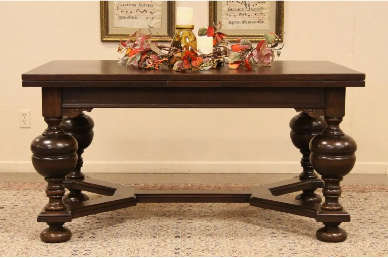 This historic furniture recalls Renaissance English design from the era of Henry VIII, and dates from about 1900. The rich satiny finish is superb with warm antique patina. There are stately moldings and carved details, the trestle base supports 4 large dramatically turned legs.