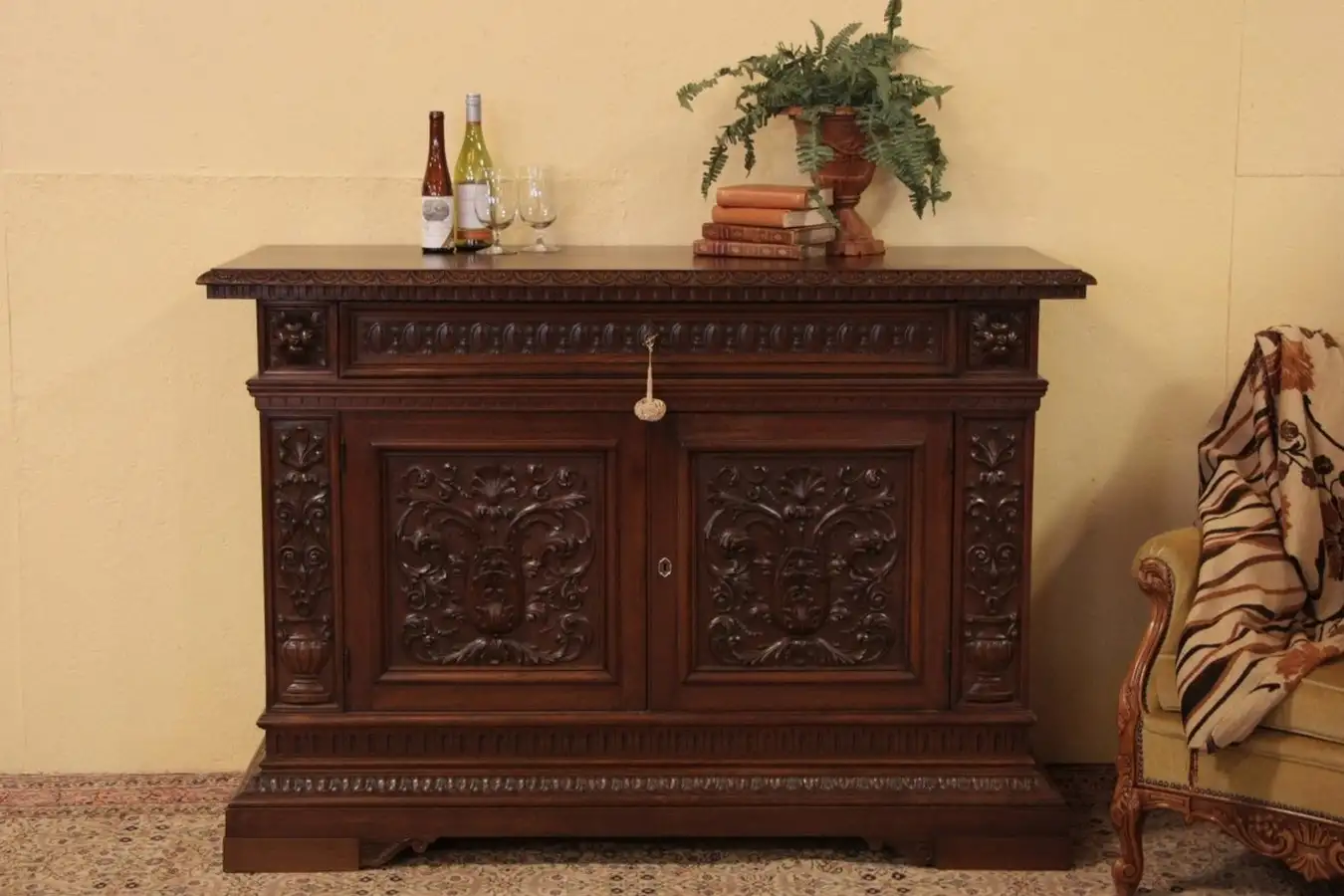 This large and dramatic sideboard, credenza or dresser has magnificent artistry, and is expertly hand carved of solid walnut in Renaissance design. Deep moldings and bold scale are executed with architectural proportions. Sublime subtlety of the carver's art is expressed with intricate detail in high relief against a hammered background.