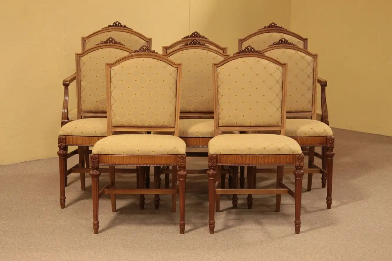 There are two armchairs, note repairs to arms and six side chairs with beautiful upholstery. The chairs are 20" wide, 38" tall and 17" deep. The seat is 18" from the floor. Matching pieces are sold separately.