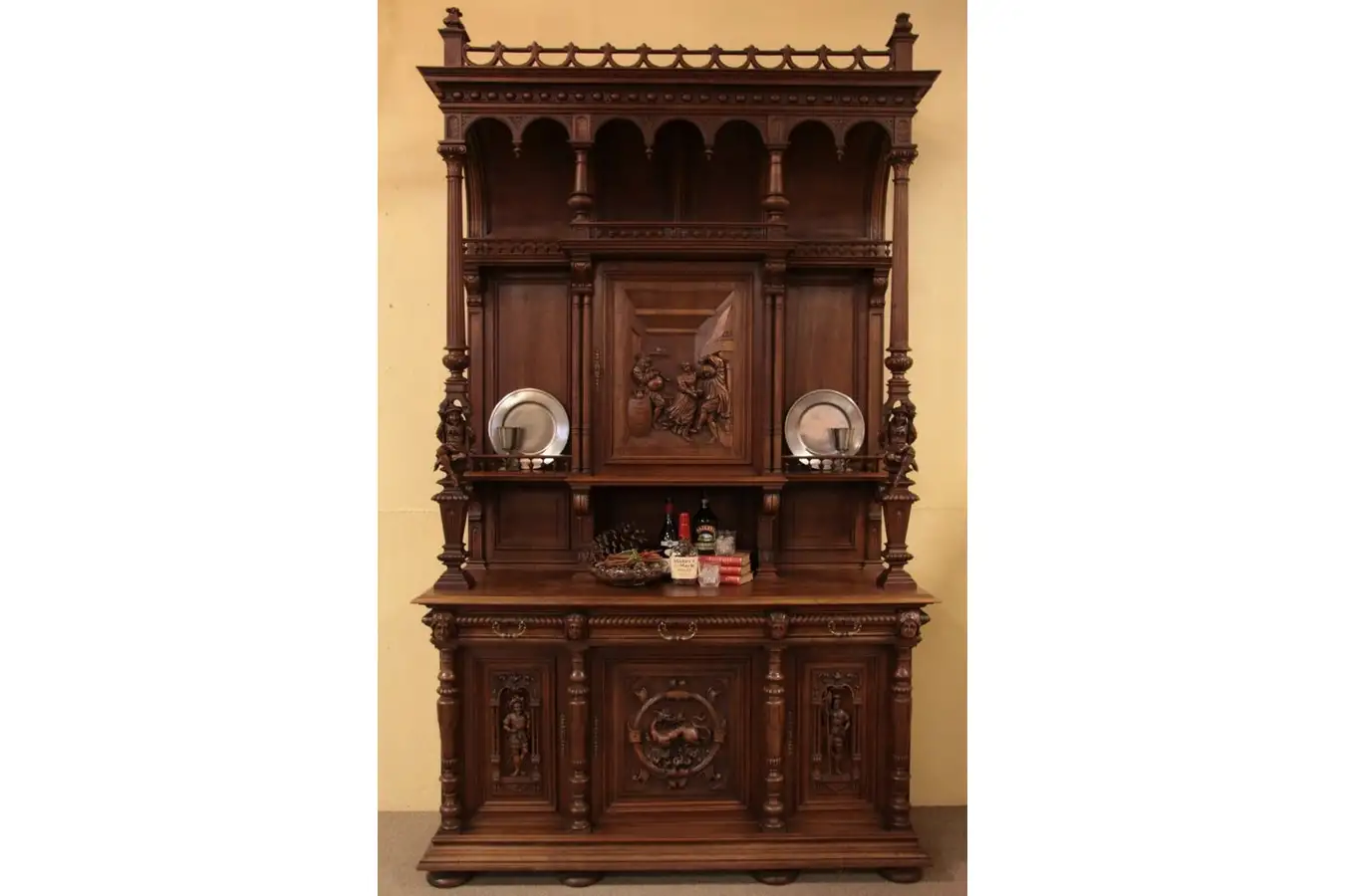 Incredibly well carved of walnut in the 1890's, this Jester cabinet celebrates the role of a royal jester, the only member of the court who could say anything and speak honestly to a king without fear of retribution. The quality, realism, and detail of the stellar carving is shown in jester figures, heads, a dragon and a wine cellar dancing scene with perspective.