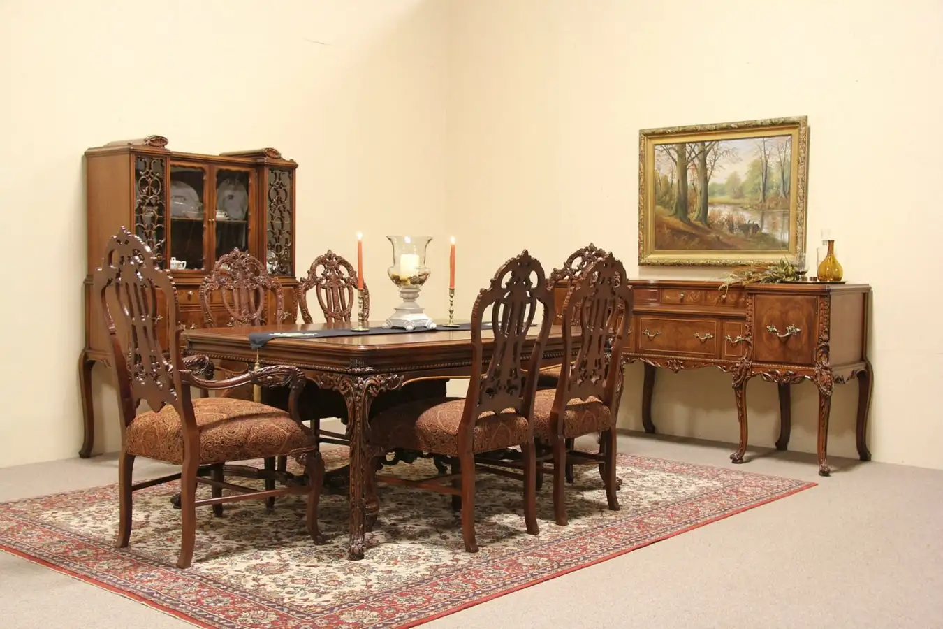 An elegant dining set from about 1950 is richly carved and pierced. The gleaming finish on walnut wood and matched burl is accented with delicate inlaid marquetry. Embossed brasses are original and all pieces have opulent details. American made vintage furniture, construction is outstanding and frames are tight and strong.