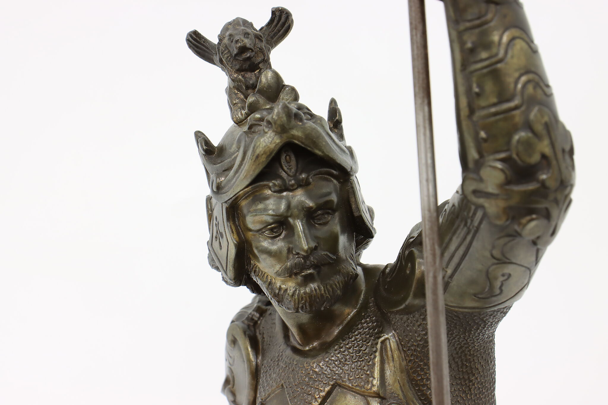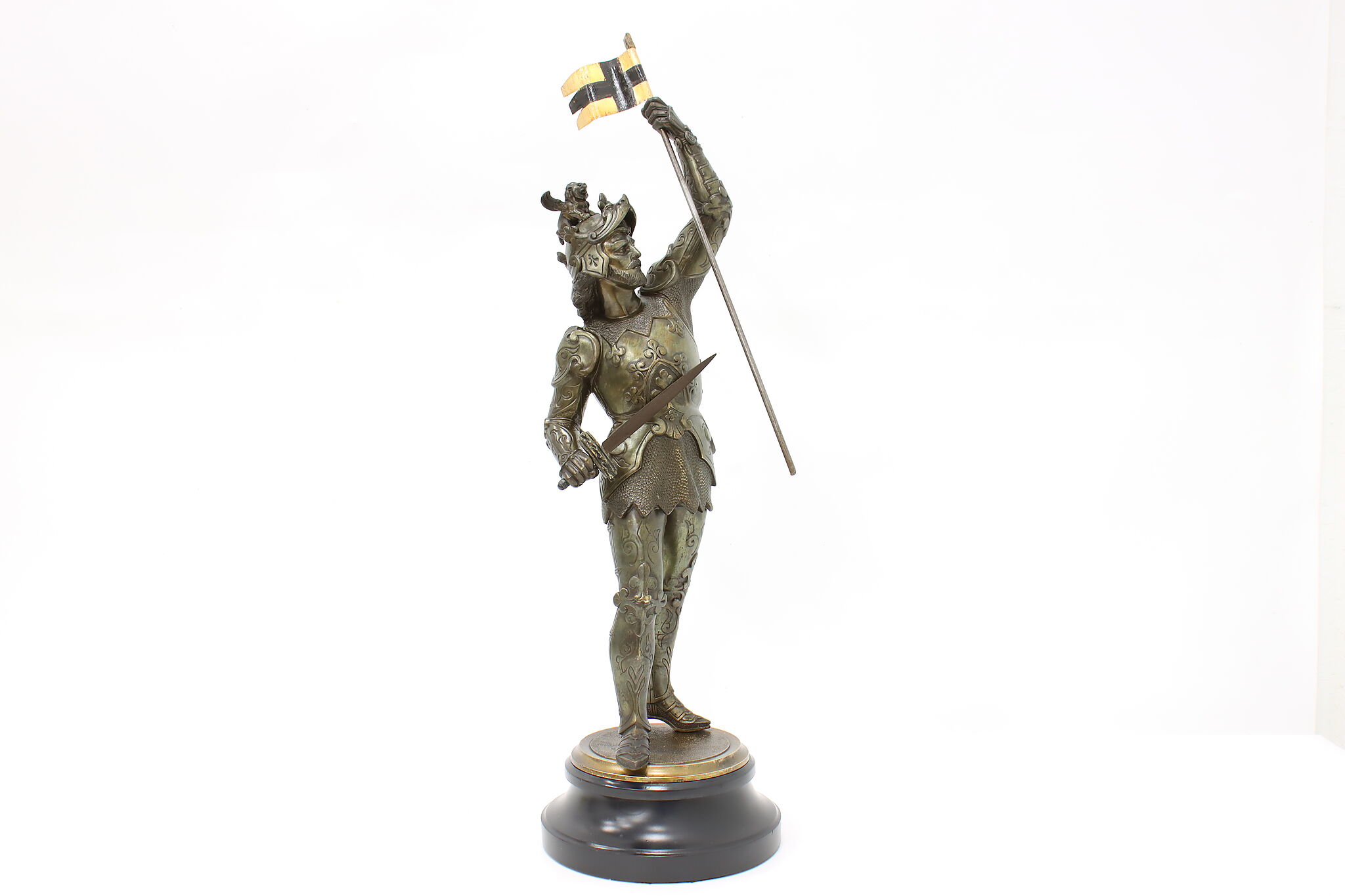 A finely detailed sculpture is of a cavalier wearing a suit of armor and helmet with his flagstaff and sword.