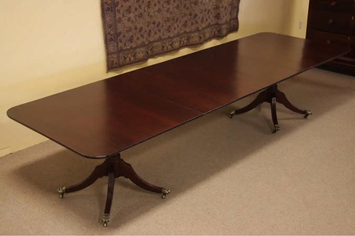 Wide planks of solid mahogany form the top, there are 2 solid mahogany pedestals with cast brass paw feet and wheels. The gleaming silky finish is excellent, and the modern replaced slides open and close smoothly. Two original 27" wide leaves fit very well, and there is a rebuilt apron or skirt around the table and under the leaves. The highly figured grain has natural irregularities that give this antique furniture great patina.