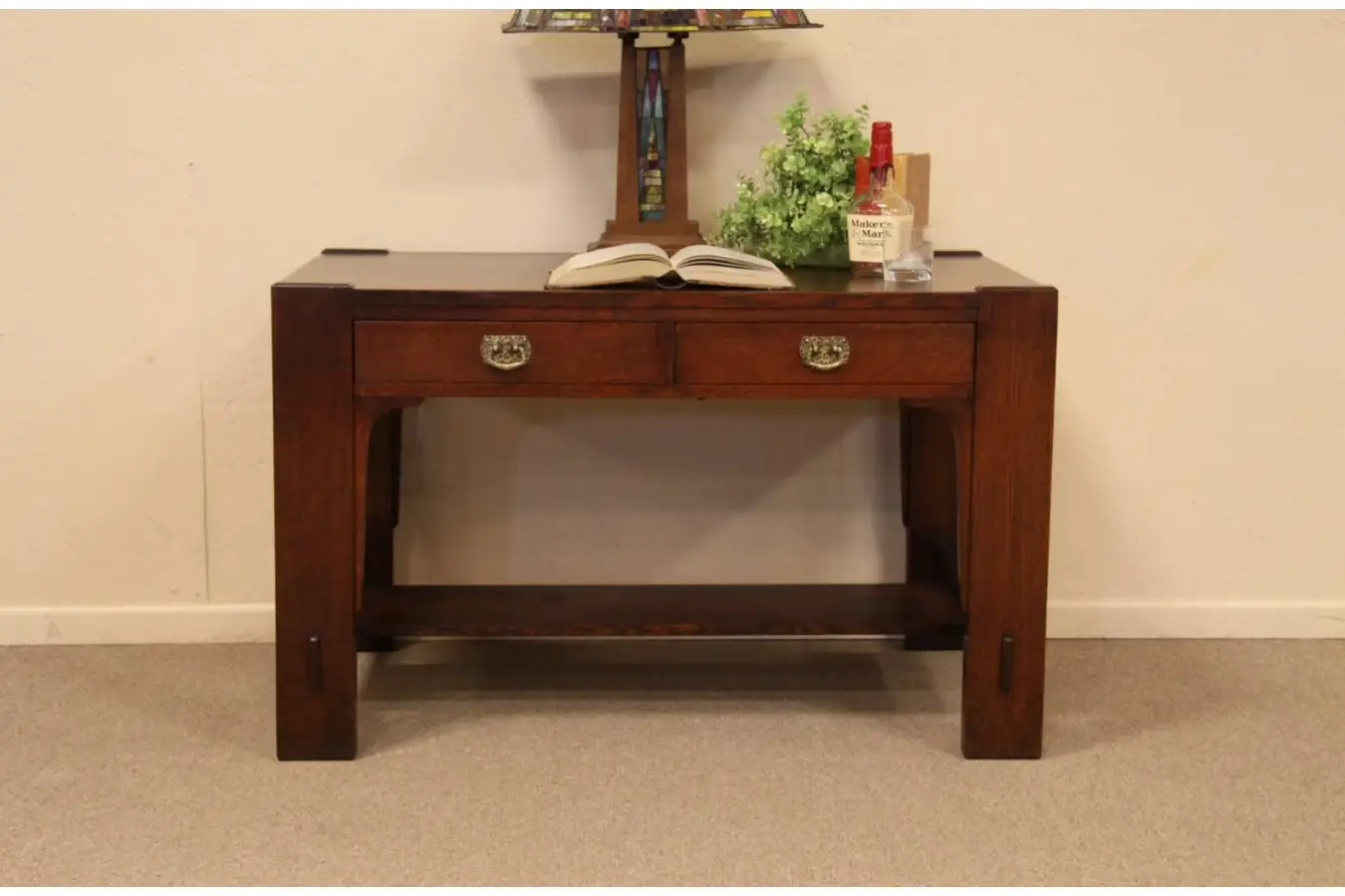This is authentic well proportioned American furniture from the early 1900's. The signature in the right drawer is worn, it reads "Stickley and Brandt Chair Co., Binghamton, NY, Charles Stickley, Gen. Mgr." and dates this historic desk to 1909-1913.
