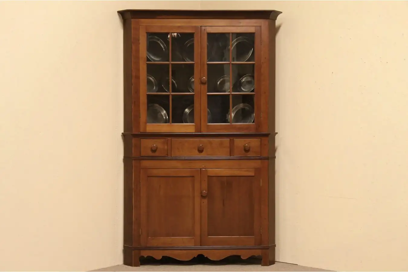 This solid cherry corner cabinet from about 1840 has wonderful old glass panes, some more wavy than others. We were told it is from Pennsylvania, but no provenance was given to us.