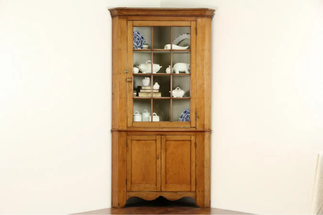 Said to be from Ohio, this 1840's cherry corner cupboard or cabinet has old wavy glass panes. The old finish is in very fine condition on this finely crafted American country furniture.