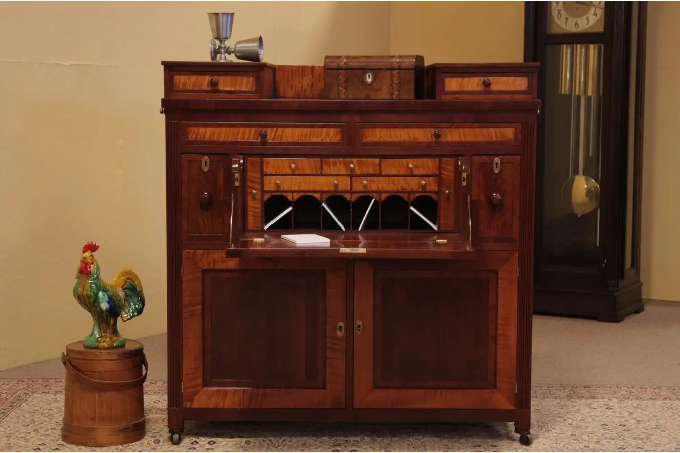 We have never seen another New England Sheraton antique like this - a combination "butler's" desk and sideboard or server in glowing cherry and mahogany accented with shimmering "tiger" maple.