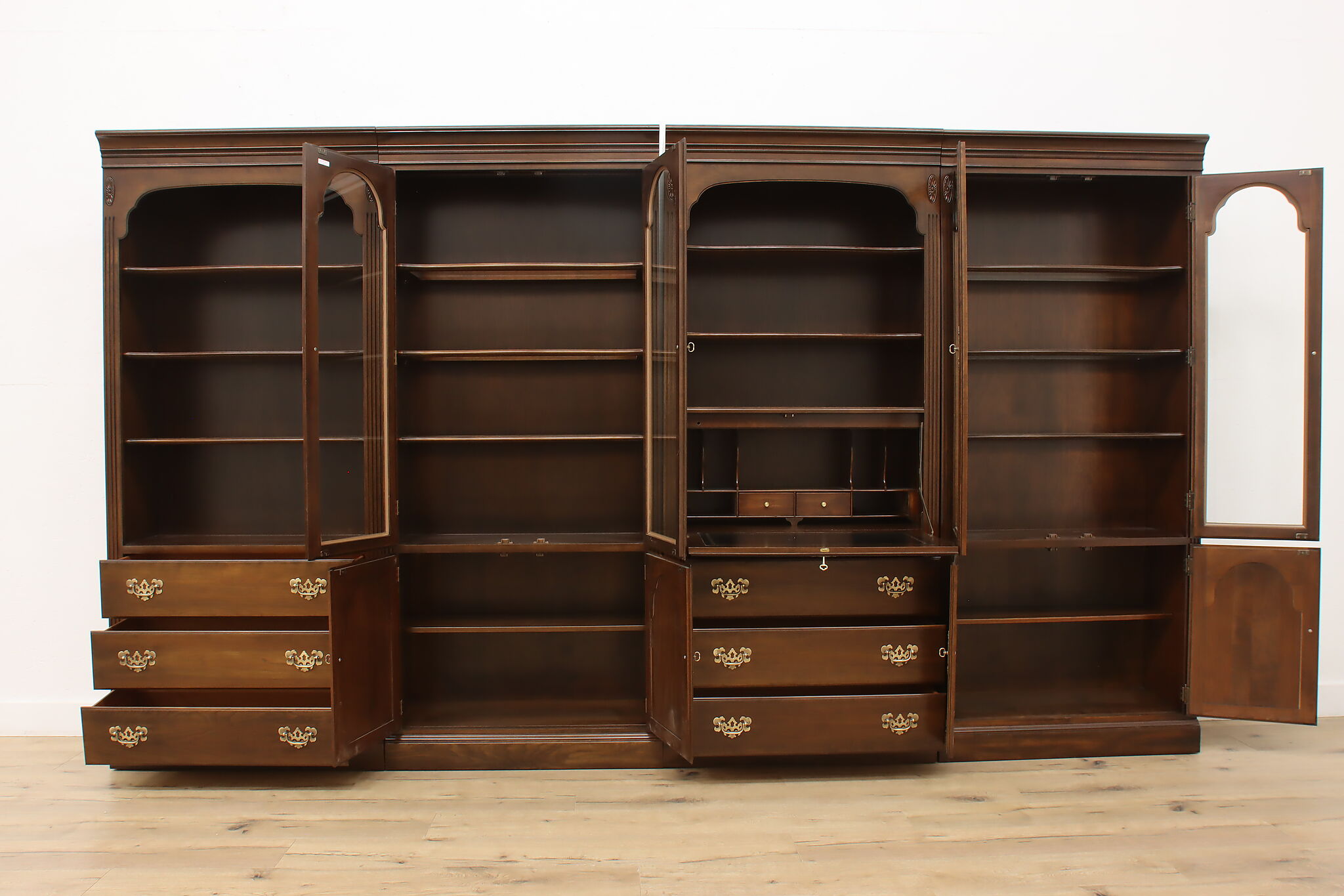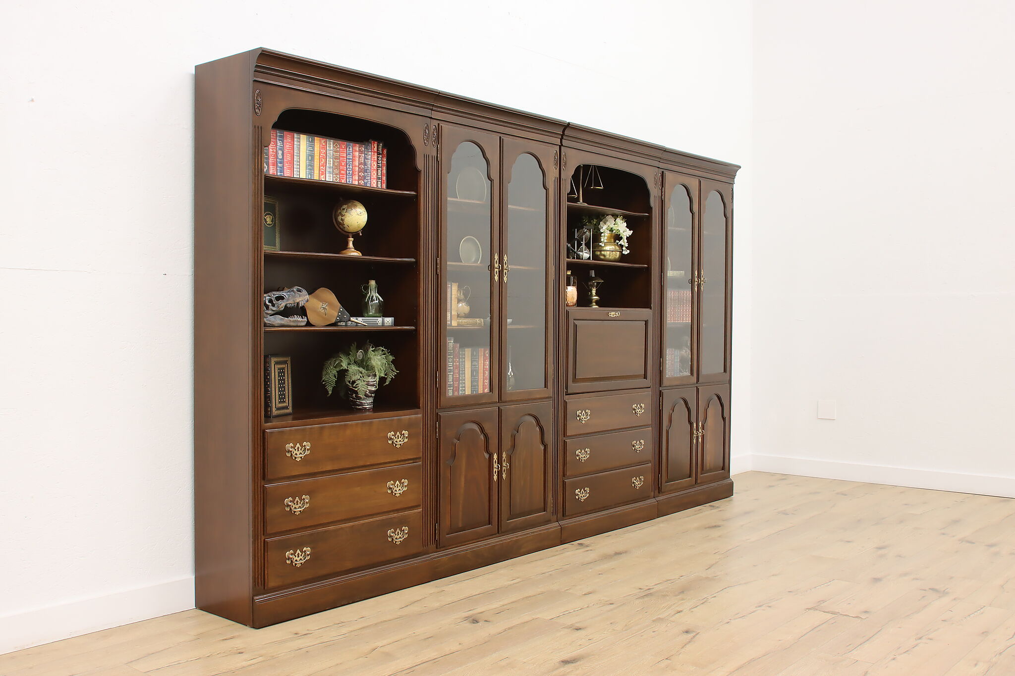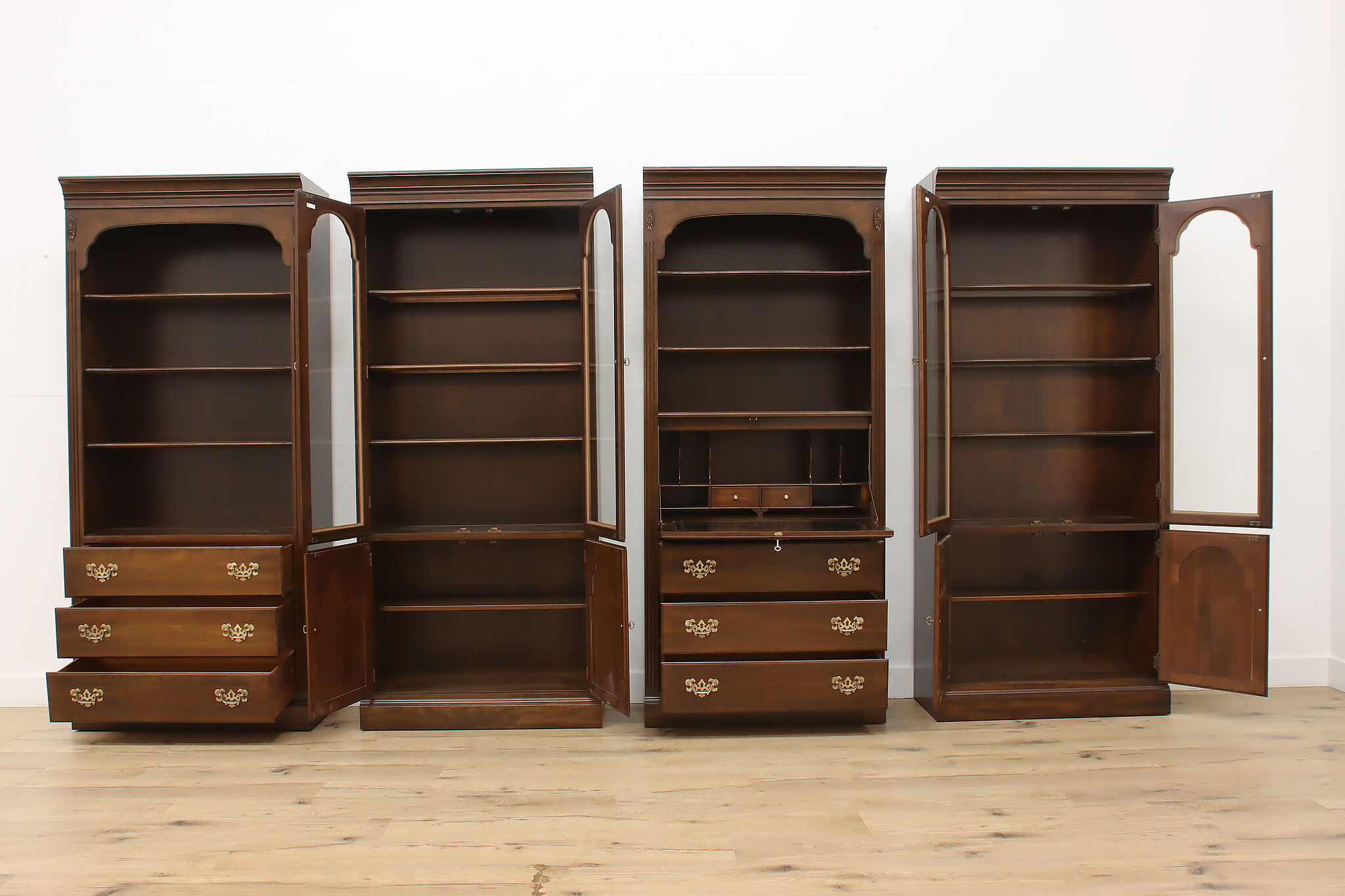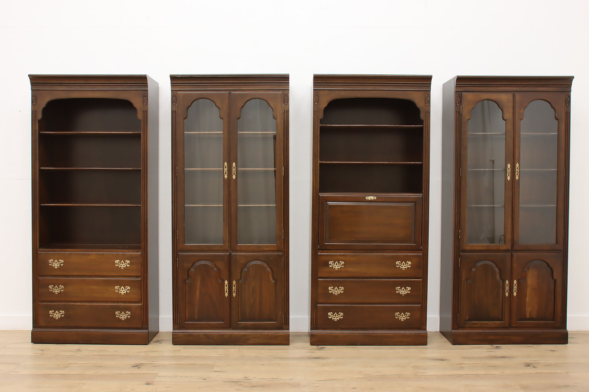 Arrange this four piece Georgian design office or library bookcase wall unit to best suit your needs! Each piece could even be used in separate rooms for trinkets, liquor, or trophies!