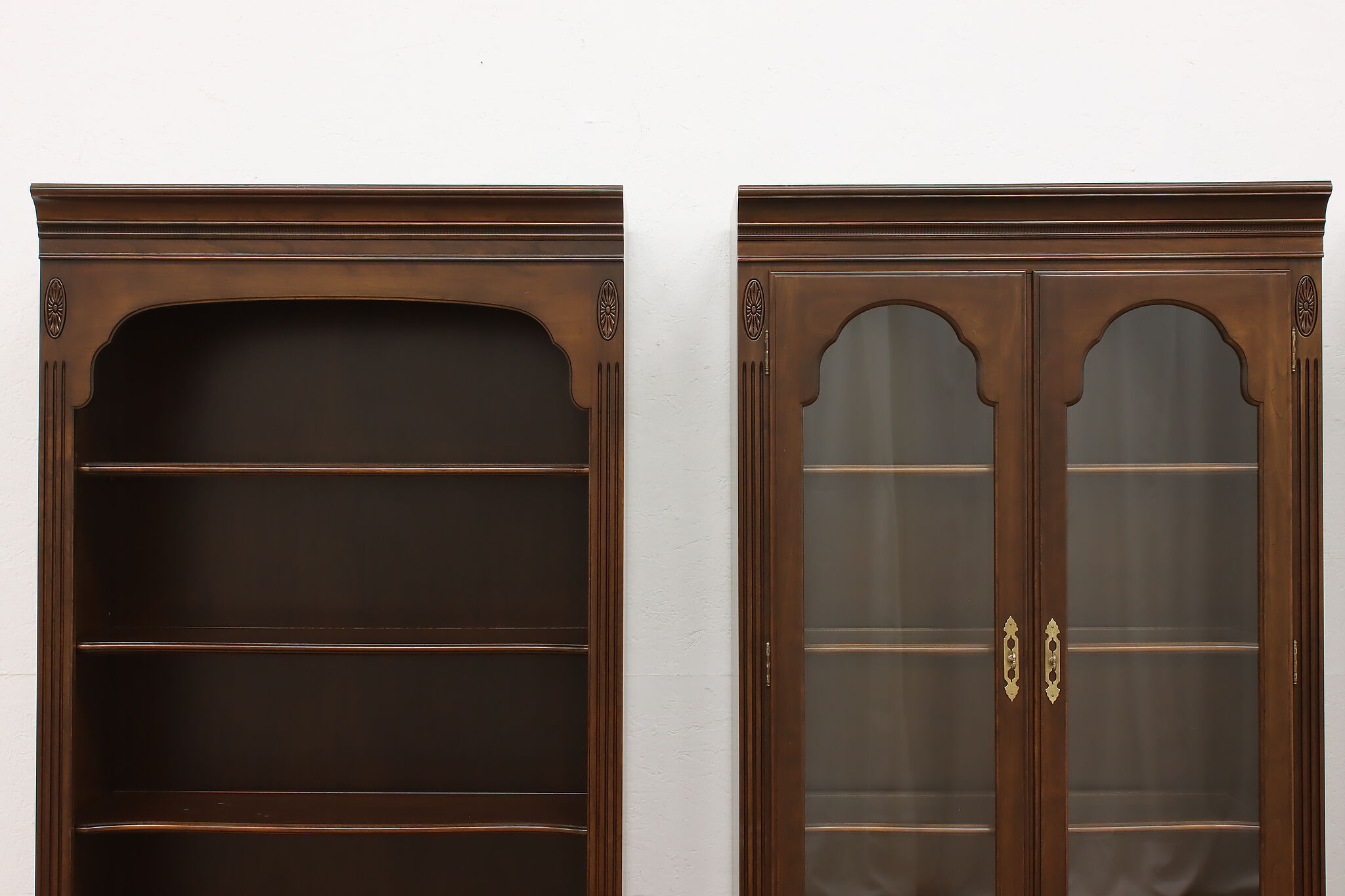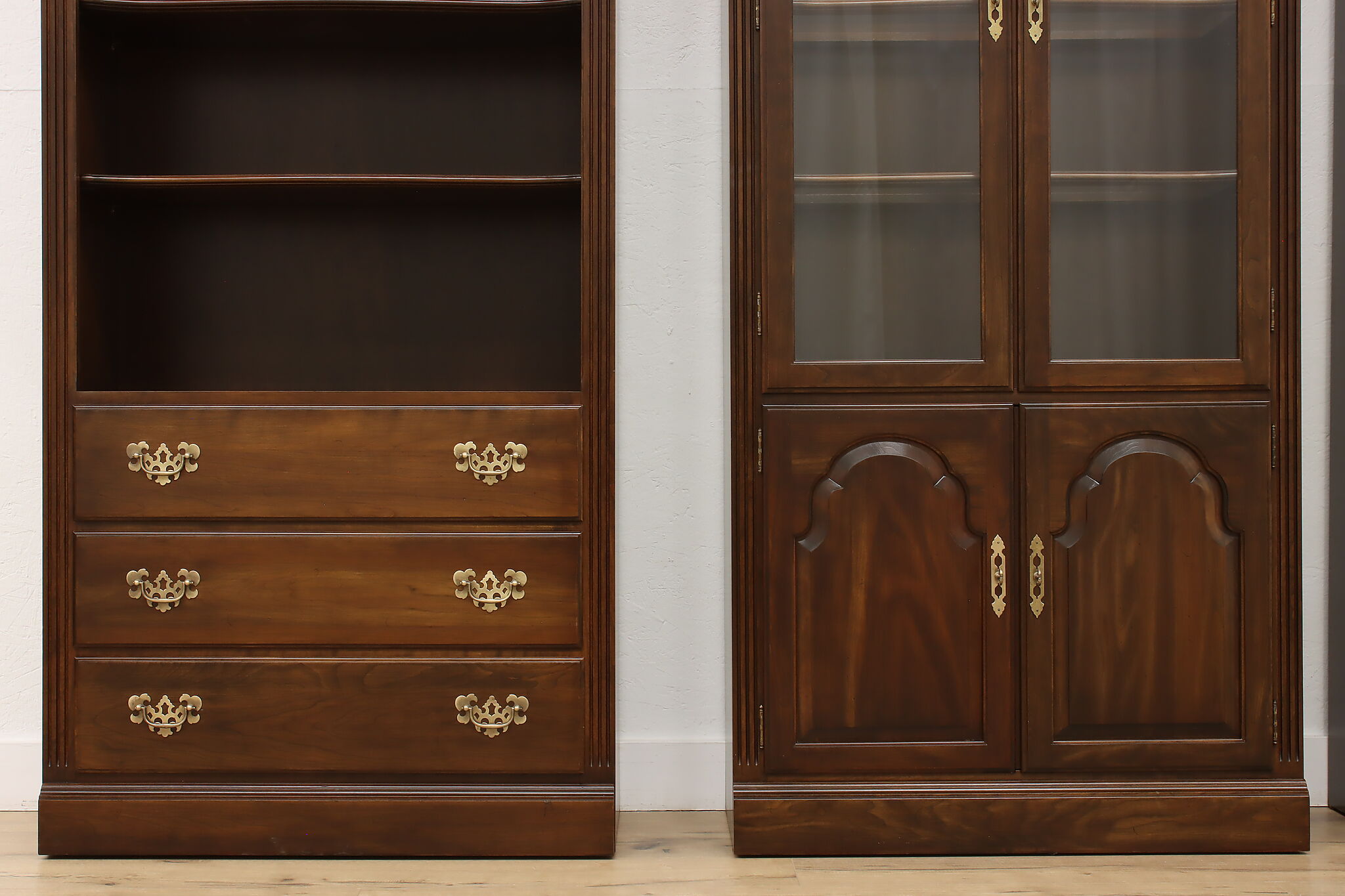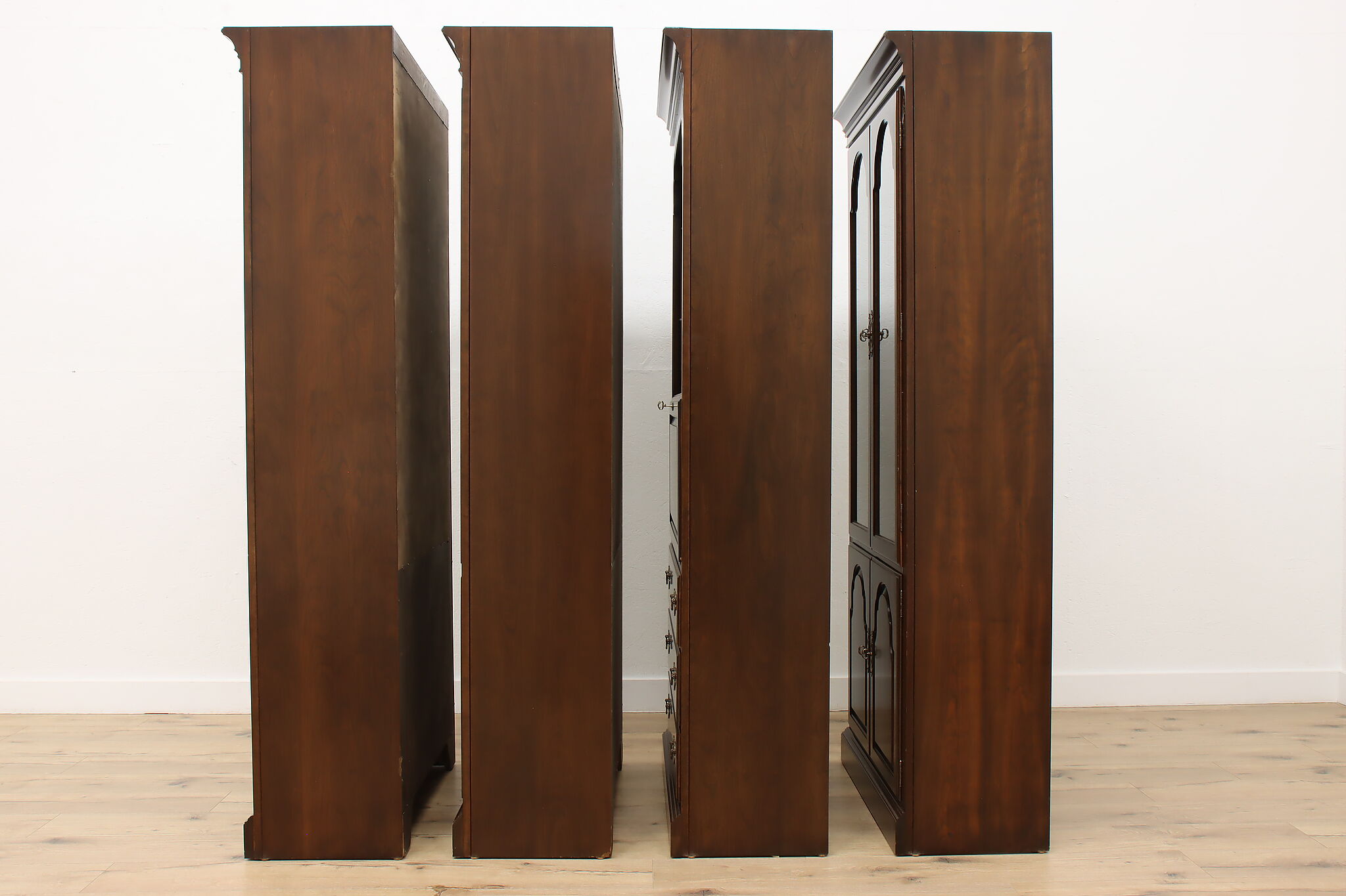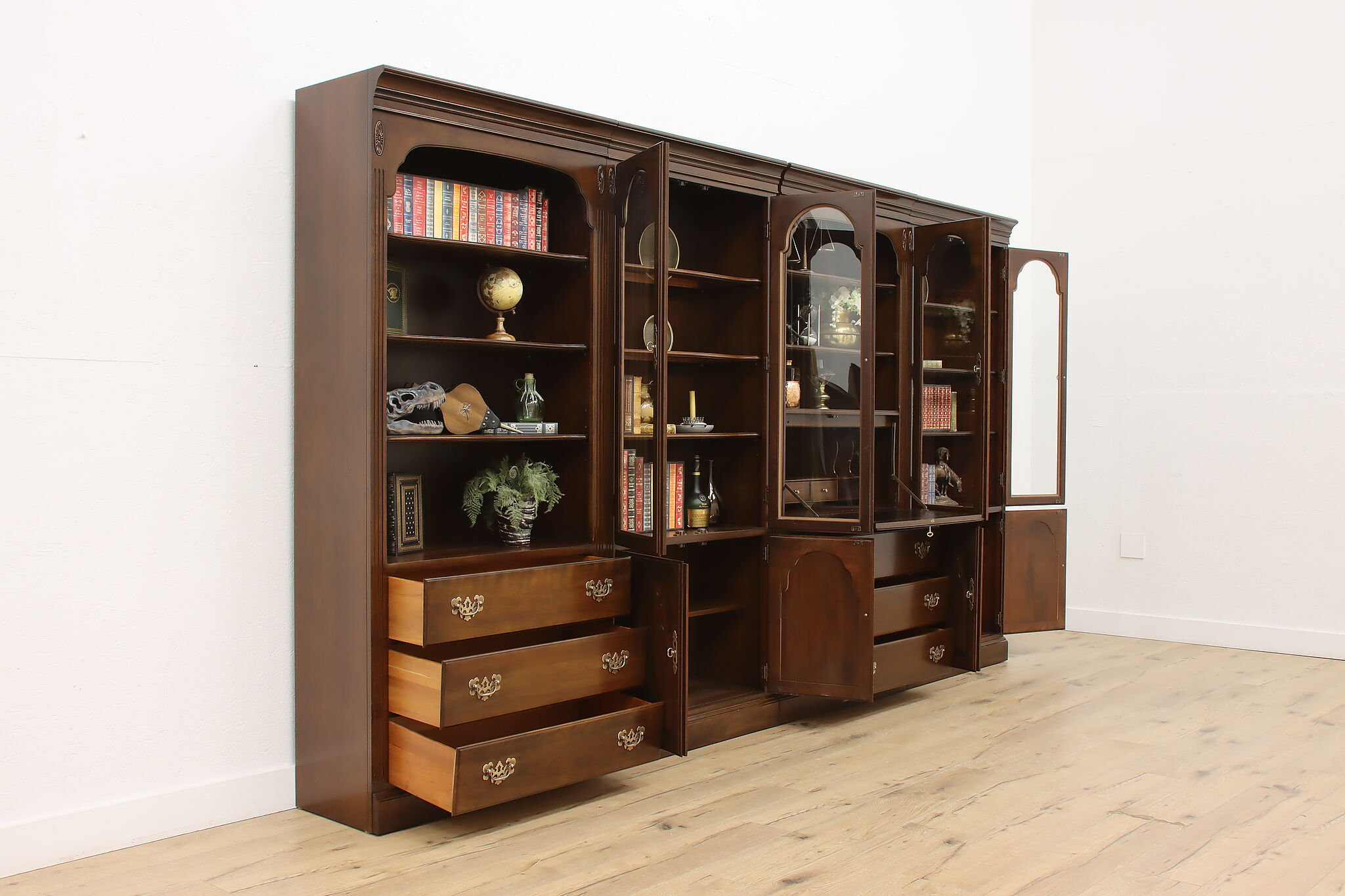 Arrange this four piece Georgian design office or library bookcase wall unit to best suit your needs! Each piece could even be used in separate rooms for trinkets, liquor, or trophies!