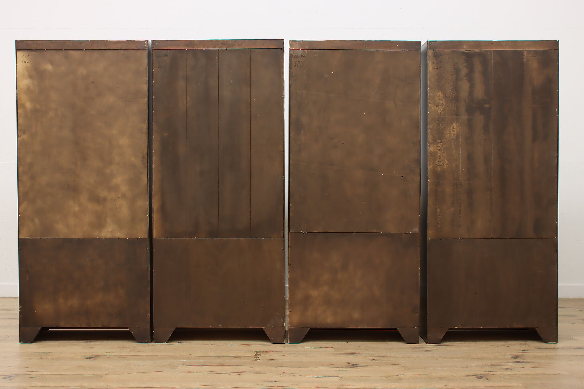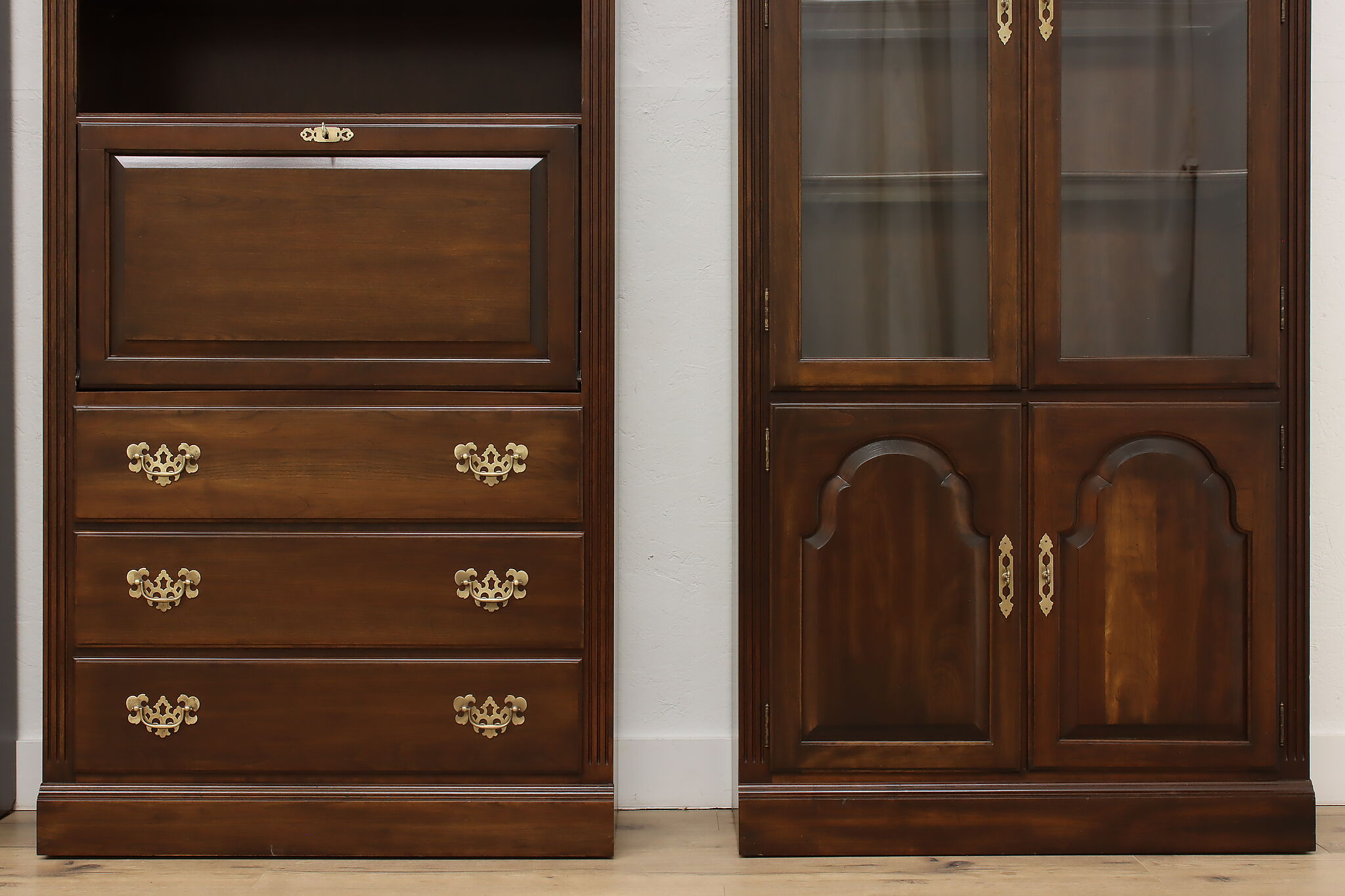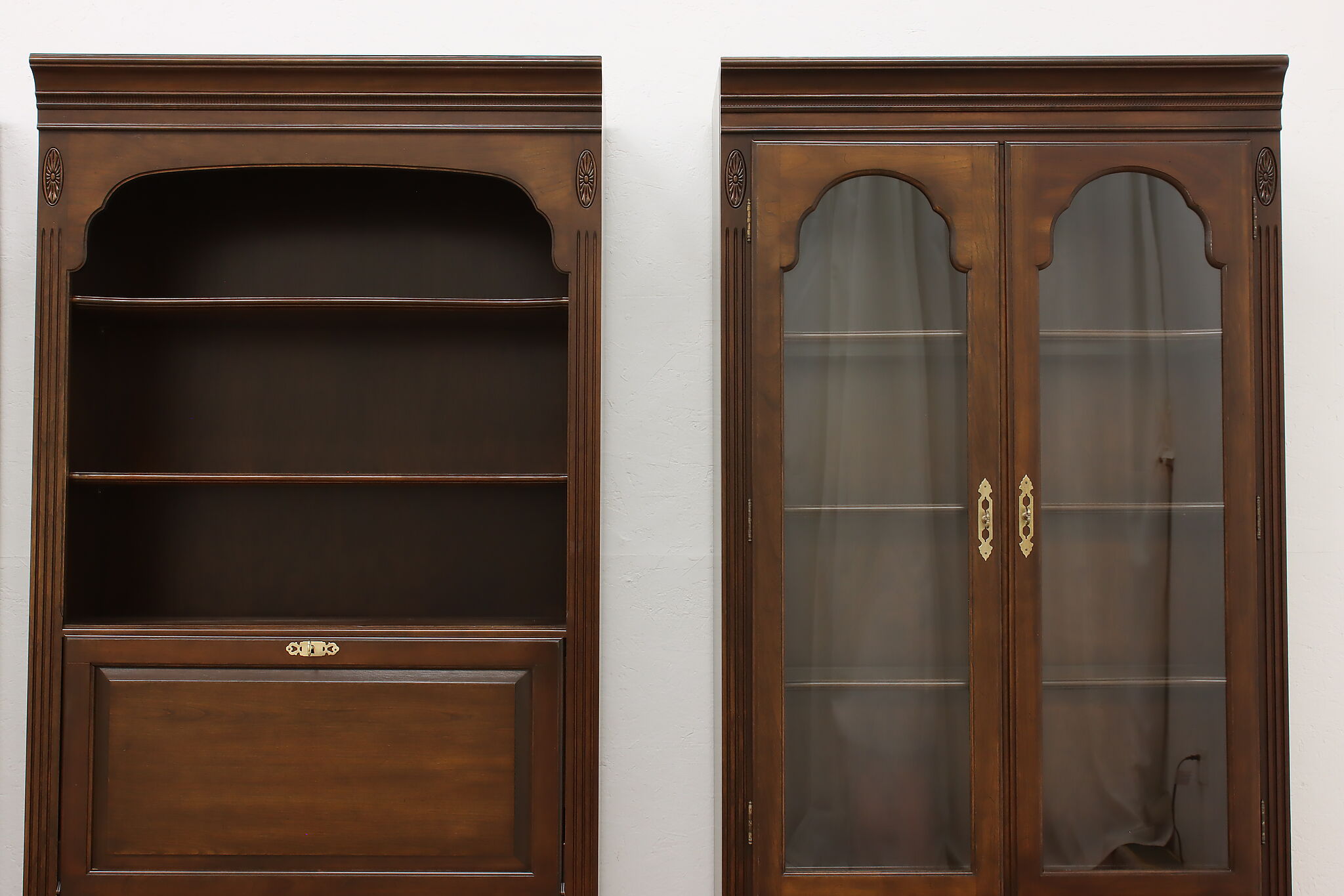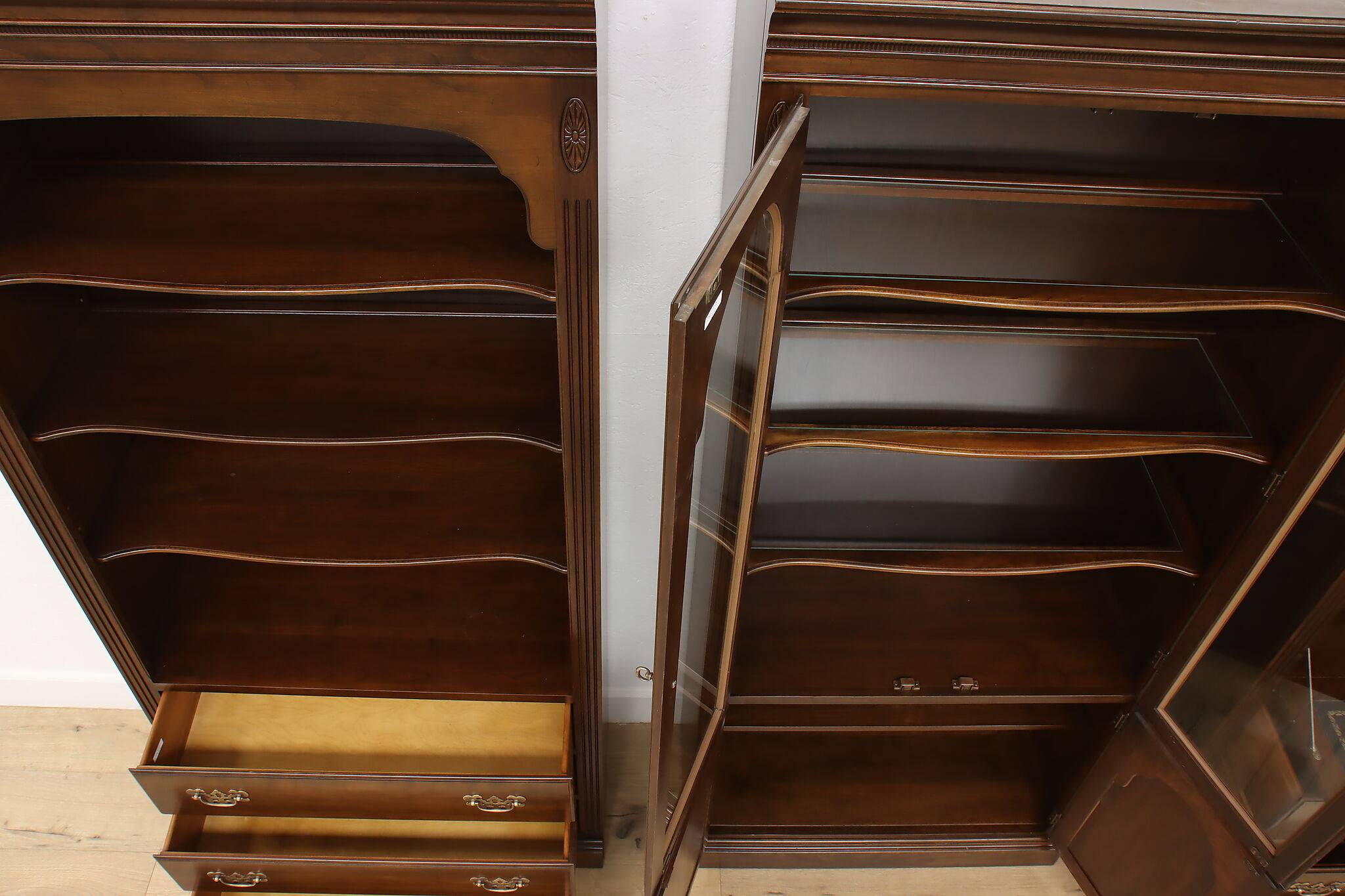Arrange this four piece Georgian design office or library bookcase wall unit to best suit your needs! Each piece could even be used in separate rooms for trinkets, liquor, or trophies!