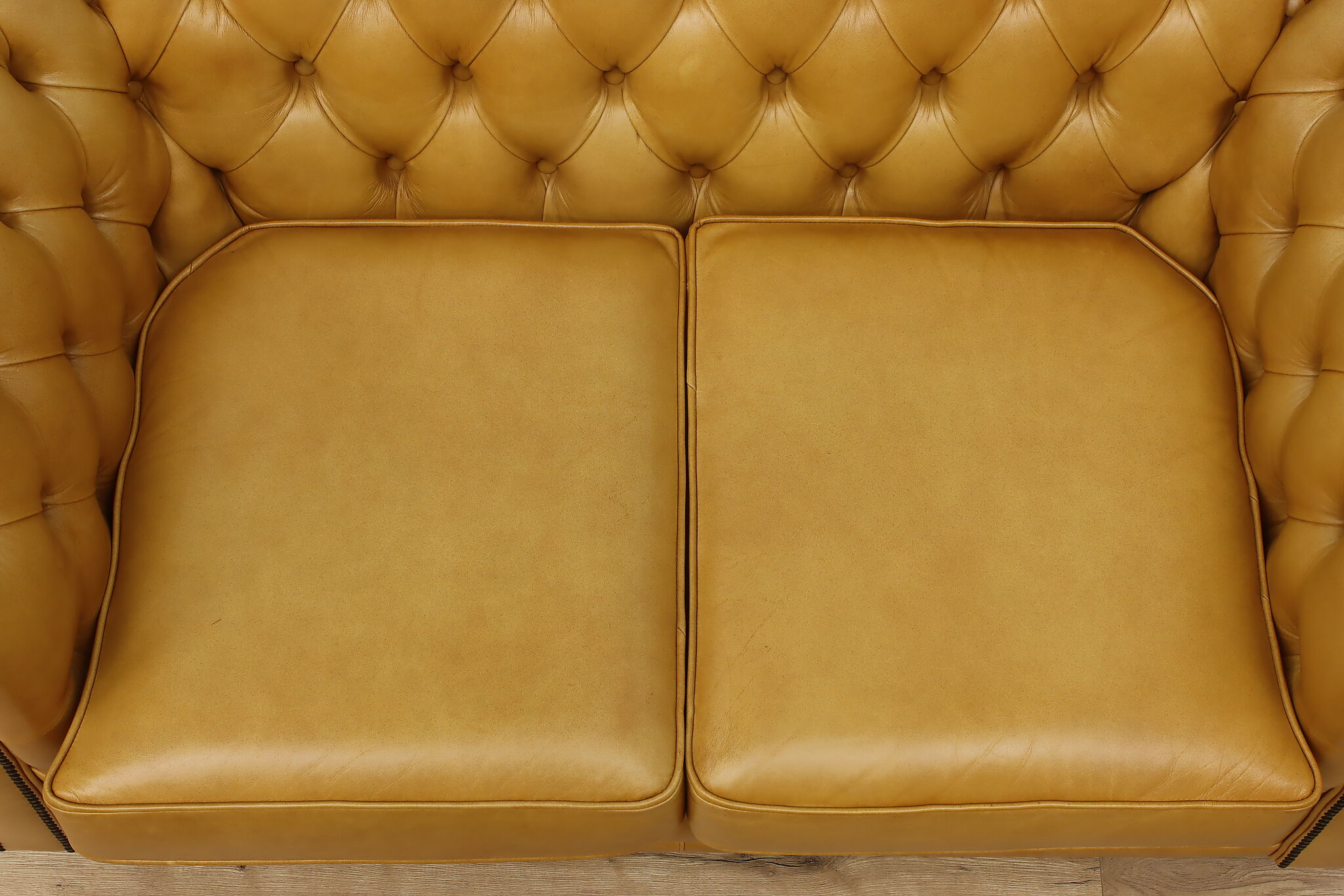 A classic English Chesterfield loveseat has warm, butterscotch leather upholstery that would compliment any office or library.