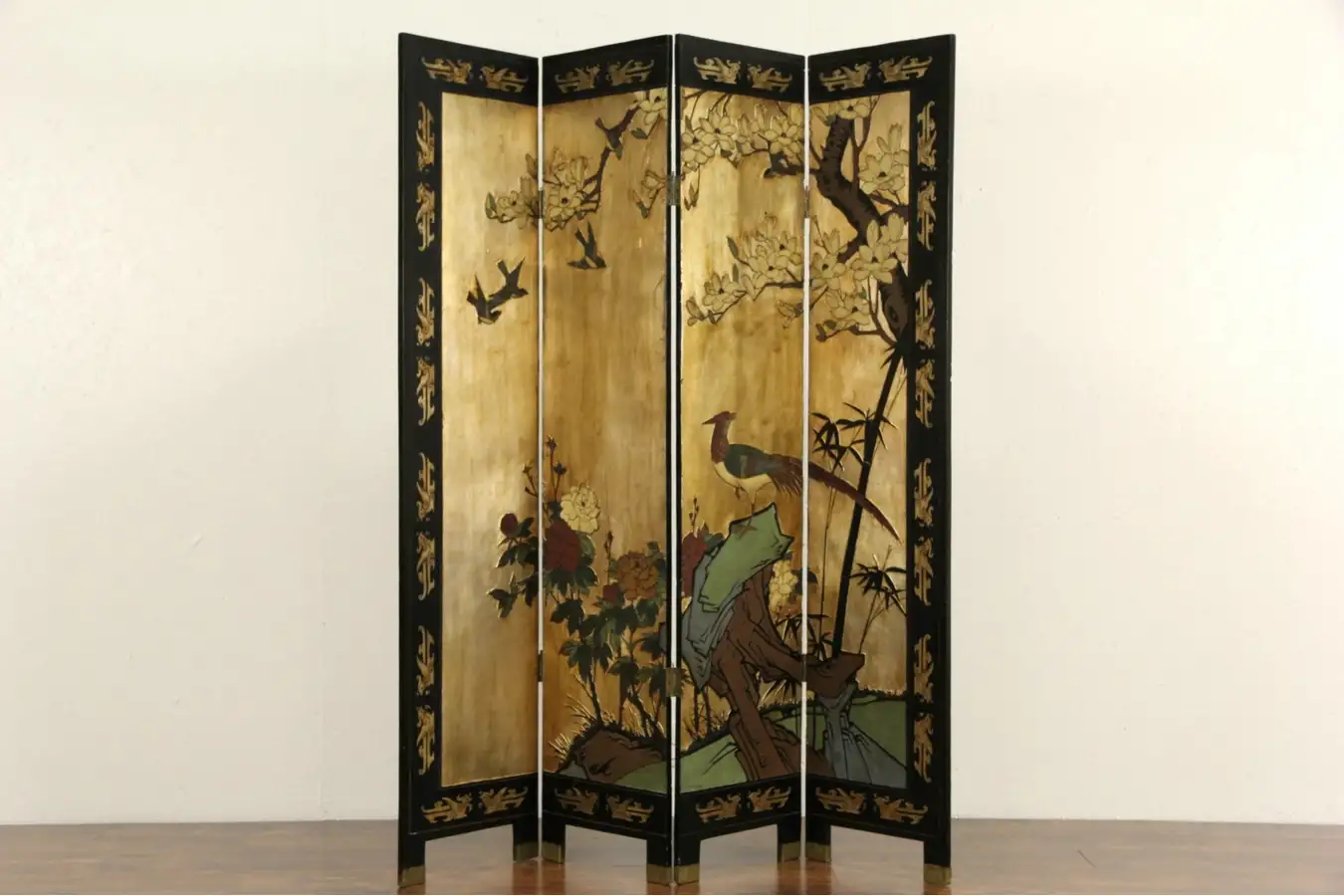 A genuine "coromandel" four panel screen was hand crafted in China by painting many coats of colored lacquer, topping in black and then delicately carving down to the colors underneath.
