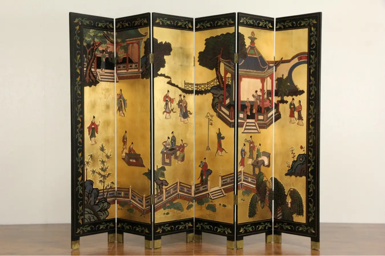 About 75 years old, this traditional technique is beautiful. Squares of genuine gold leaf form the background of a summer palace and garden scene. The back side is a classic garden scene against a satiny black ground.