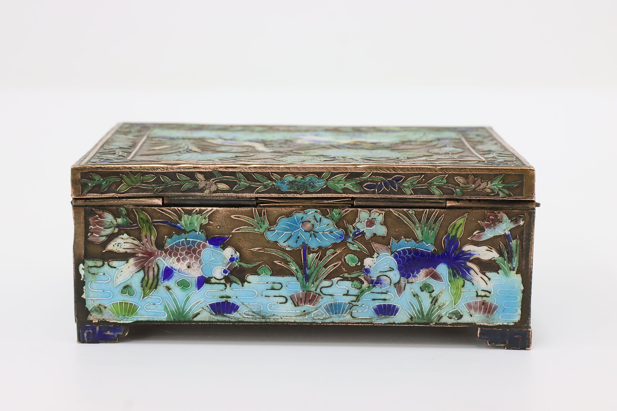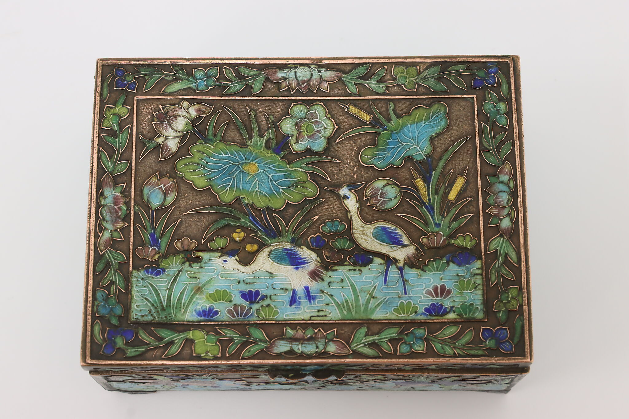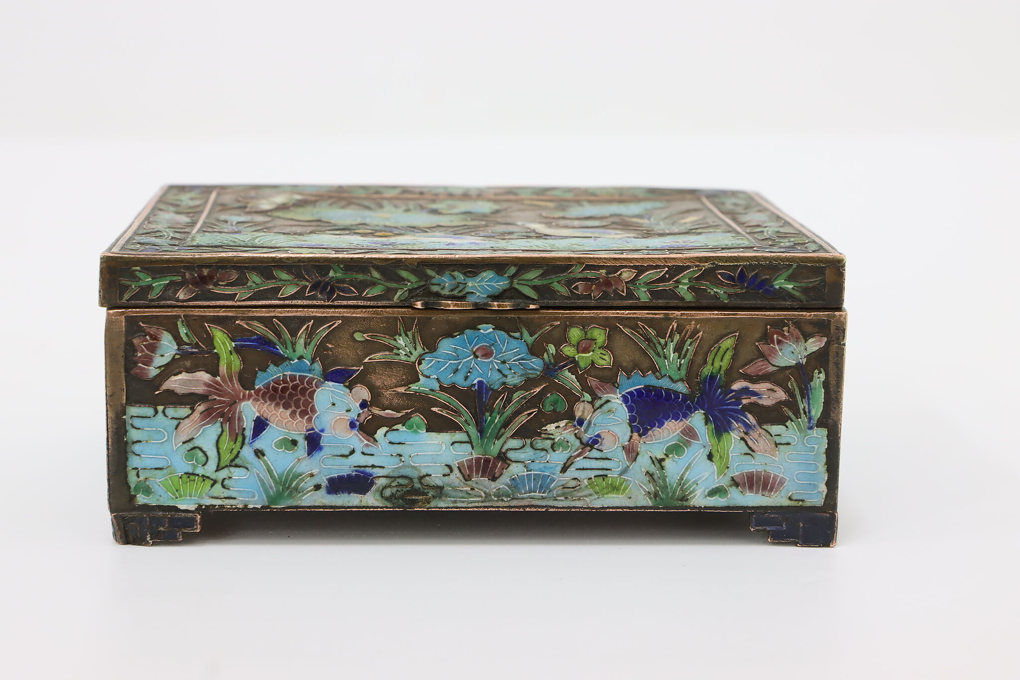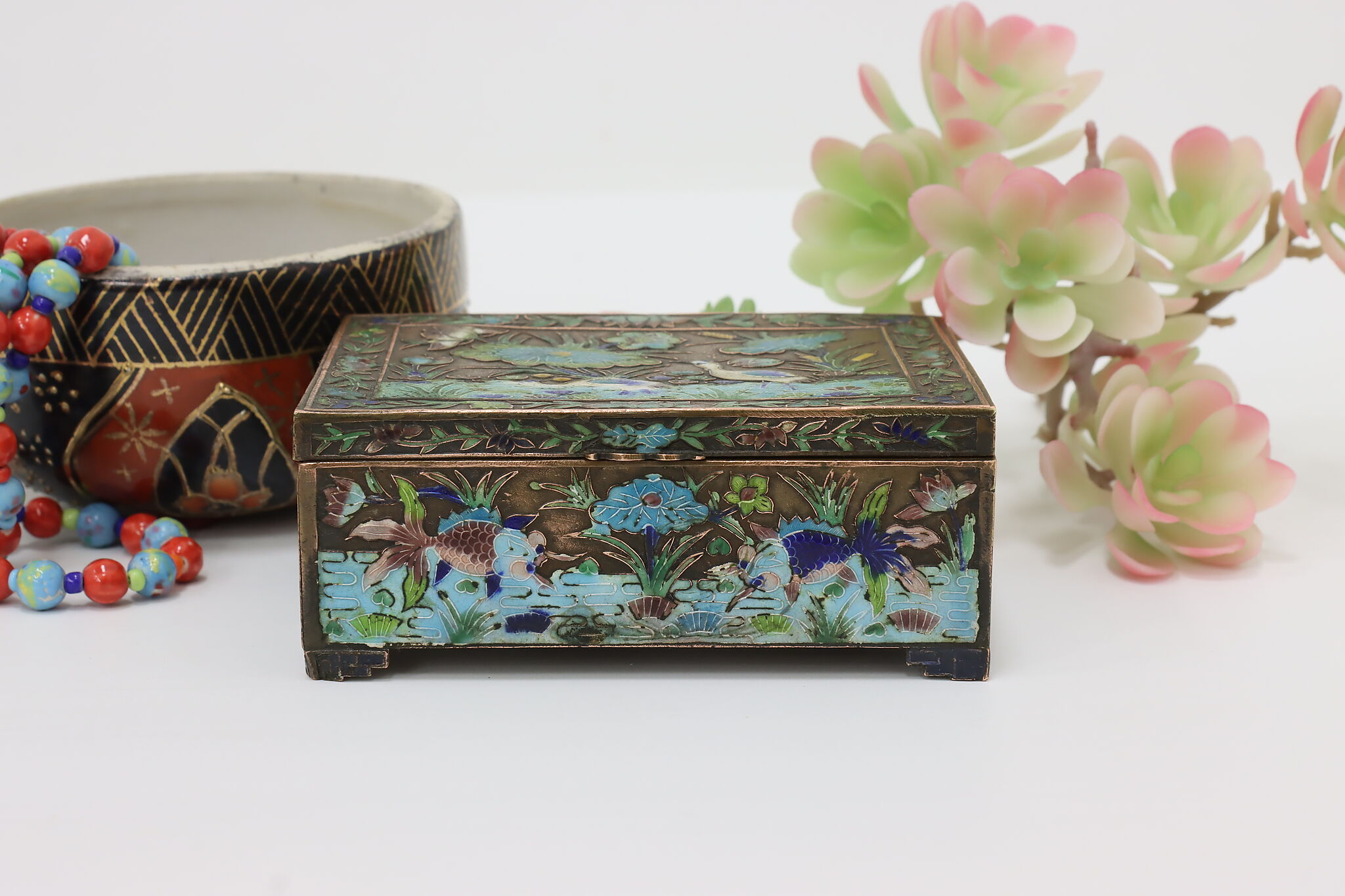 This jewelry or trinket box has a beautiful scene of a pond with herons and fish, important symbols in Chinese culture.