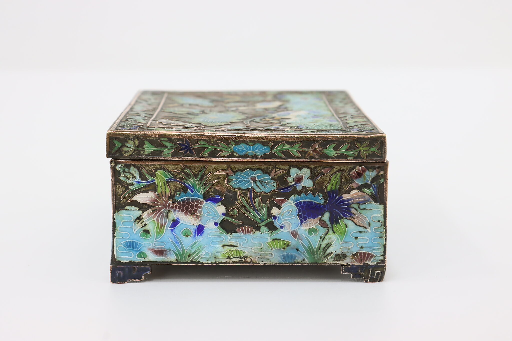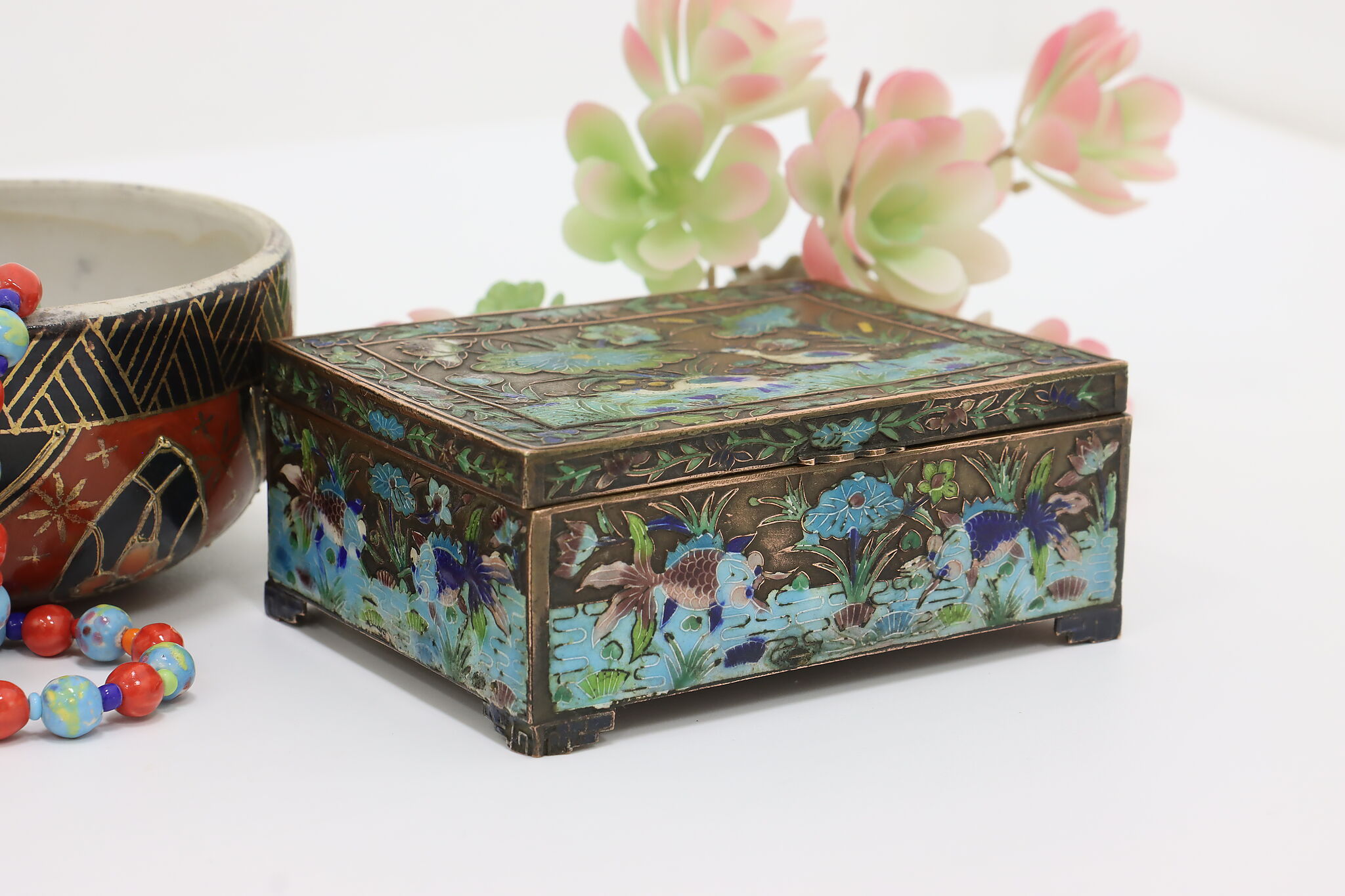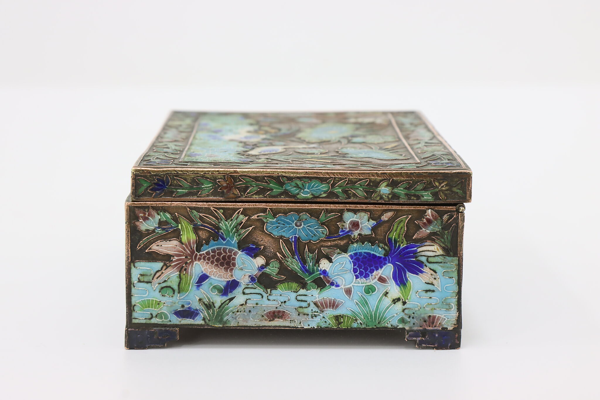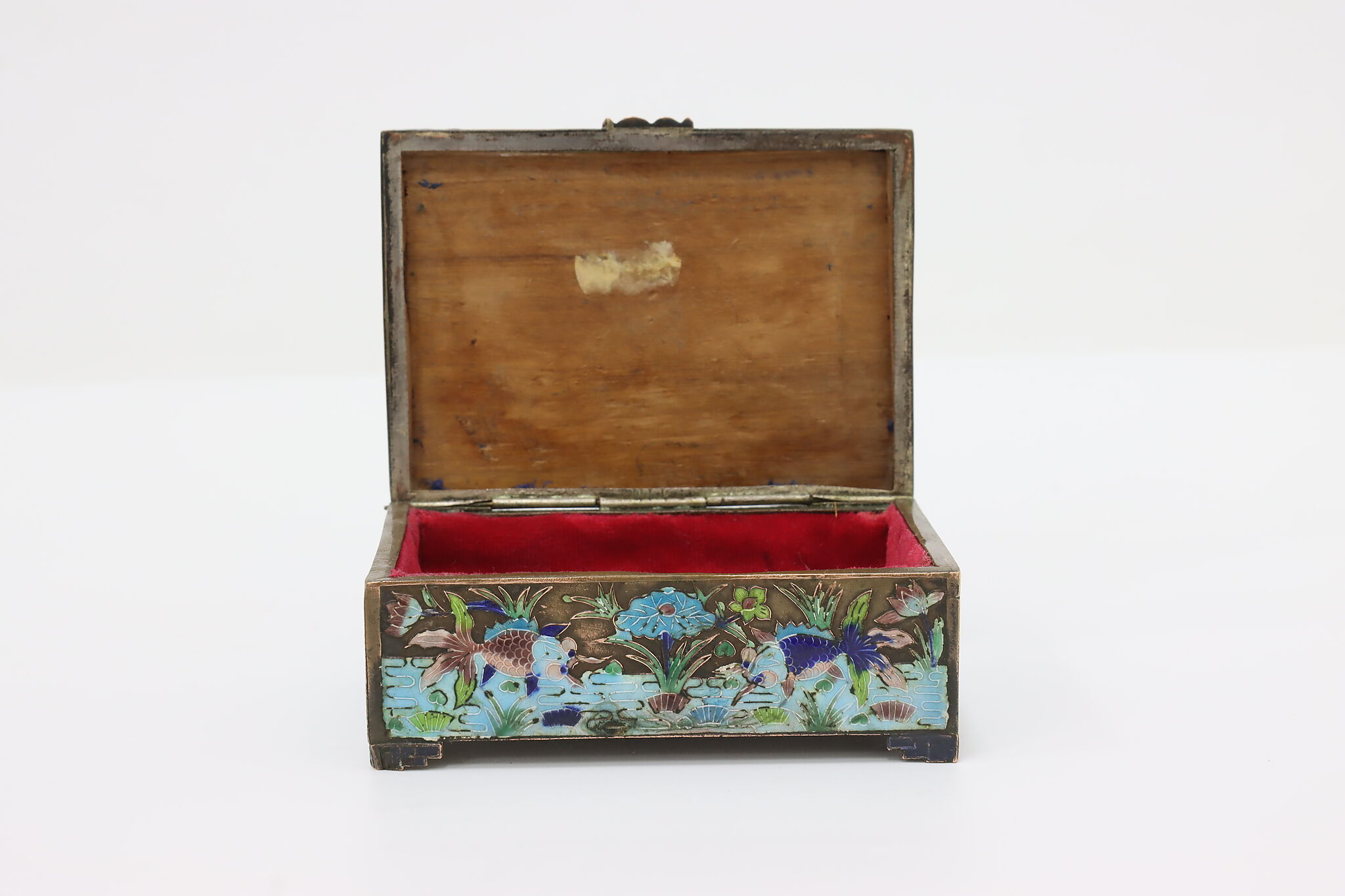 This jewelry or trinket box has a beautiful scene of a pond with herons and fish, important symbols in Chinese culture.
