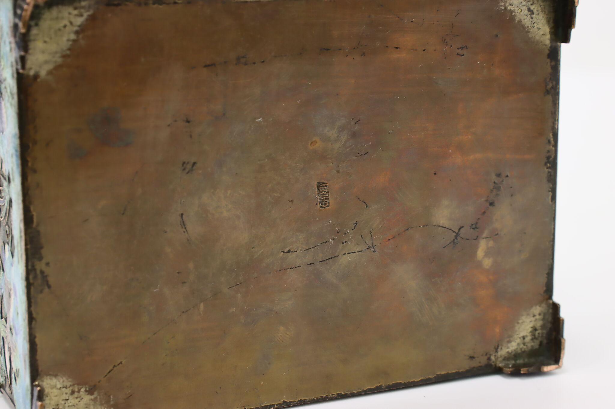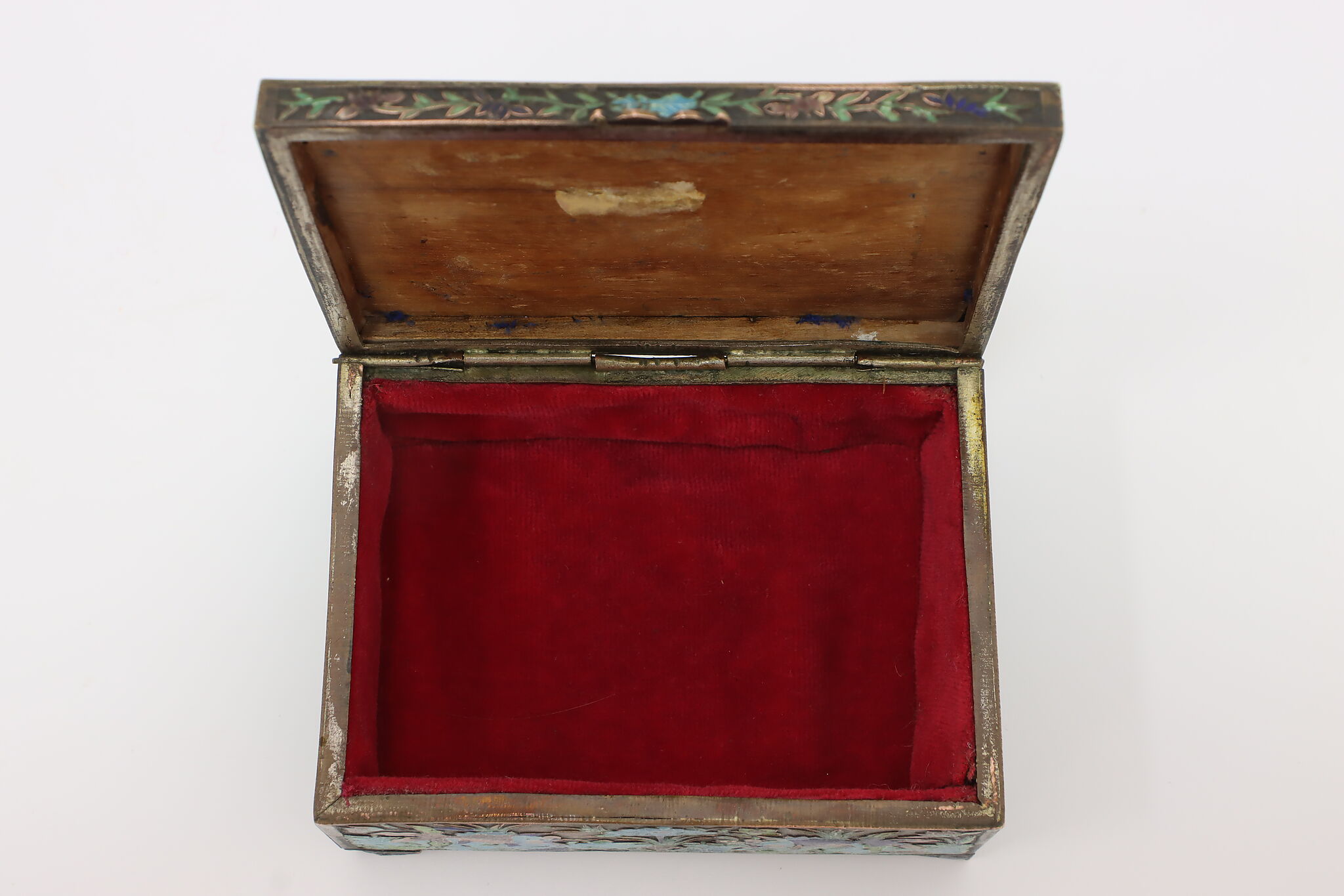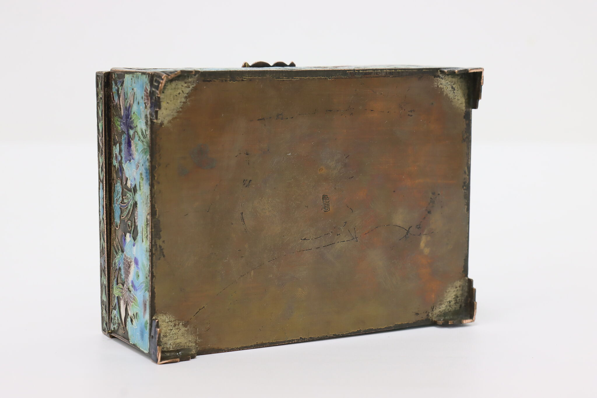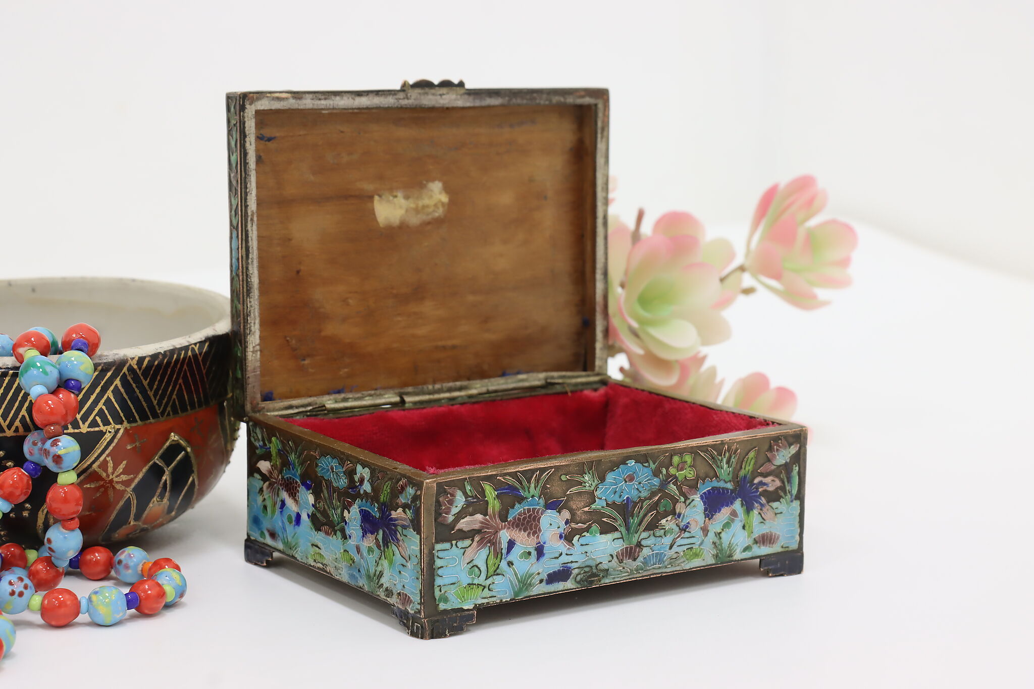 This jewelry or trinket box has a beautiful scene of a pond with herons and fish, important symbols in Chinese culture.