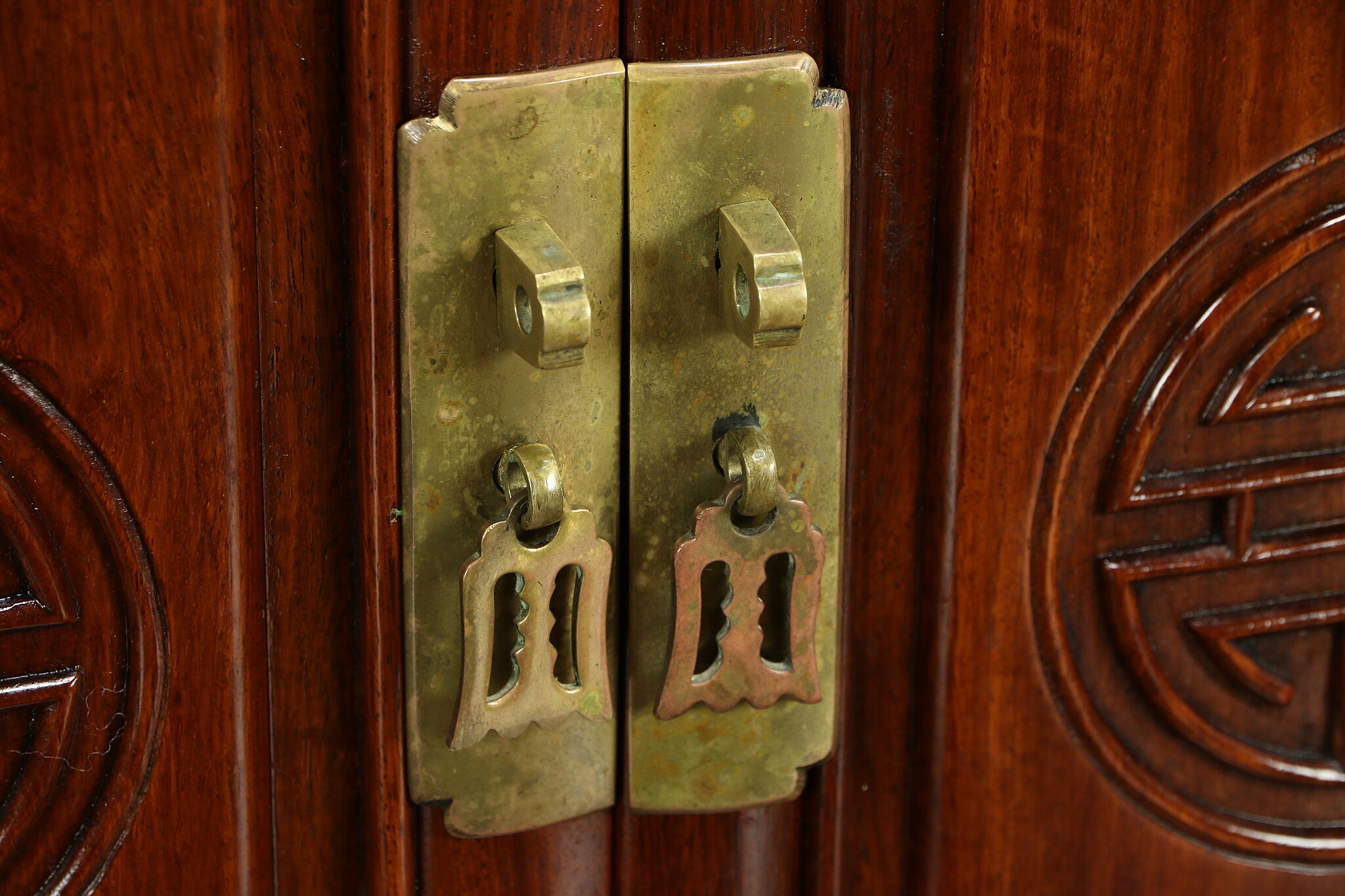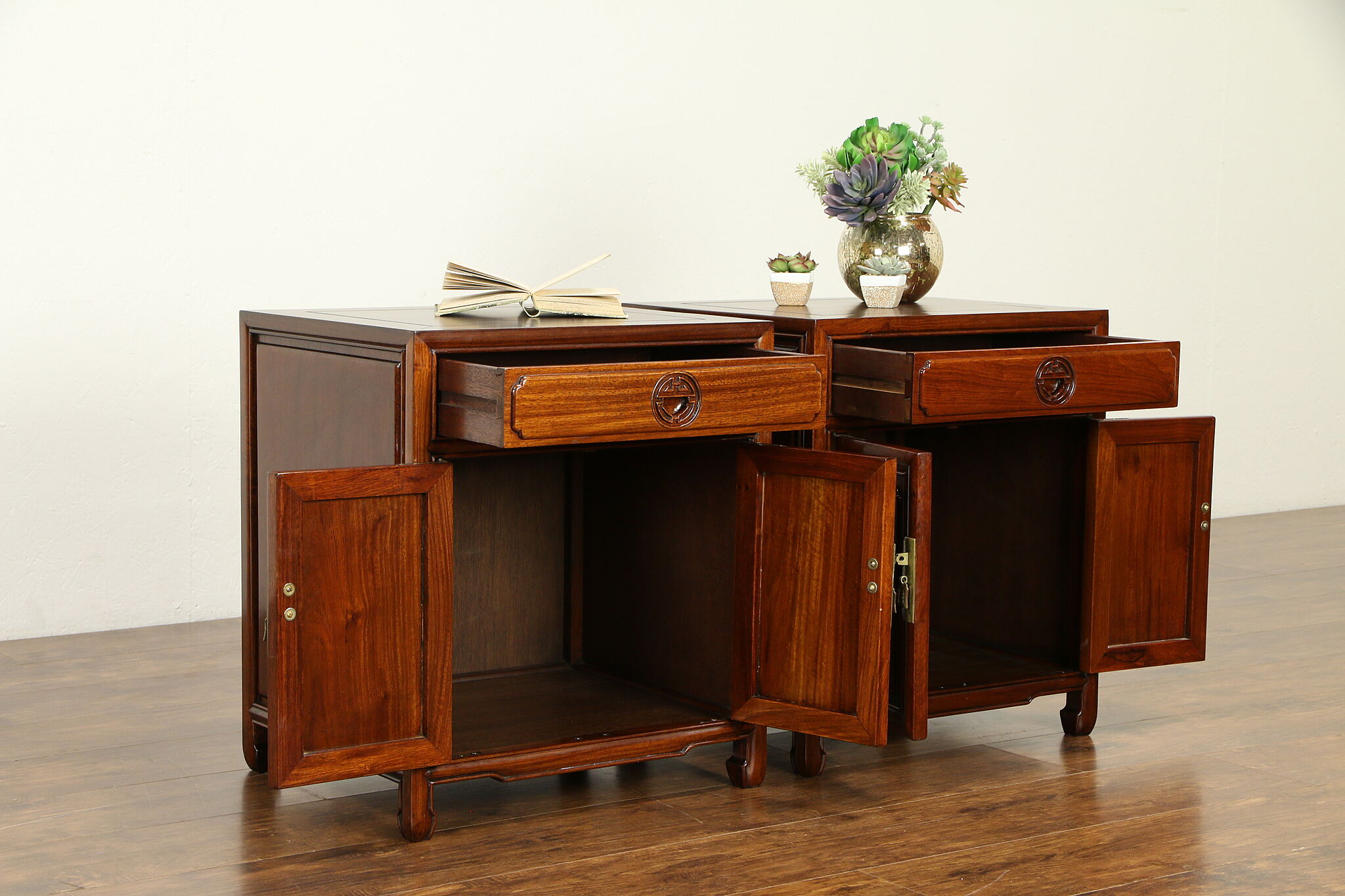 Hand carved of solid rosewood in China about 30 years ago, this pair of nightstands or lamp tables has exquisite details and raised panels.