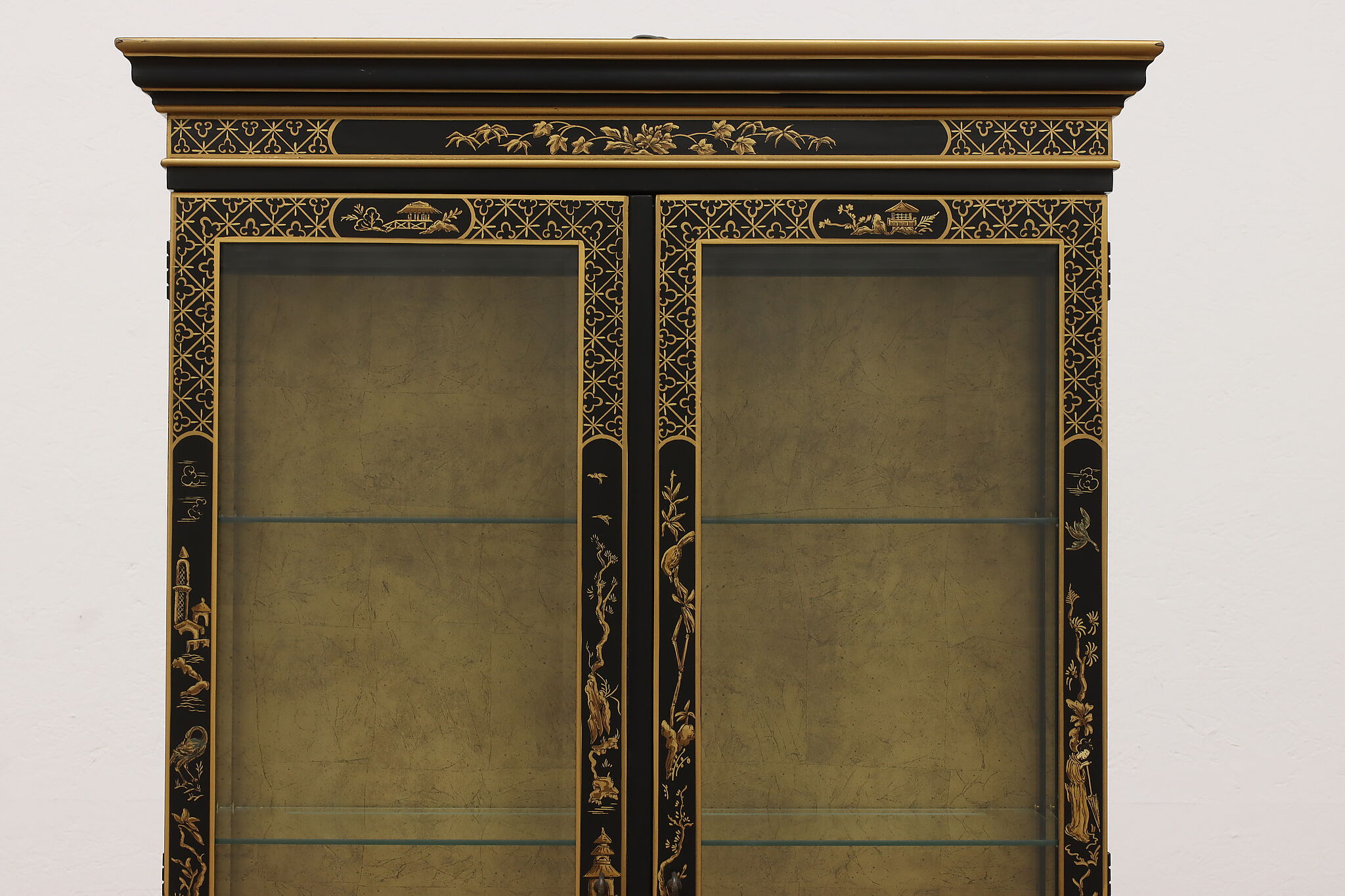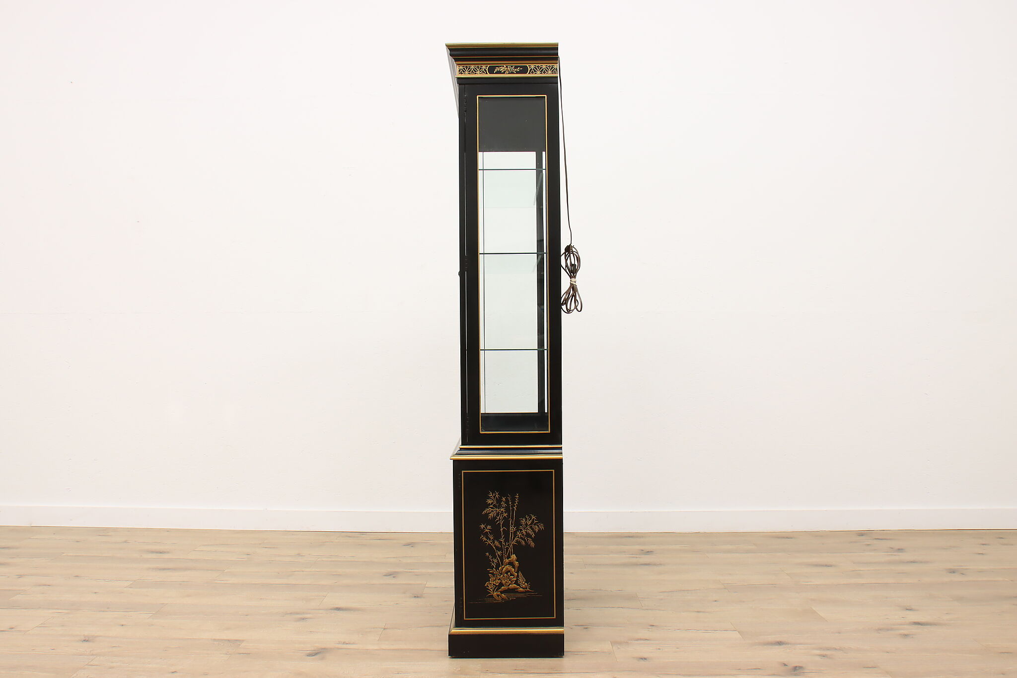A china or display cabinet has beautiful traditional Chinese hand painted scenes and motifs.