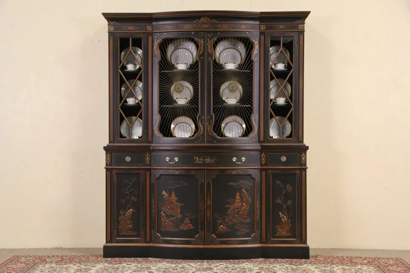 Hand painted with raised enamel in the "Chinoiserie" manner in the 1950's, this breakfront china cabinet or bookcase is actually American made. Artistically painted in muted tones against a black lacquer background, the original finish has touchups and was protected with a new coat of satin varnish.