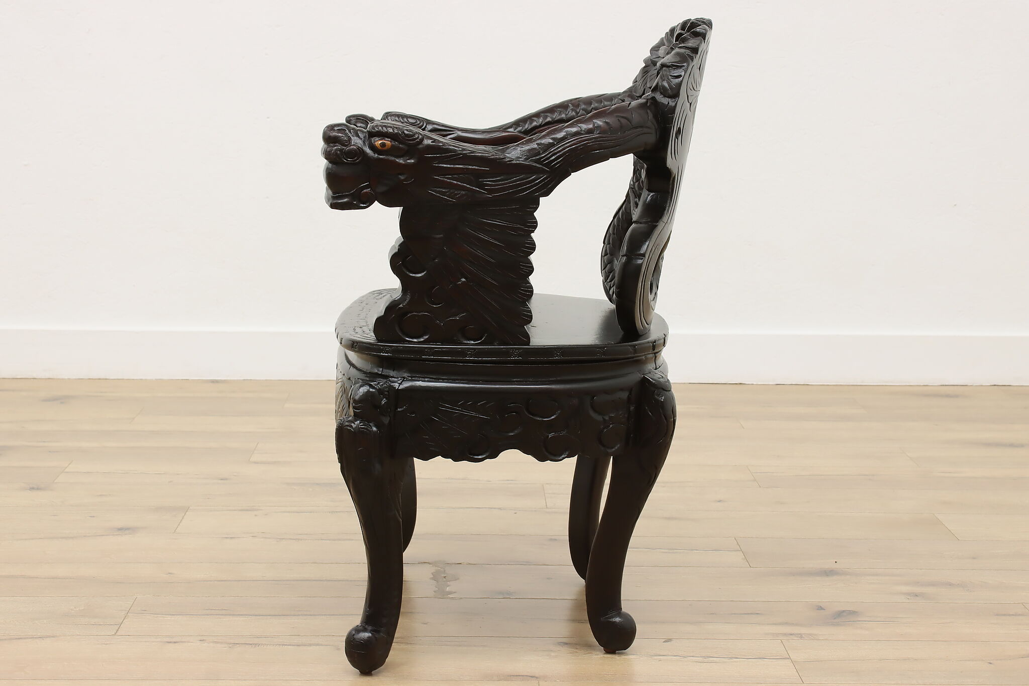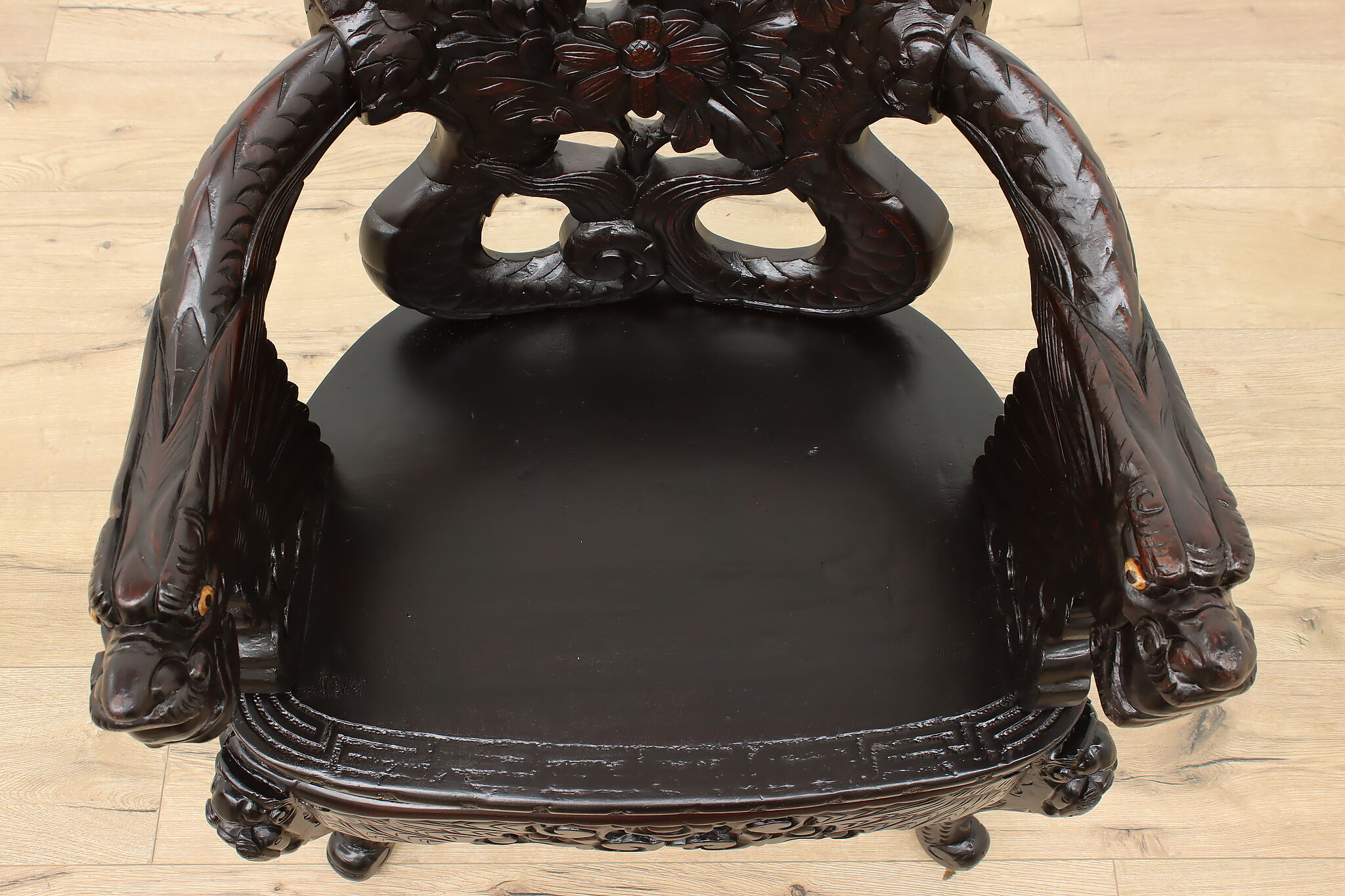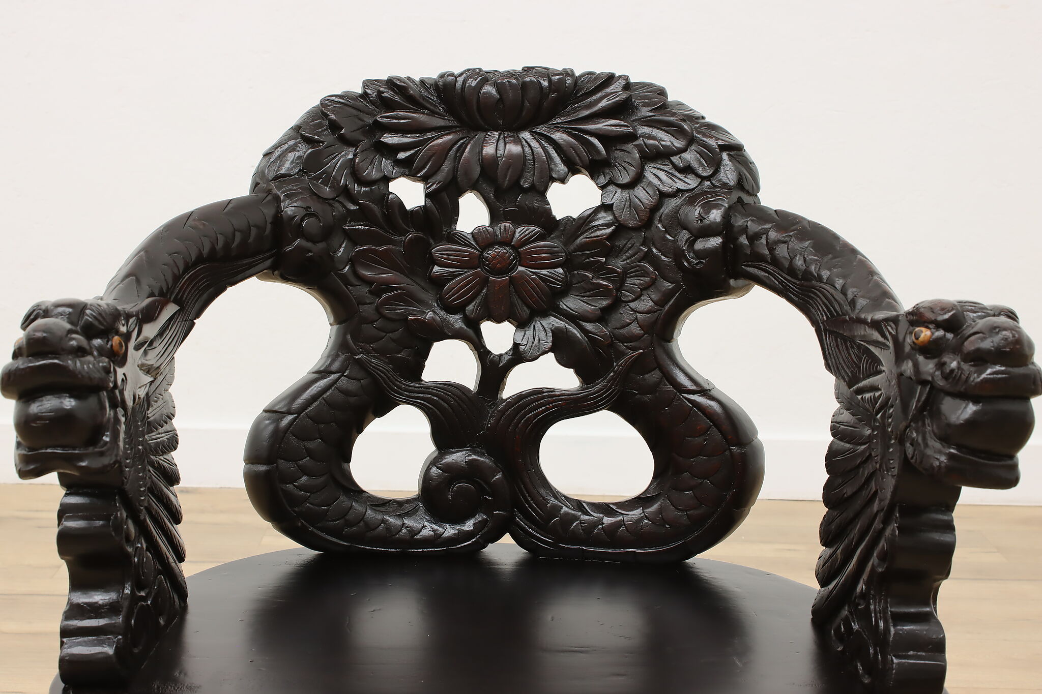 Feel like royalty as you watch over your kingdom from this gorgeously carved chair with its impressive dragon arms.