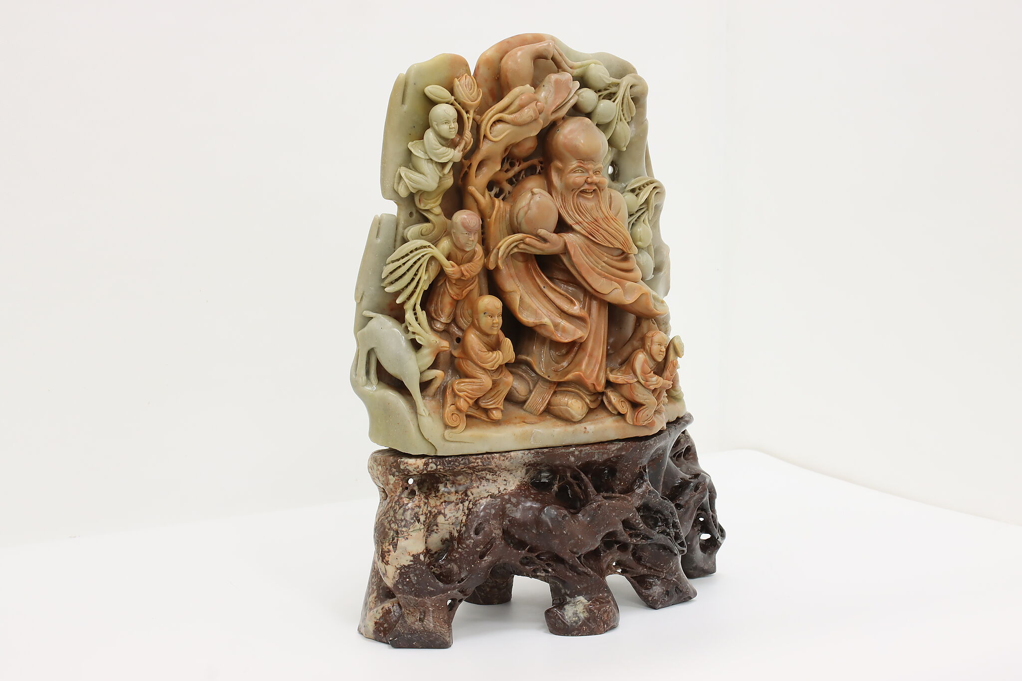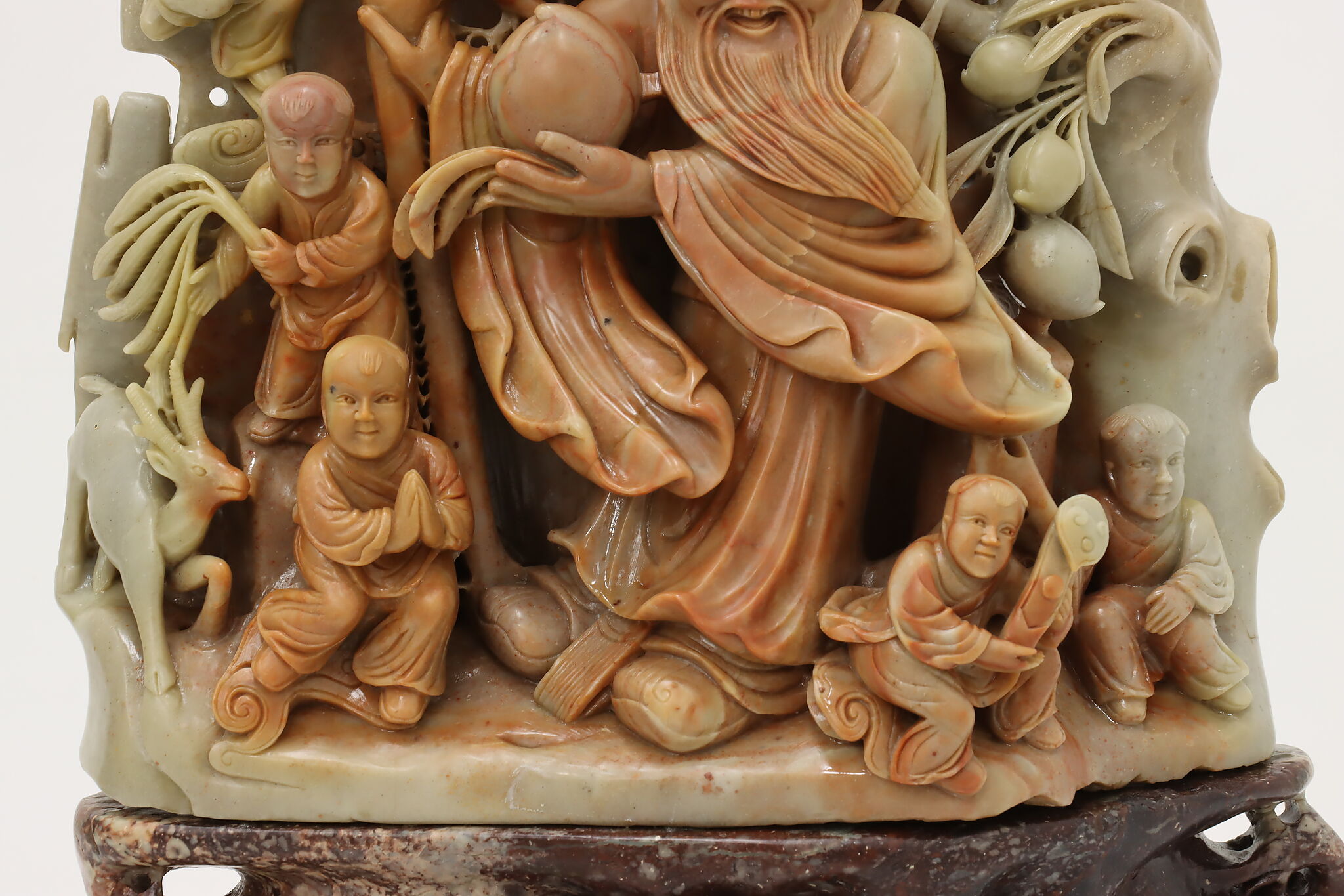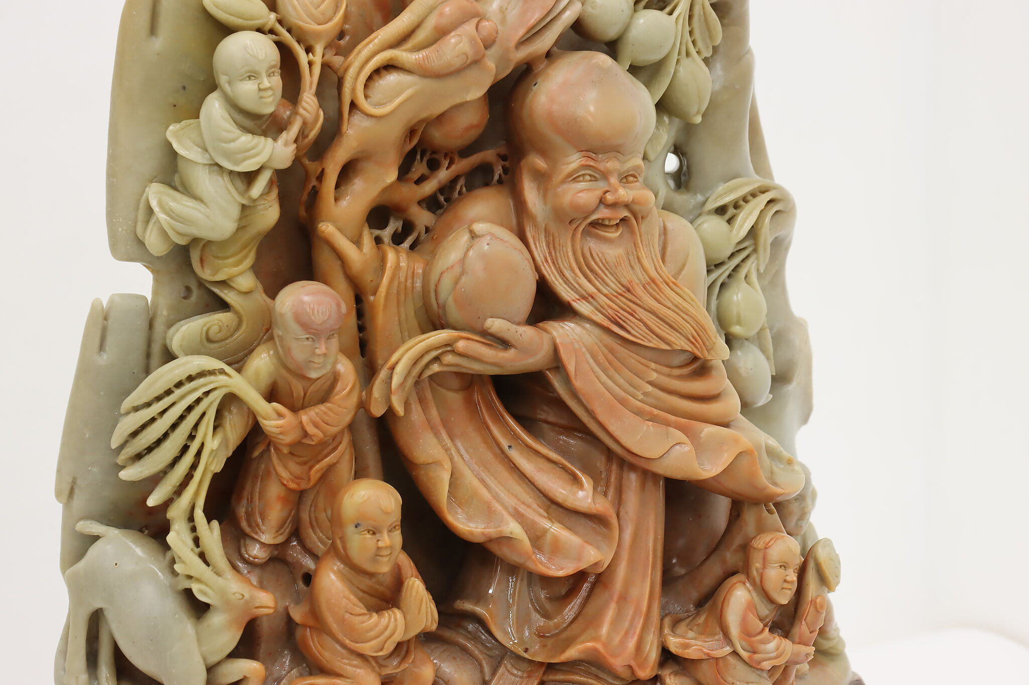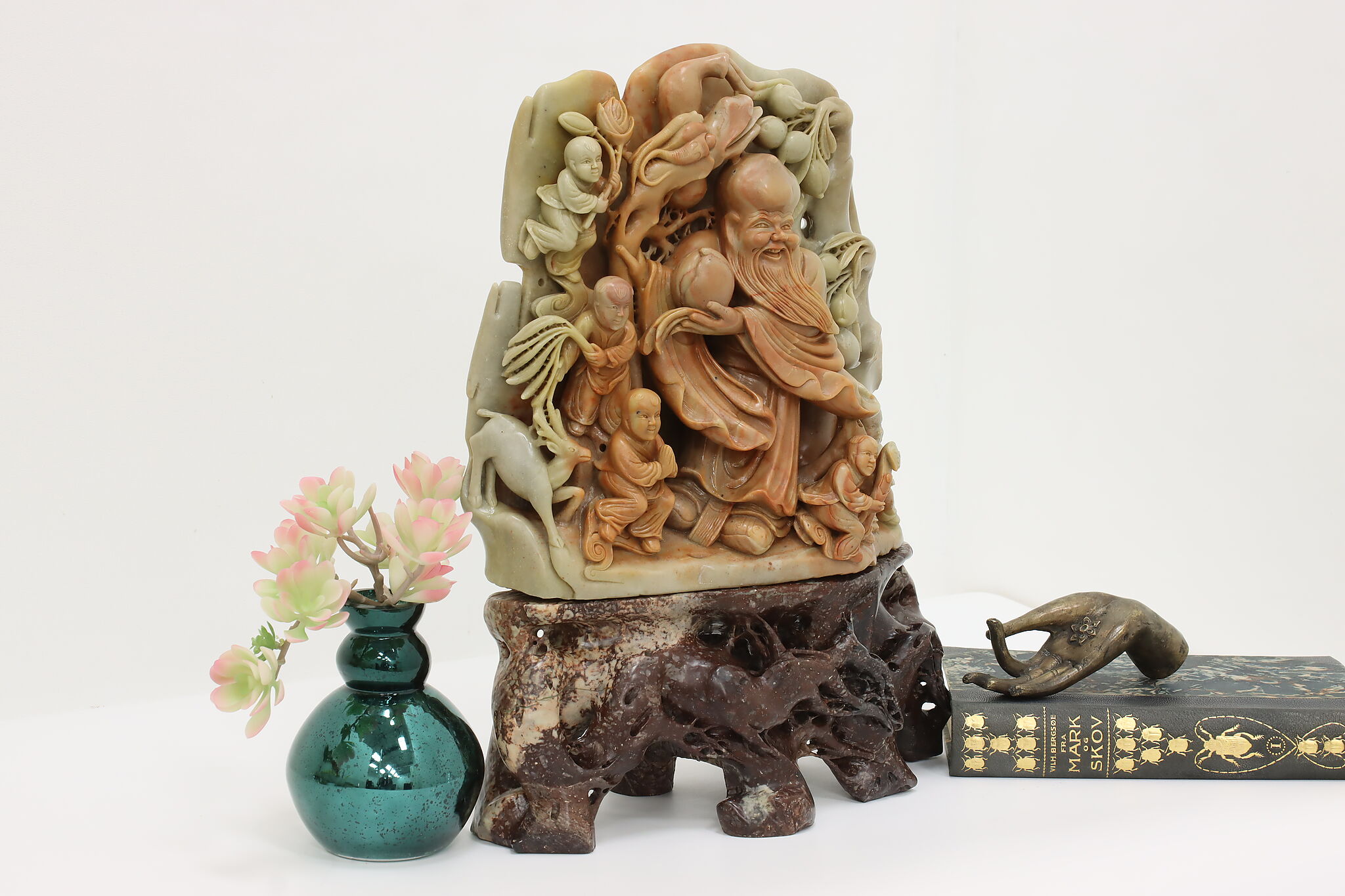 This sculpture of the Chinese god of longevity, Shou Lao, is gorgeously hand carved of soapstone with children, immortality symbol of peaches and a dragon staff.