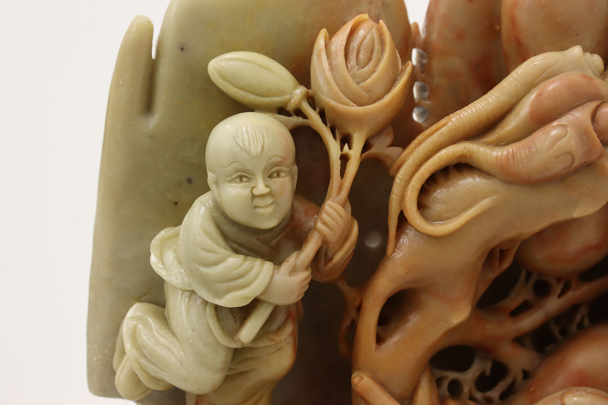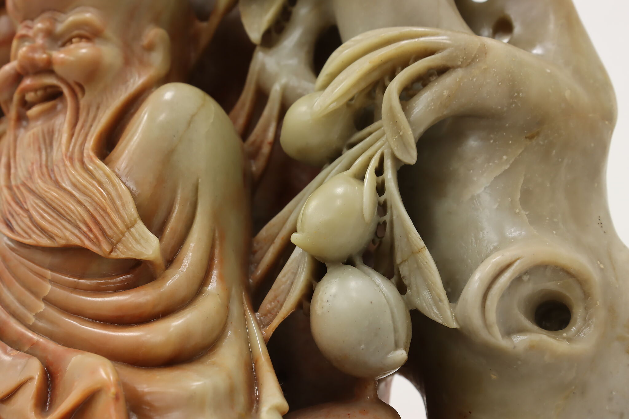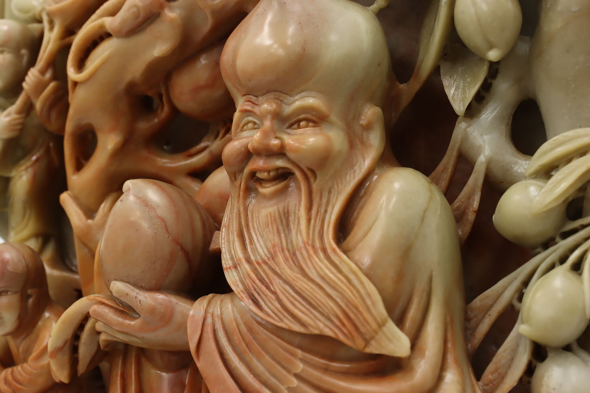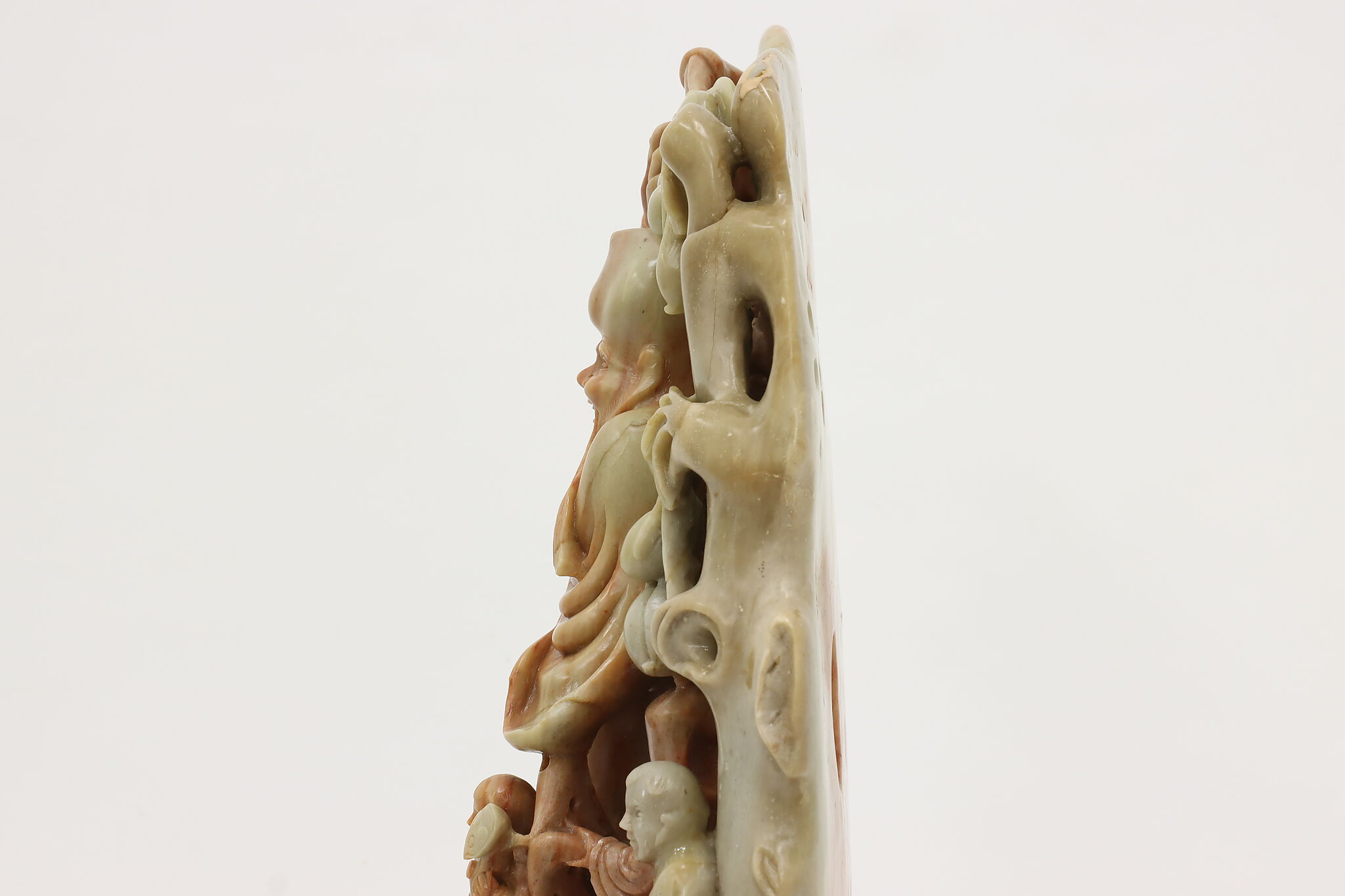 This sculpture of the Chinese god of longevity, Shou Lao, is gorgeously hand carved of soapstone with children, immortality symbol of peaches and a dragon staff.