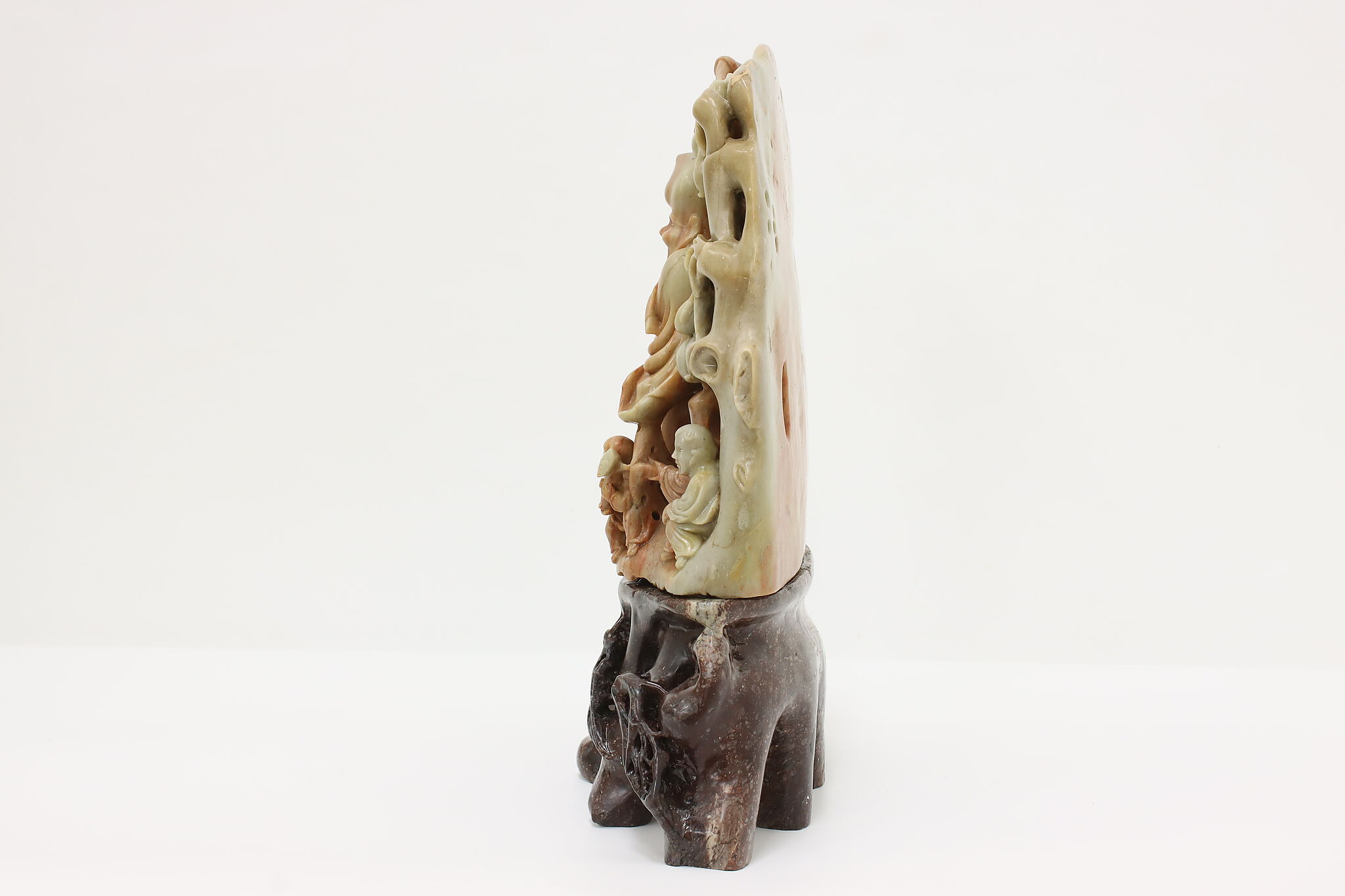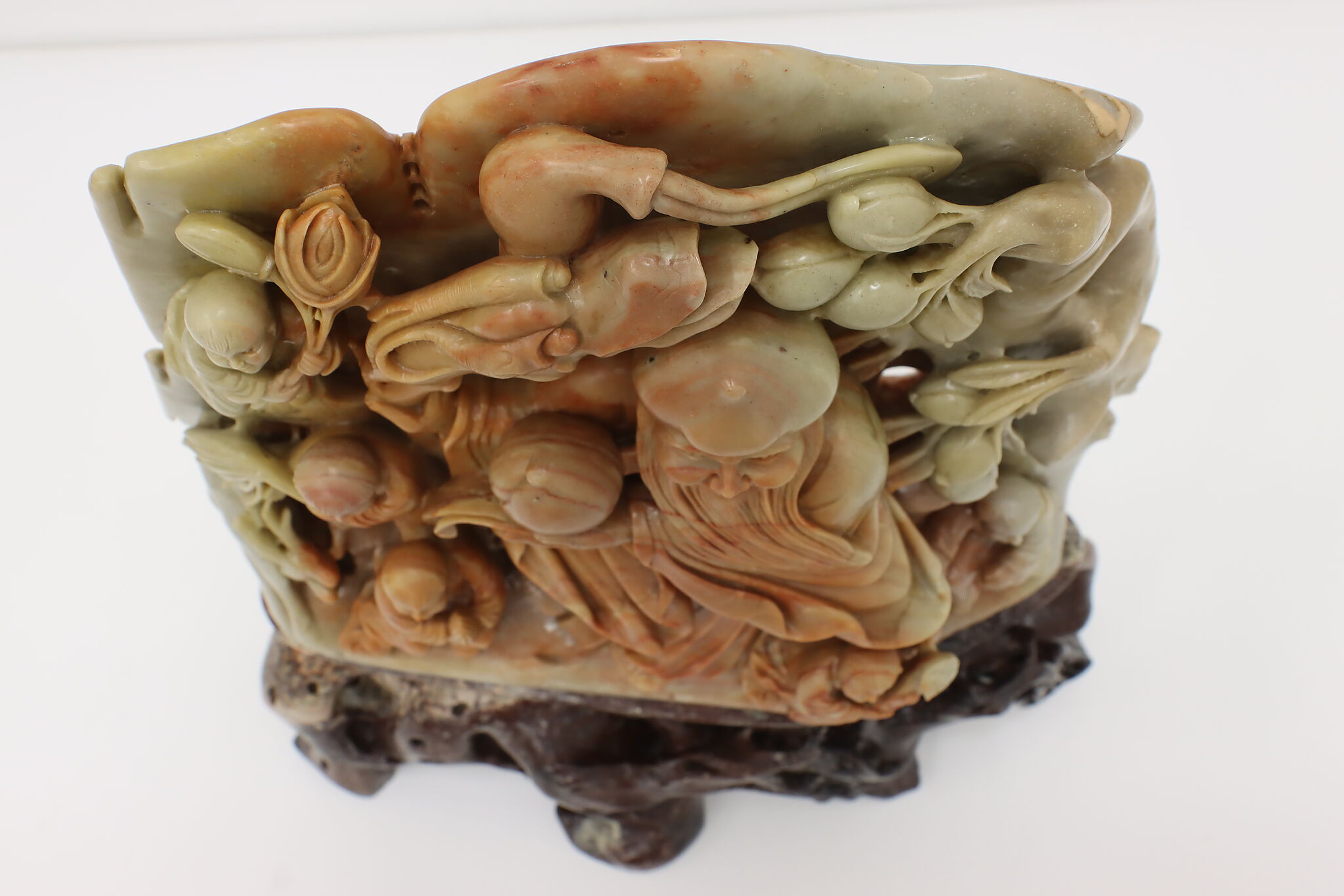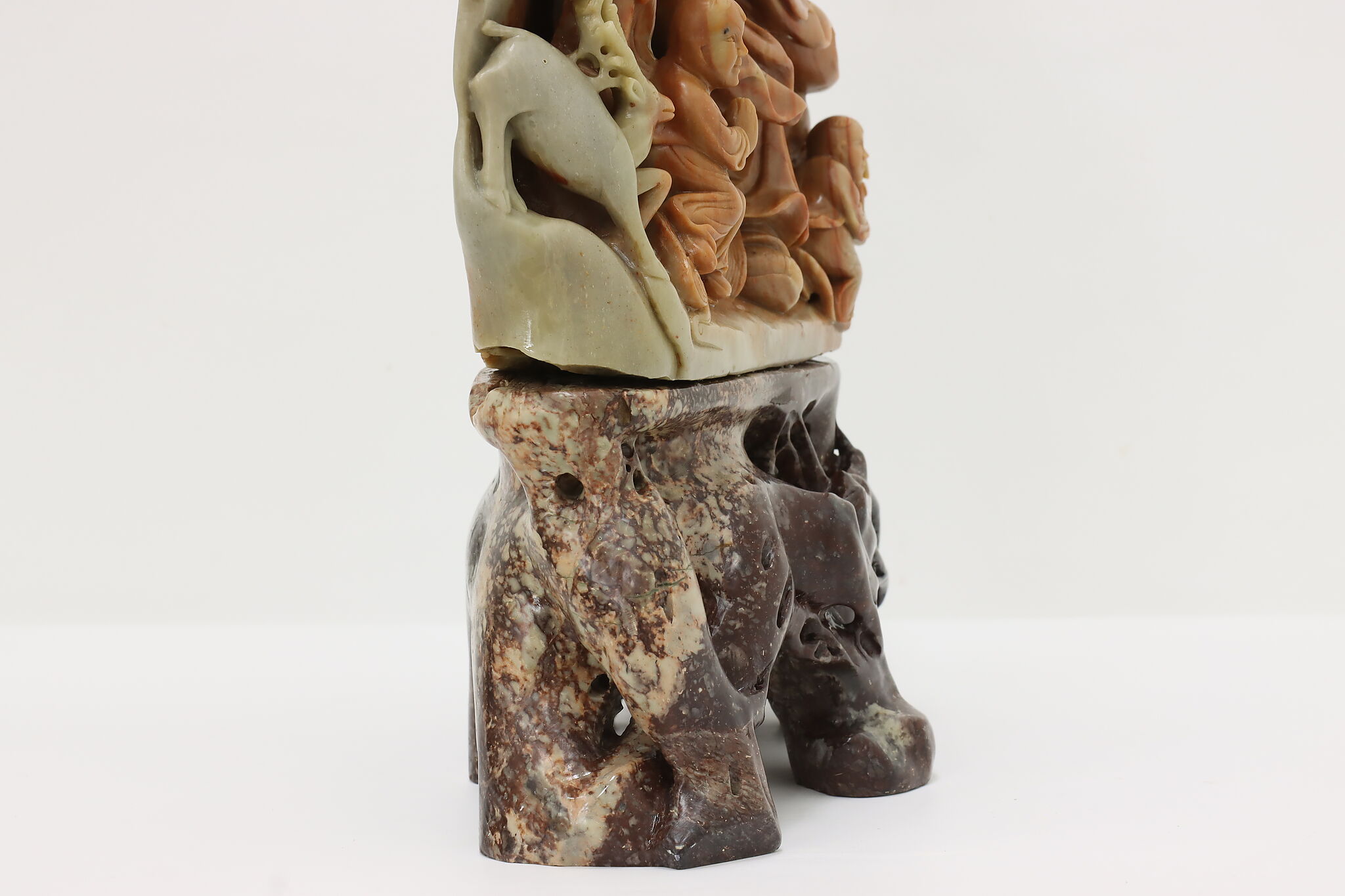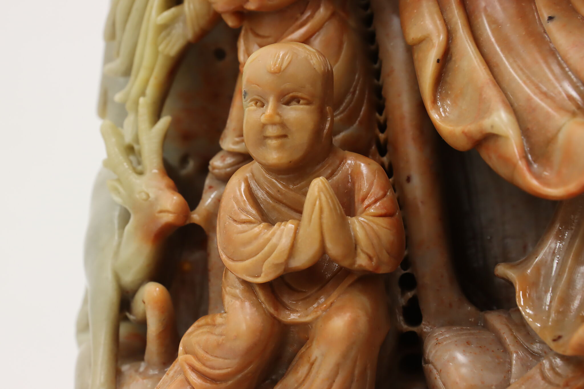 This sculpture of the Chinese god of longevity, Shou Lao, is gorgeously hand carved of soapstone with children, immortality symbol of peaches and a dragon staff.