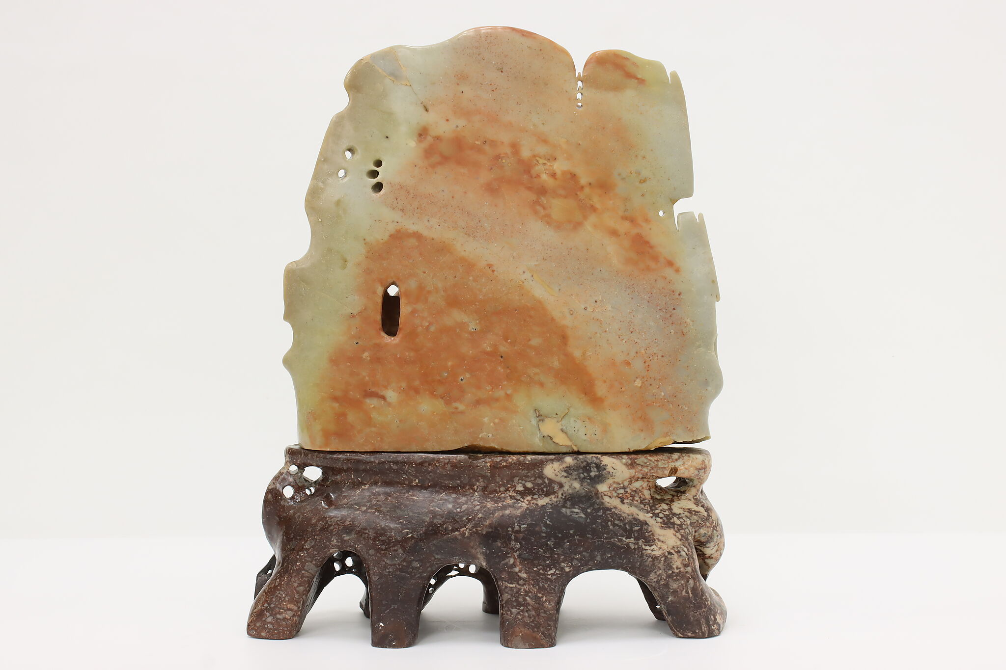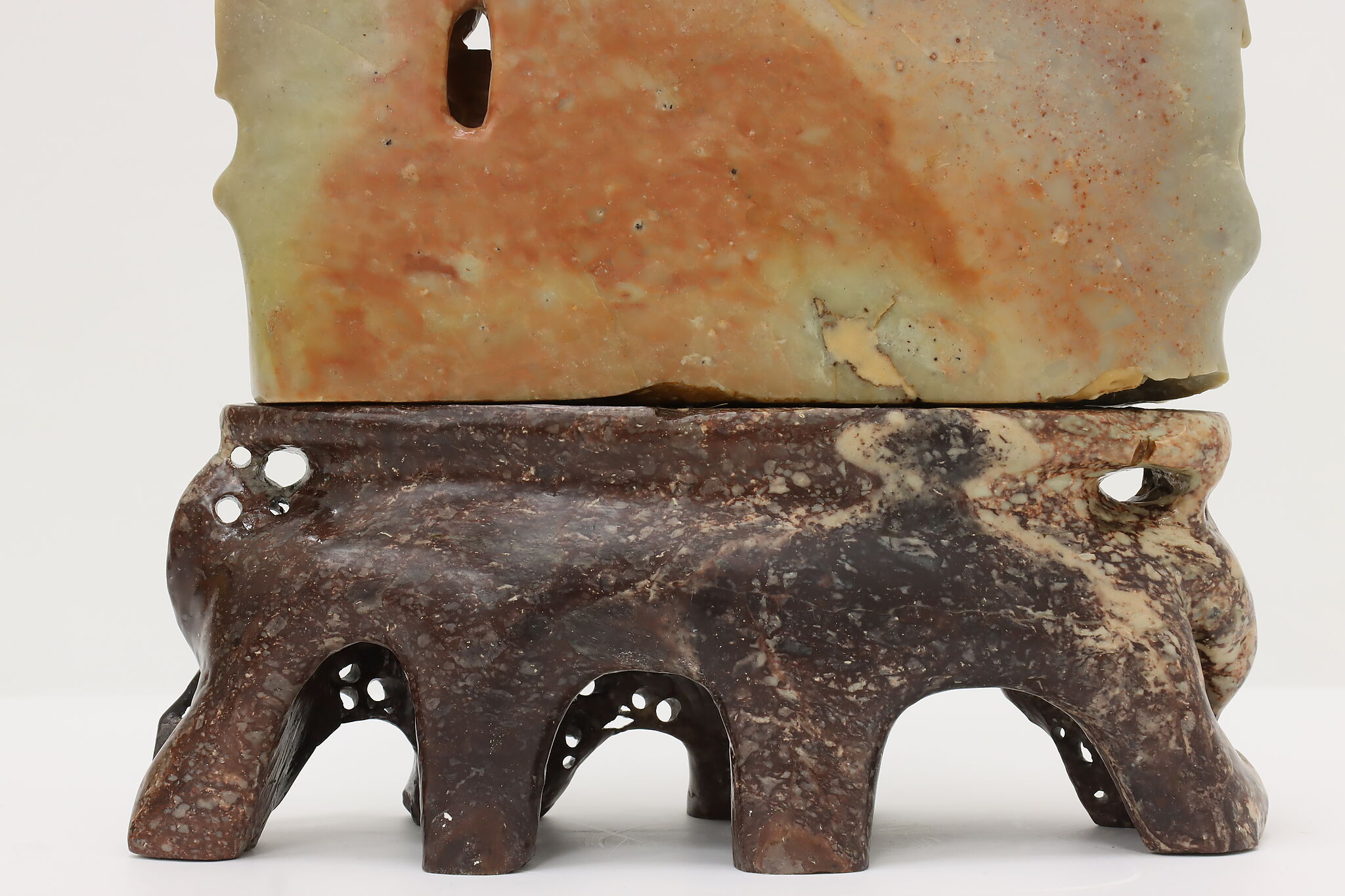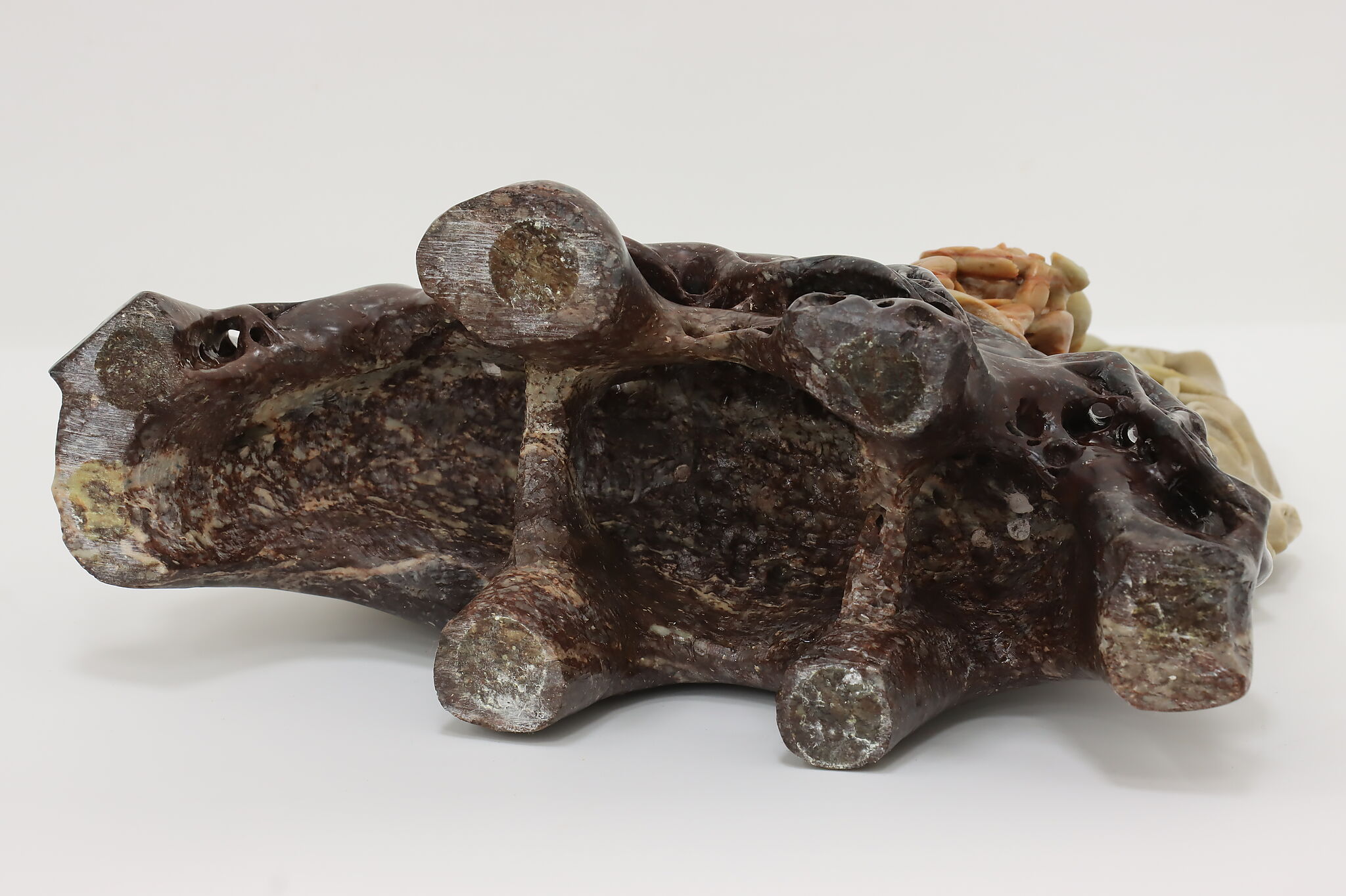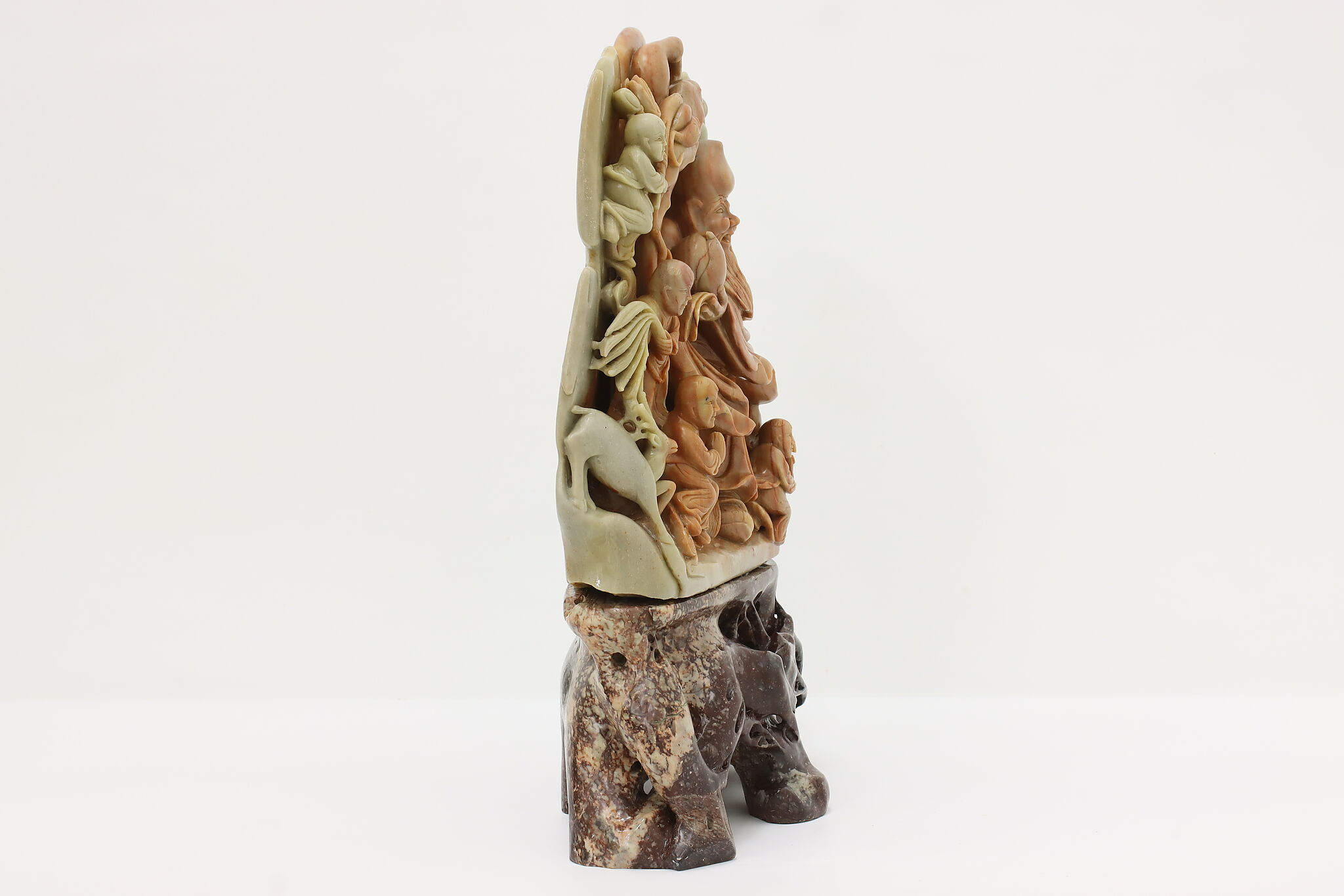 This sculpture of the Chinese god of longevity, Shou Lao, is gorgeously hand carved of soapstone with children, immortality symbol of peaches and a dragon staff.