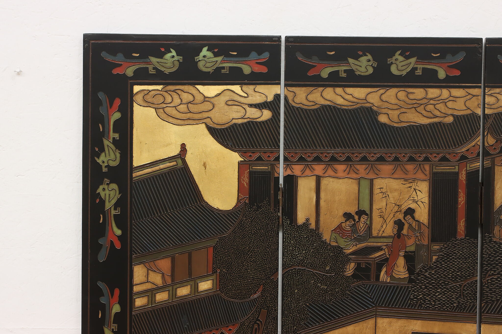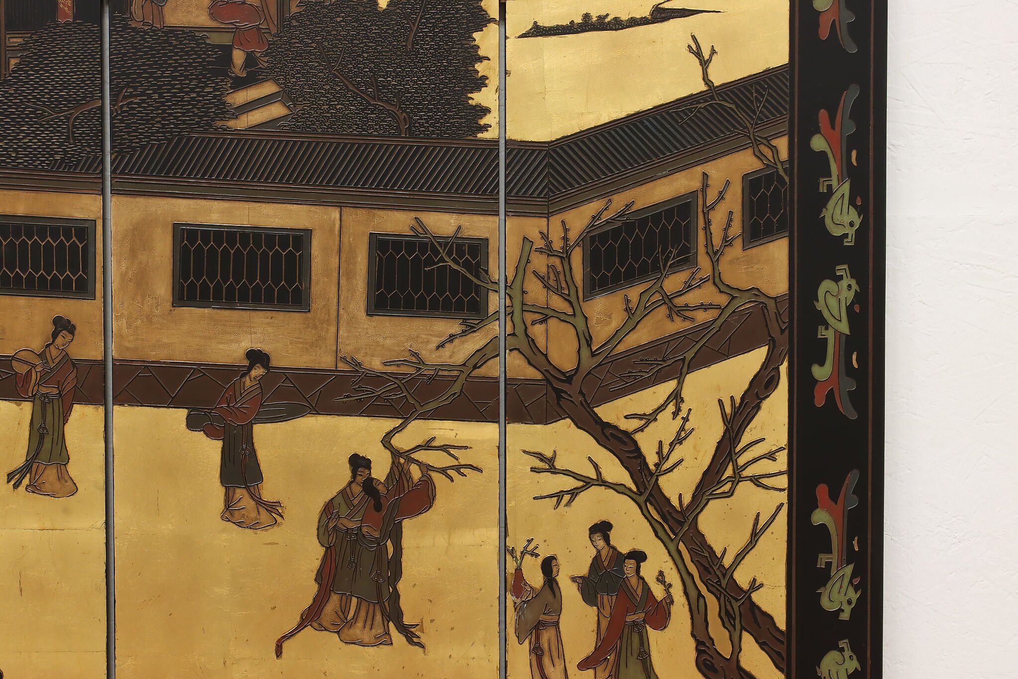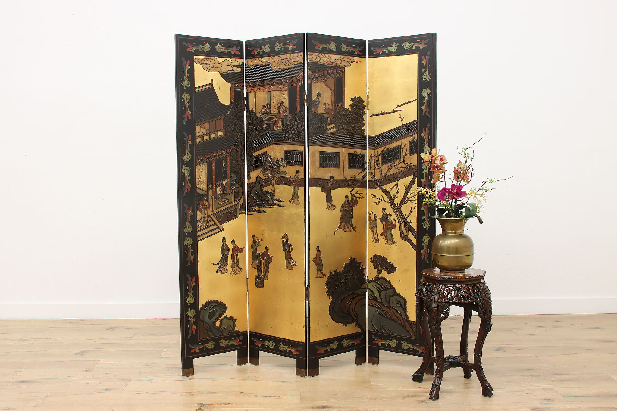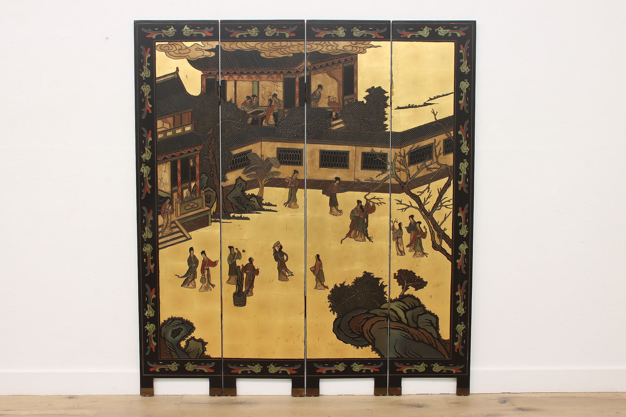 This traditional room divider folding screen has beautifully hand carved scenes of a temple courtyard with royal women and garden scenes on the reverse.