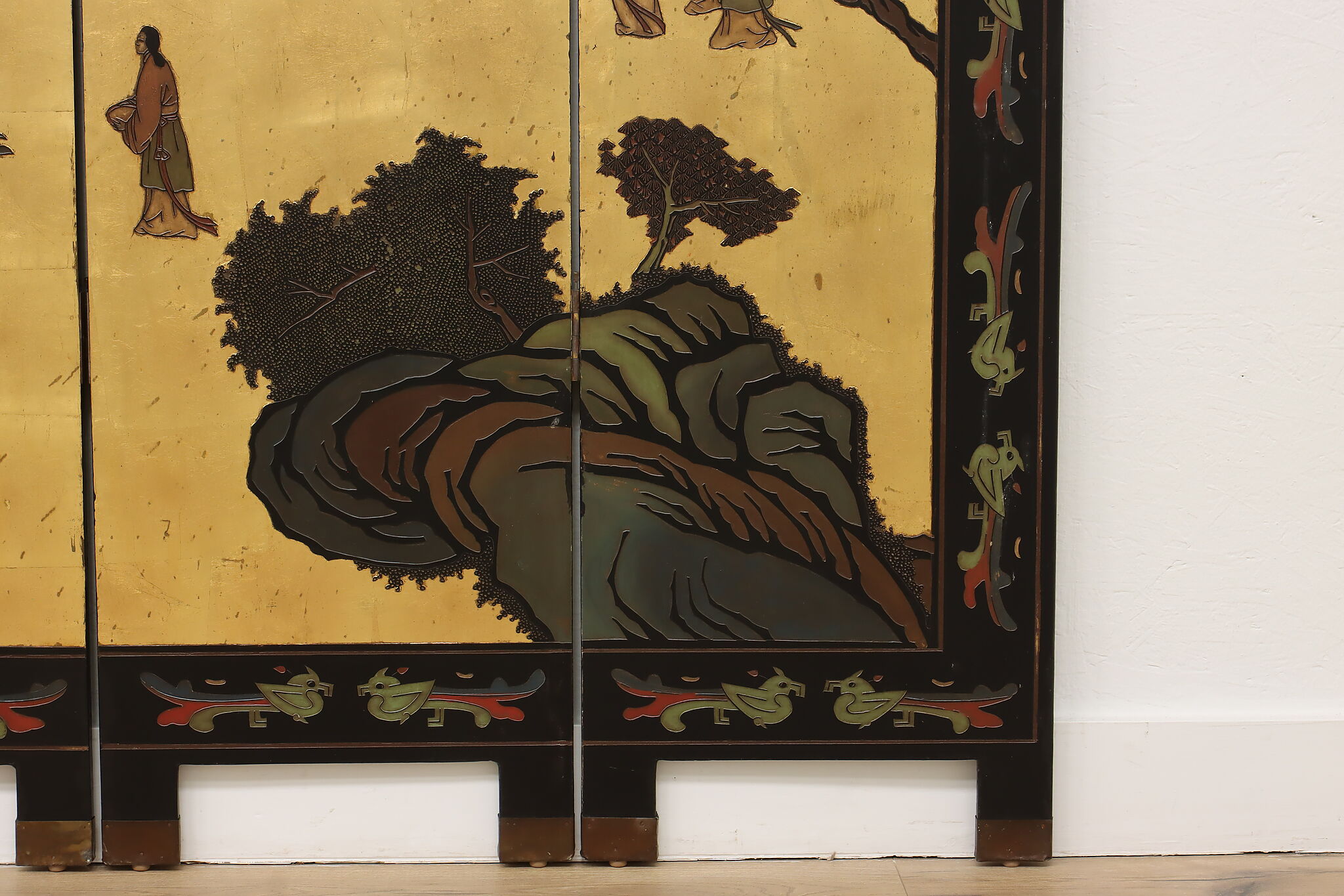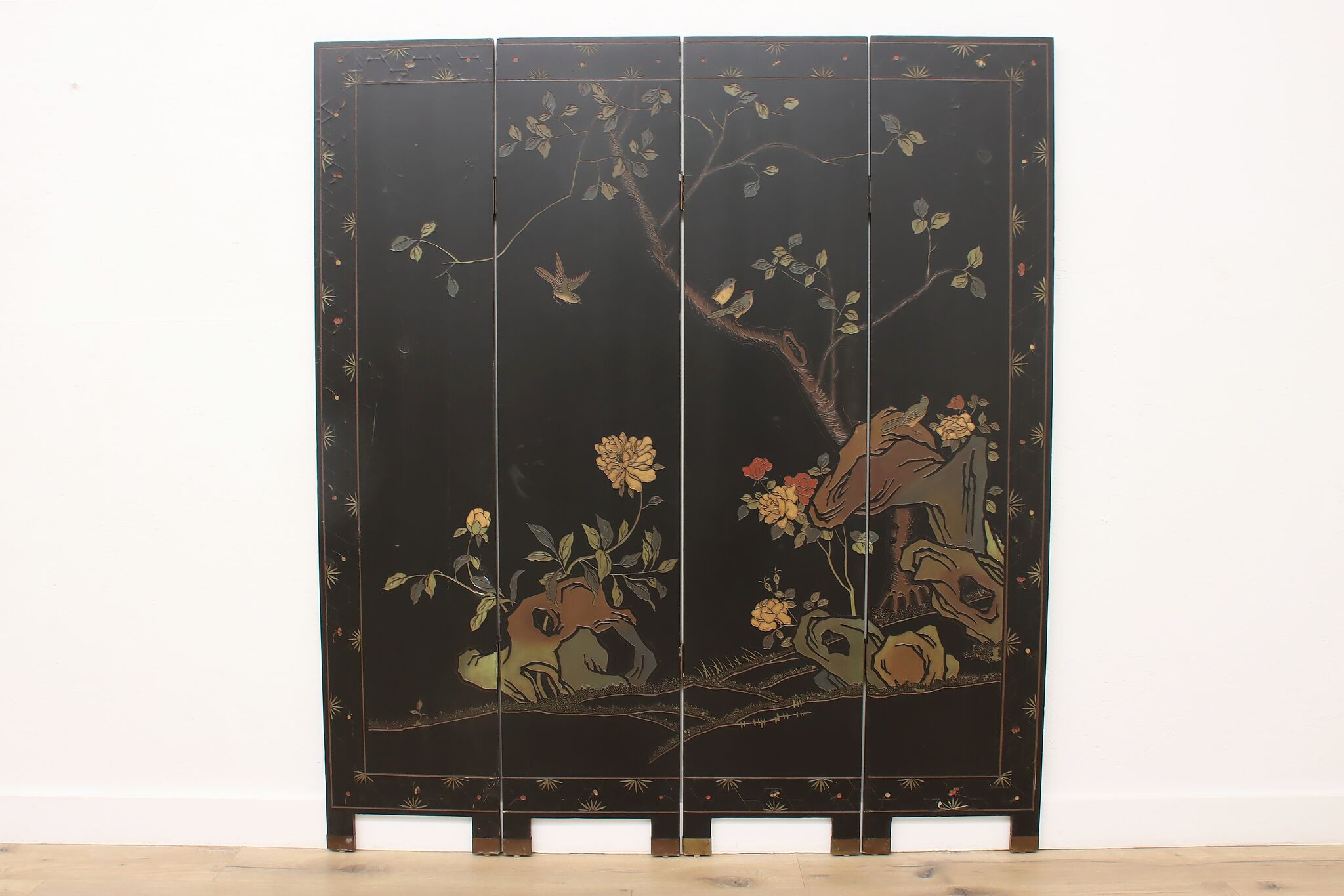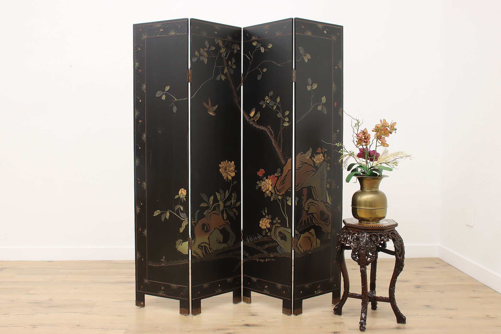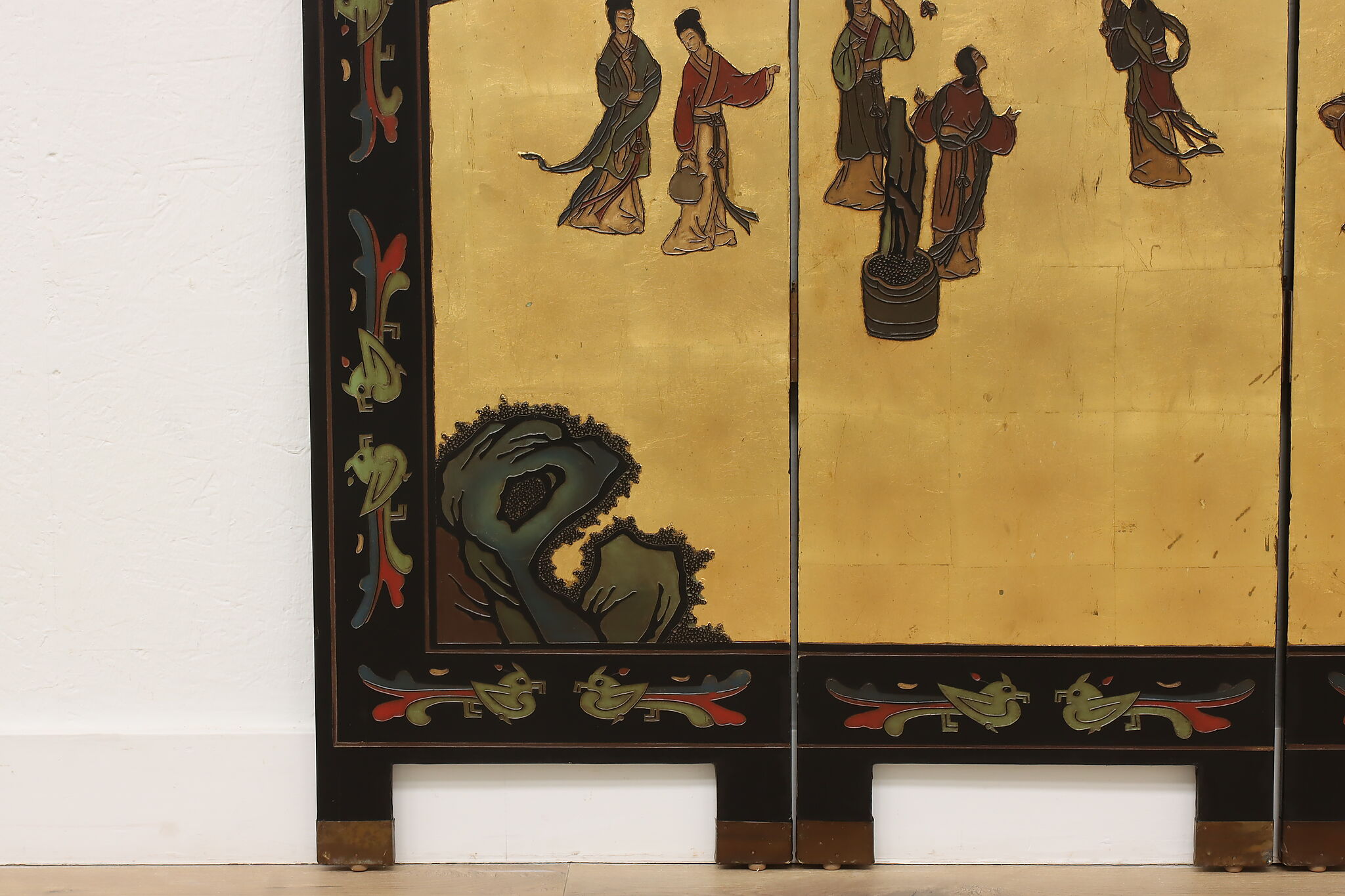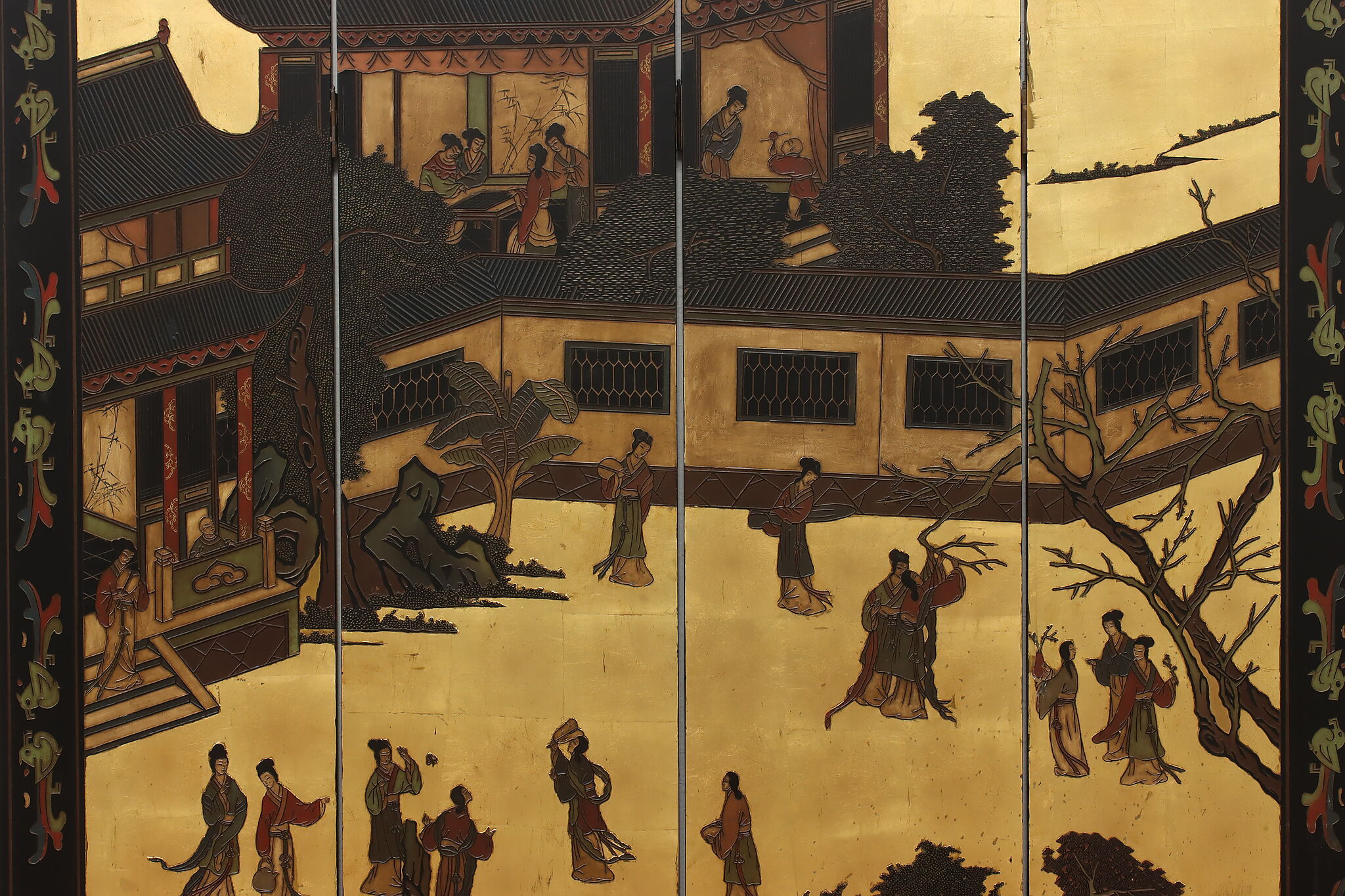 This traditional room divider folding screen has beautifully hand carved scenes of a temple courtyard with royal women and garden scenes on the reverse.