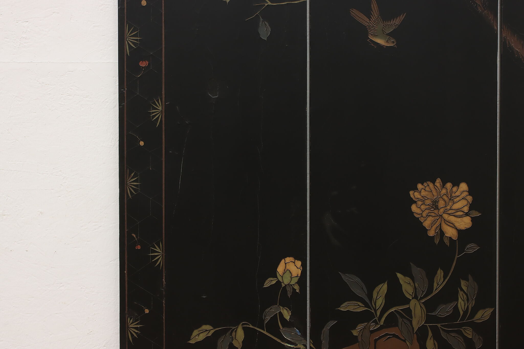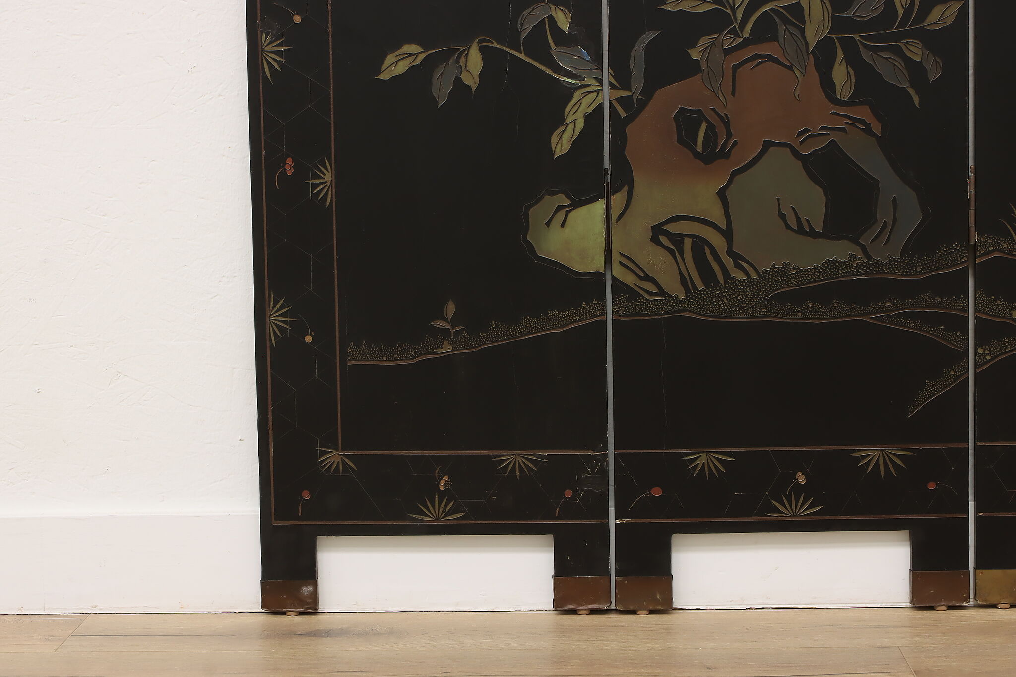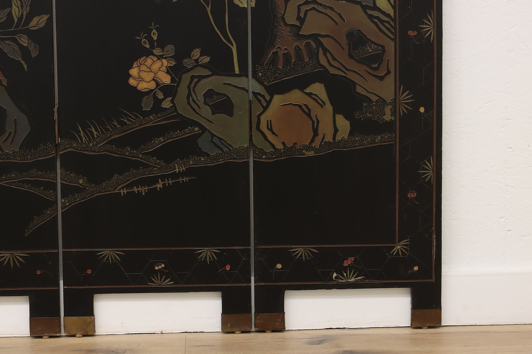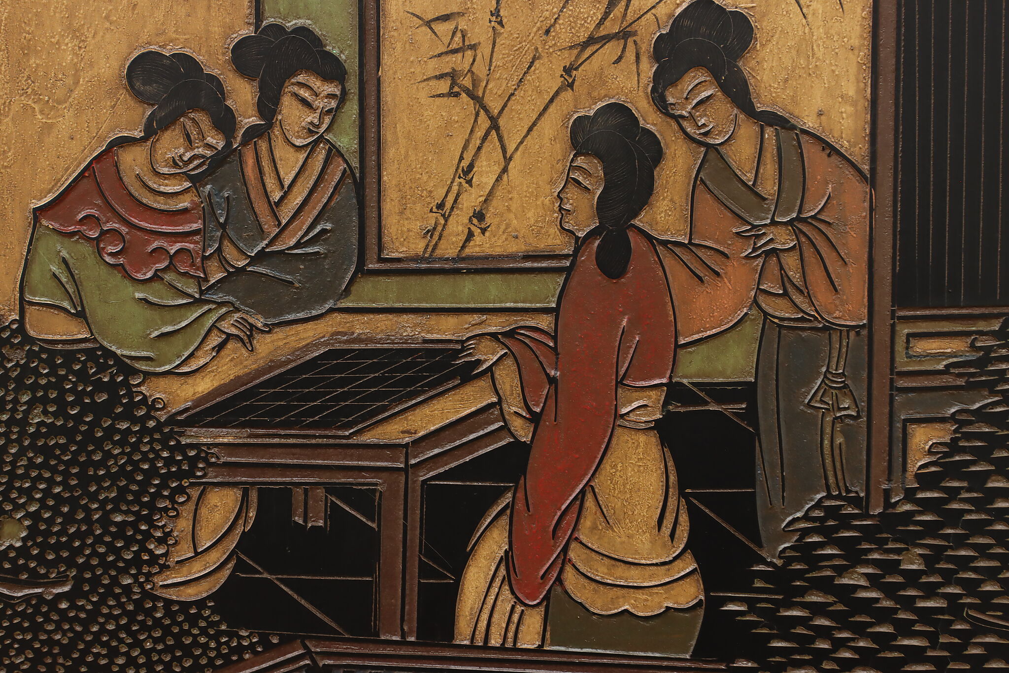 This traditional room divider folding screen has beautifully hand carved scenes of a temple courtyard with royal women and garden scenes on the reverse.